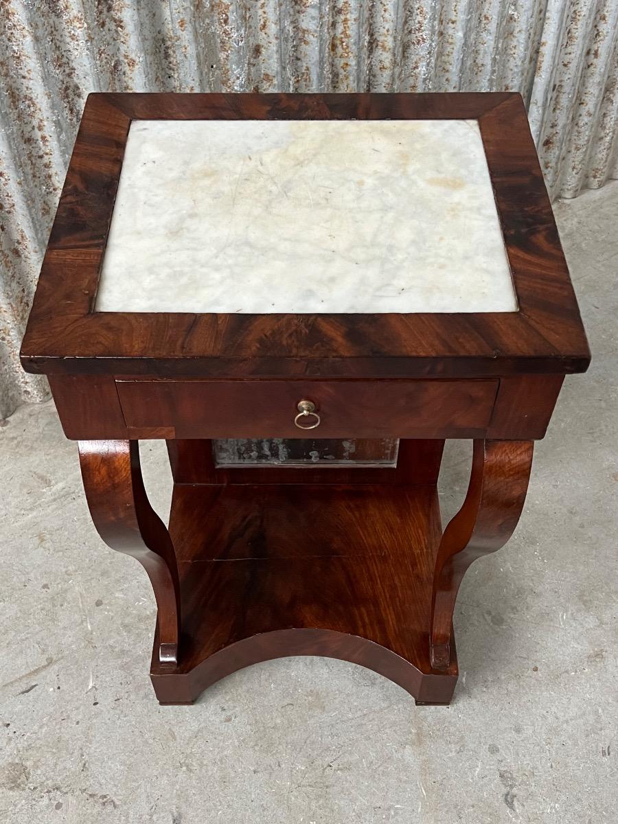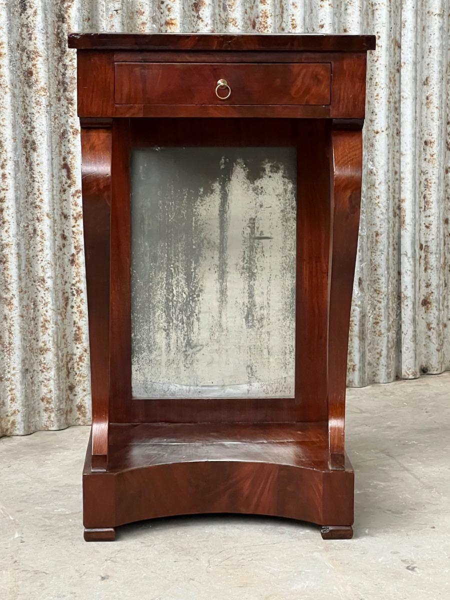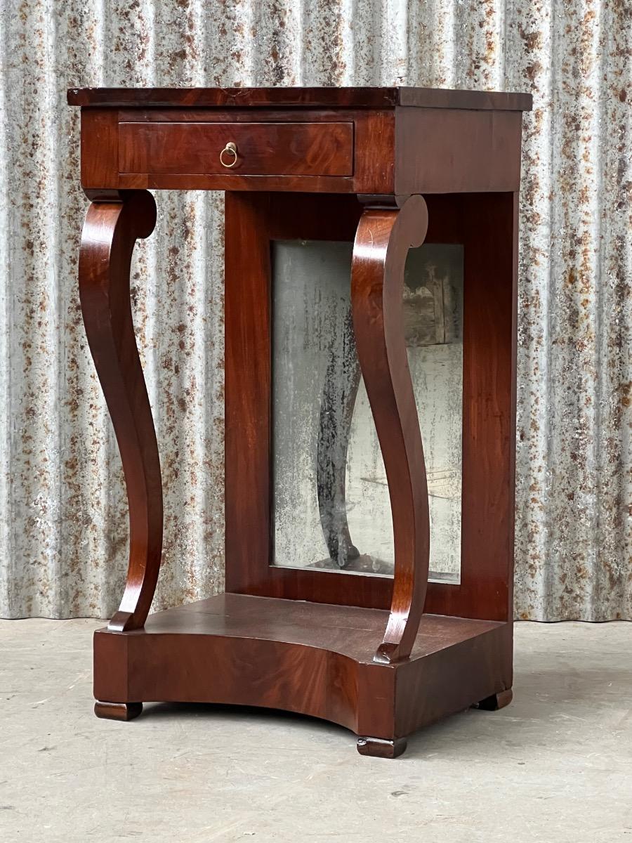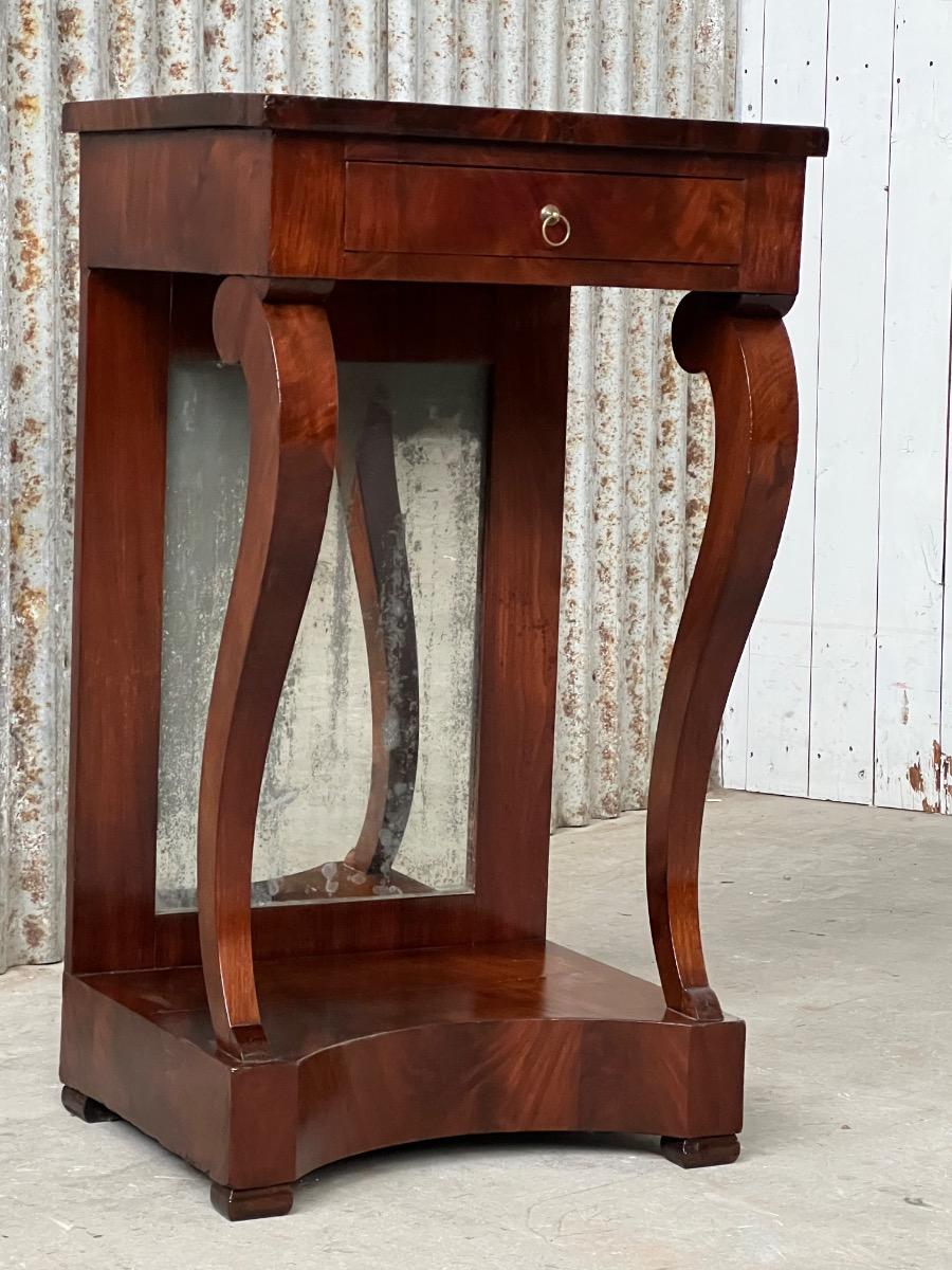 Fraai gespiegeld bloem mahonie op bovenblad en onderstel. Zeer fraaie politoer met was patina.