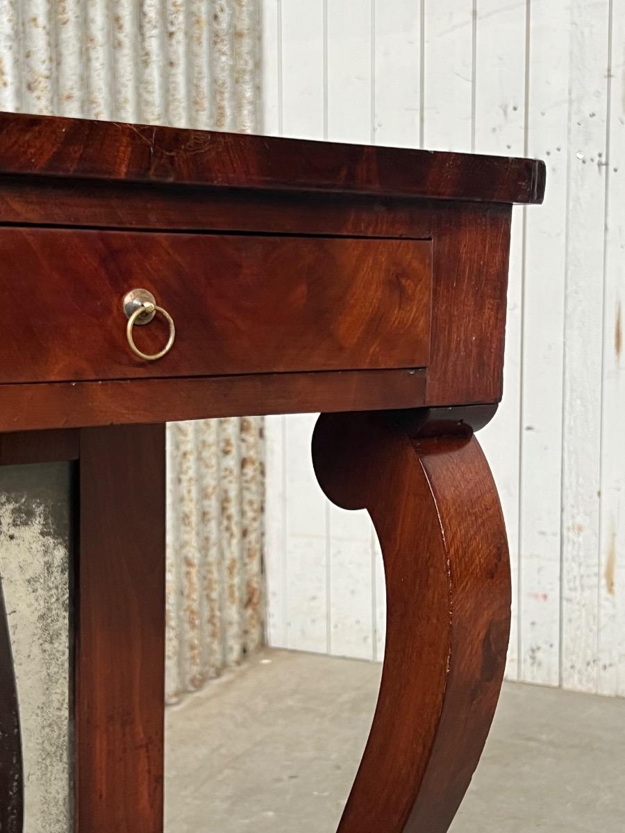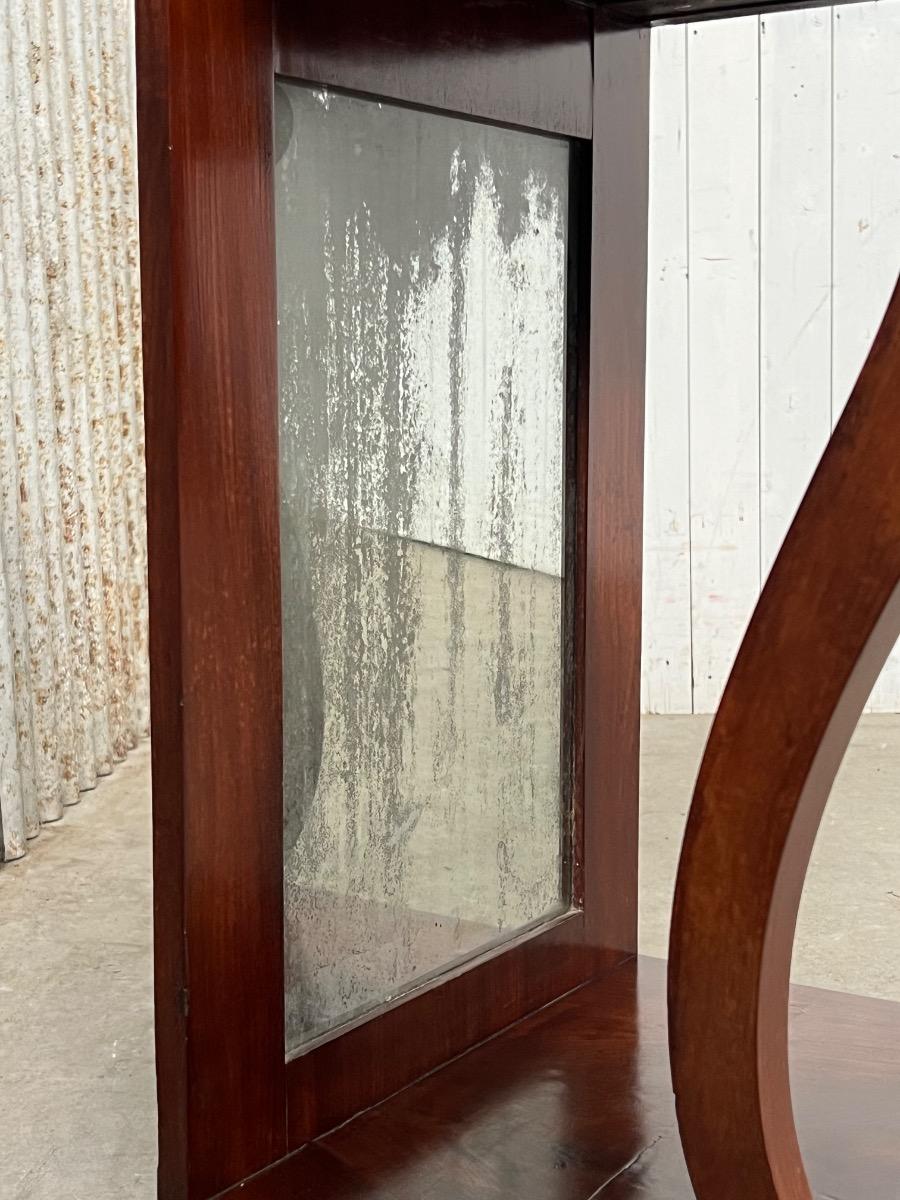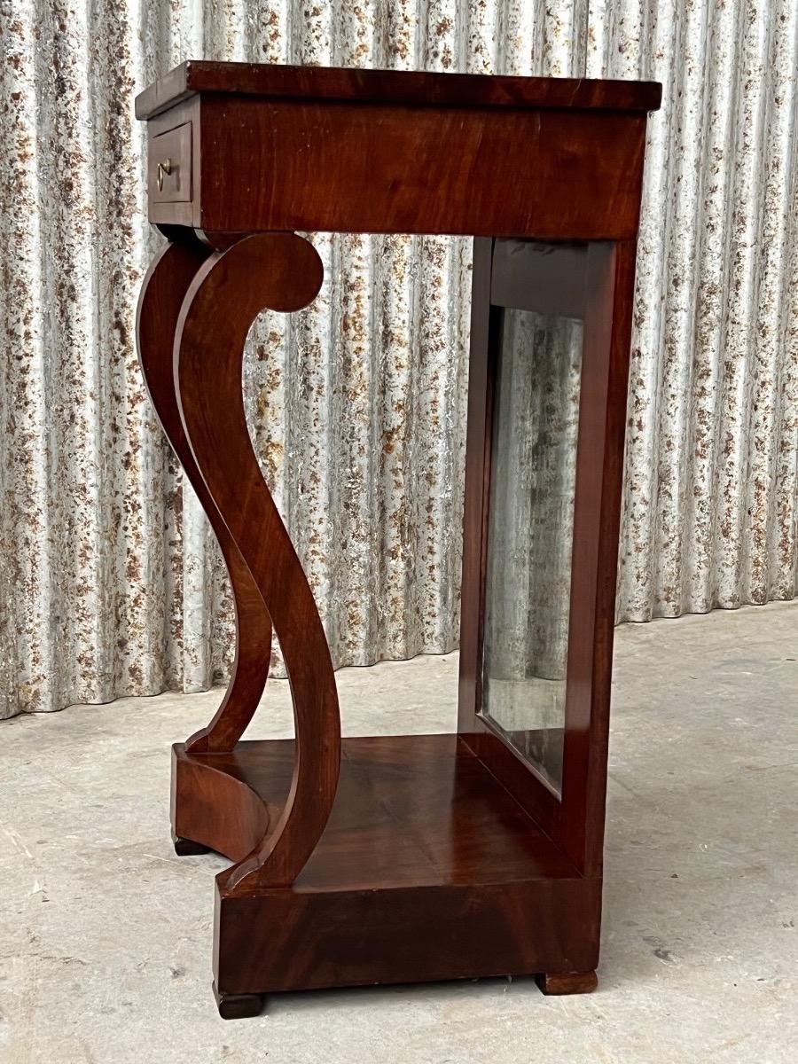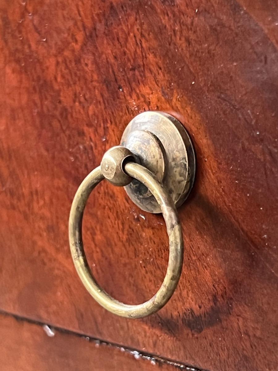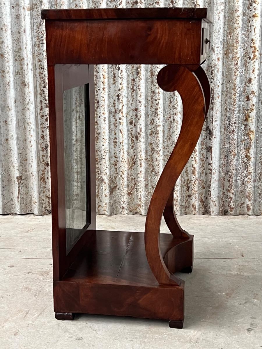 Fraai gespiegeld bloem mahonie op bovenblad en onderstel. Zeer fraaie politoer met was patina.