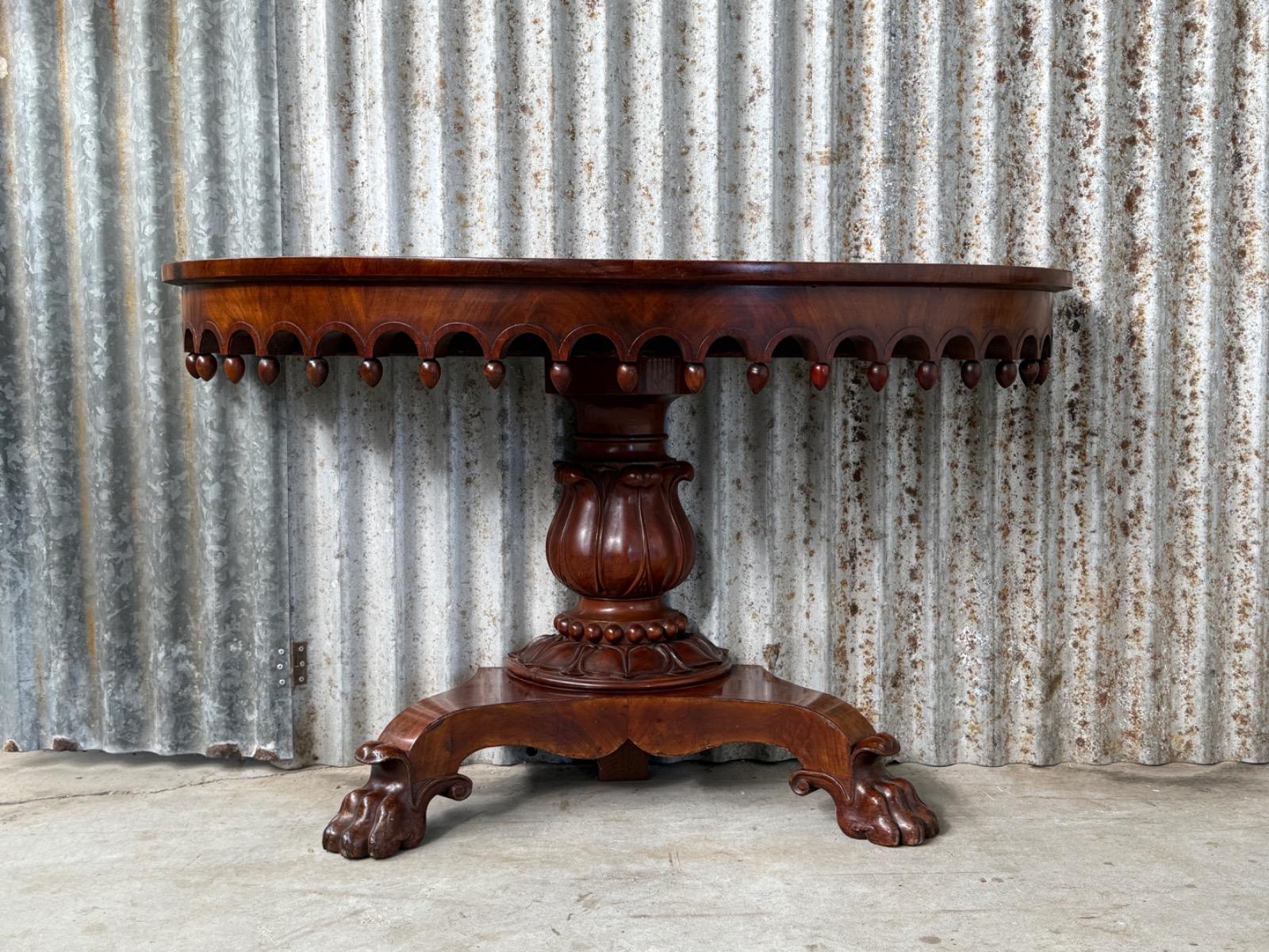 Set van 2 mahonie console tafels, vroeg 19de eeuw, houtgestoken ‘Coupe’ vormige kolom op tweespant gedragen door twee klauw poten, fraai bloem mahonie geprofileerde manchet met spitsboogjes en druppelvormige pinakels.