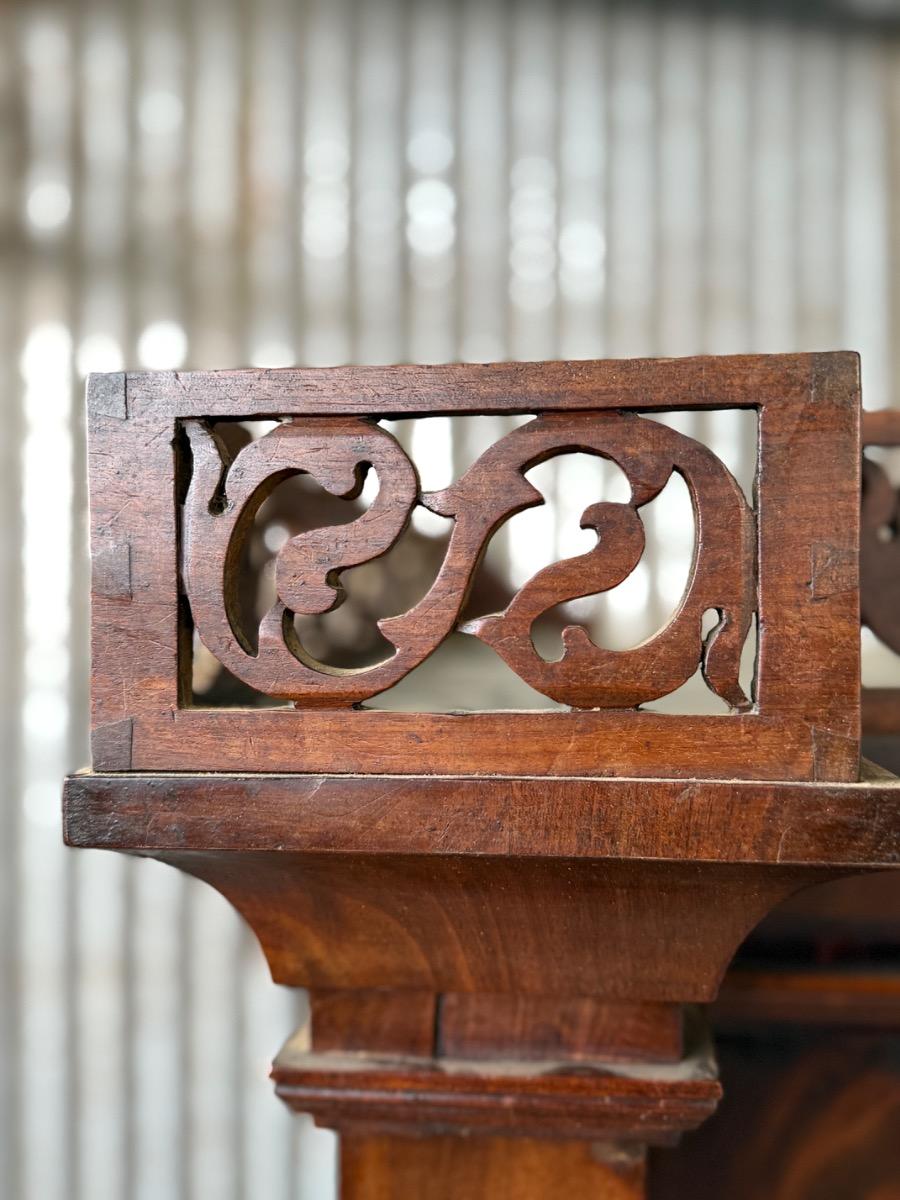 Bloem mahonie op eikenhout gefineerd, achterwand oorspronkelijk en compleet. Drie brede laden in de onderkast geflankeerd door twee volle vierkantige pilaren.