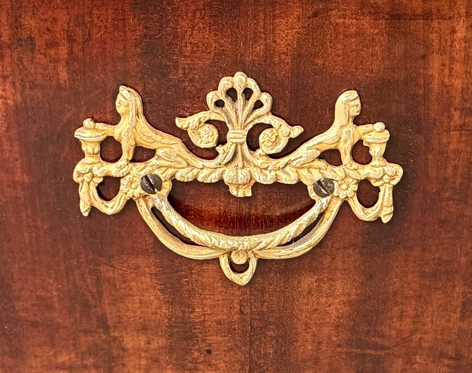 Gegoten en verguld messing beslag op de laden, klep en deurtje. Sloten en sleutels (2) werkend.