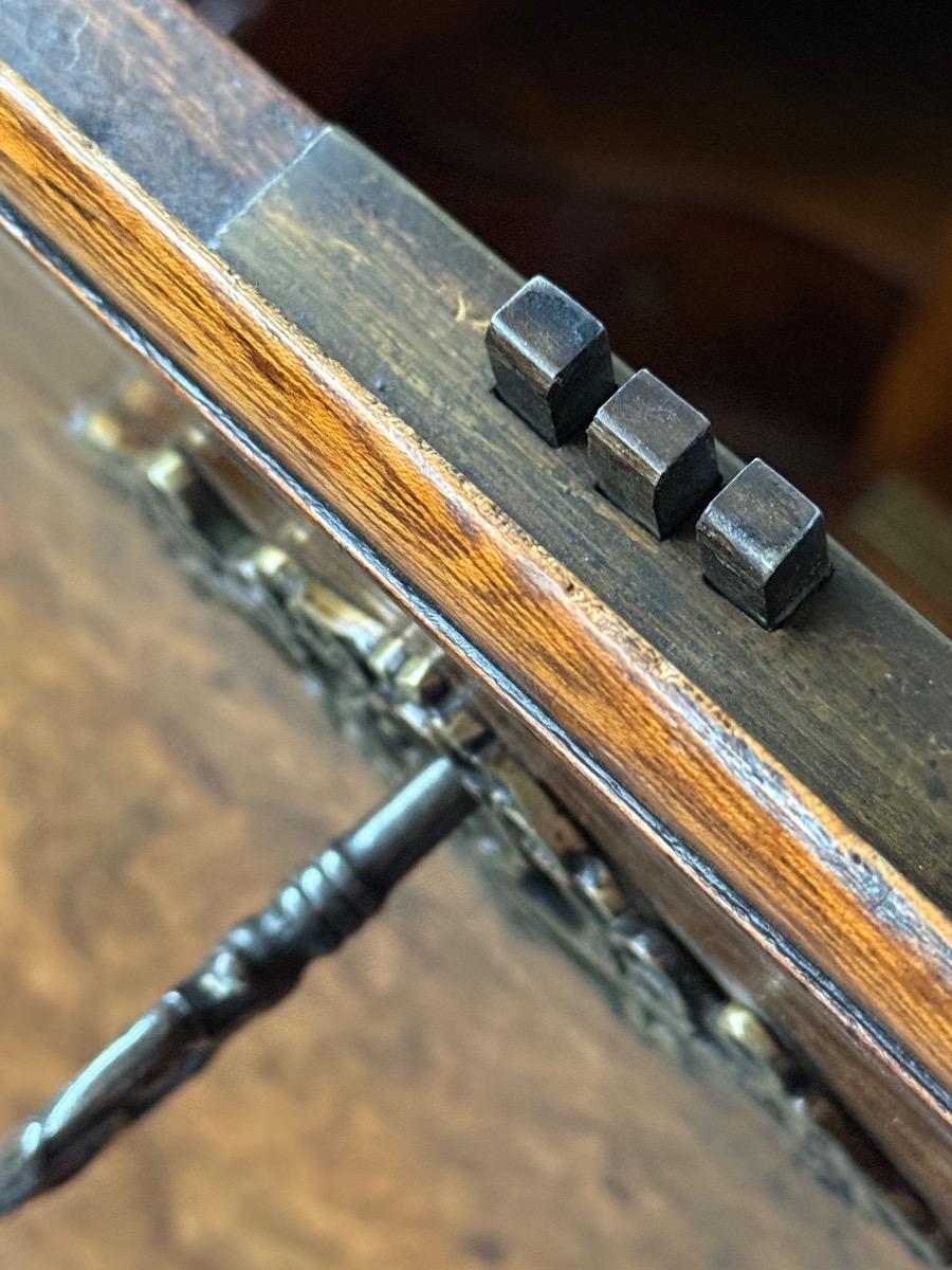 Smal of klein Hollands wortelnoten klepbureau, midden 18e eeuw. Met ‘S’ vorm klep, gegoten messing beslag, knopjes en scharnieren. Op "bol-klauw poten".