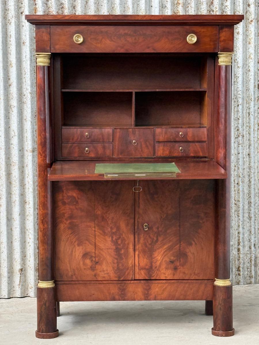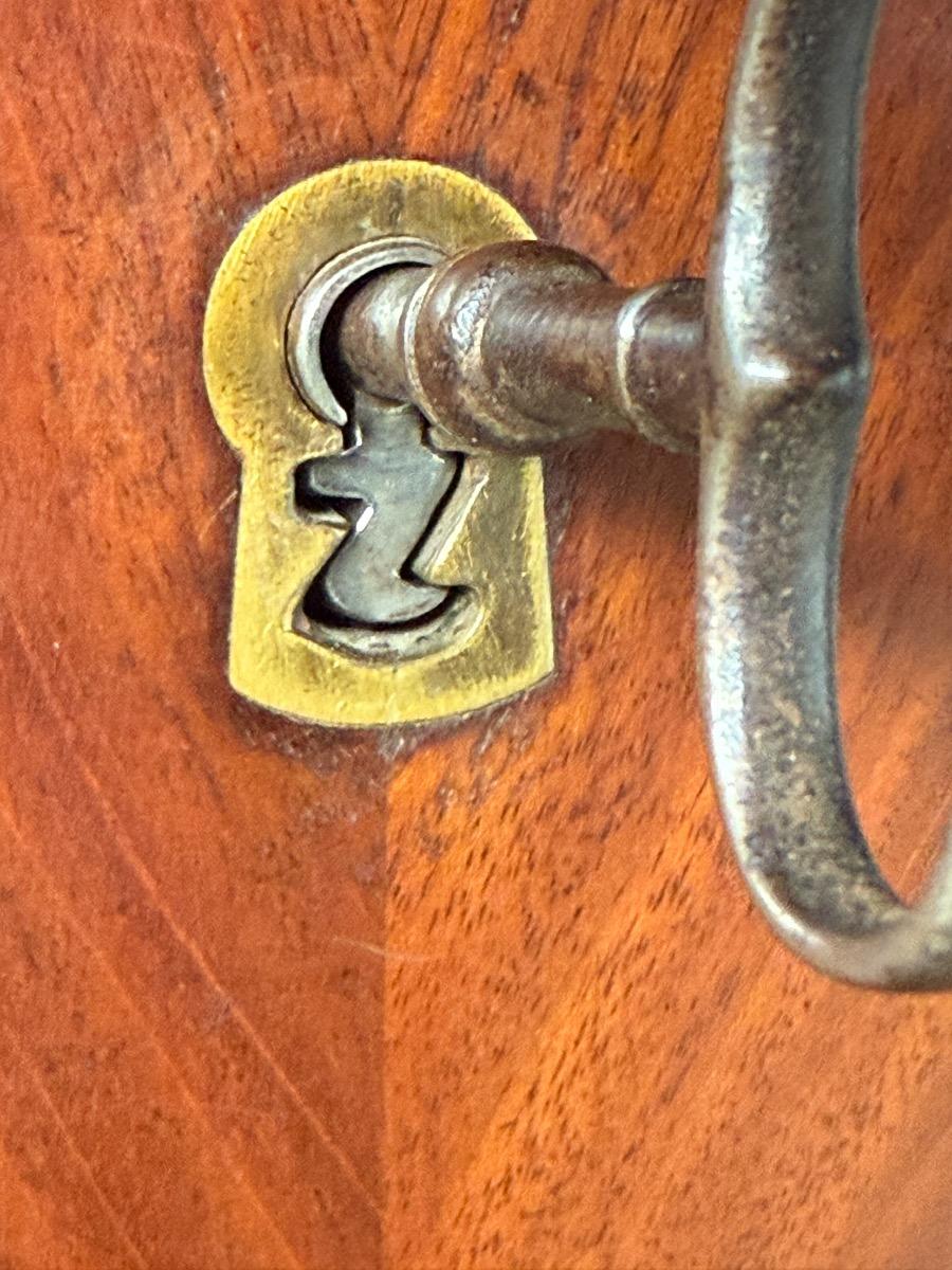 Overstekende kap lade met rond deels verguld beslag. Flinke klep, ingelegd met groen kalfsleder, voorzien van oorspronkelijk slot èn werkende sleutel
