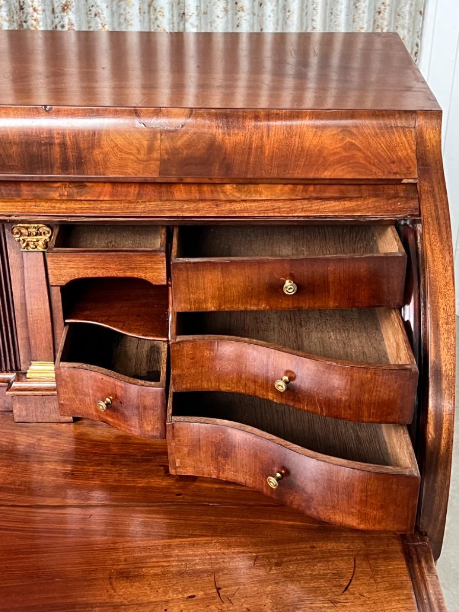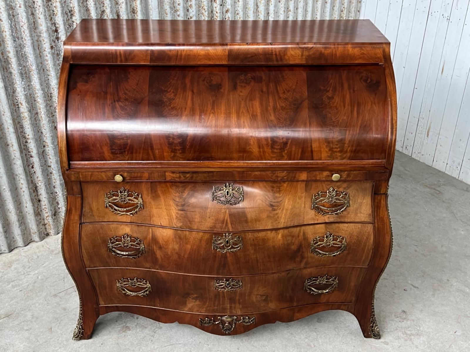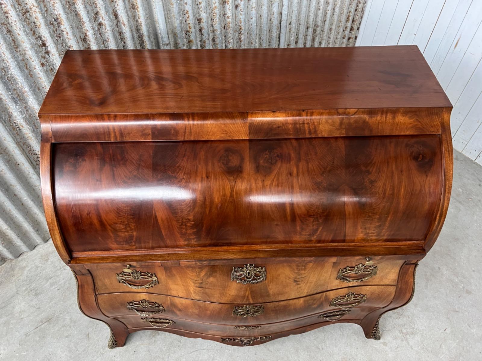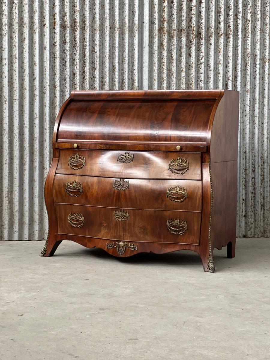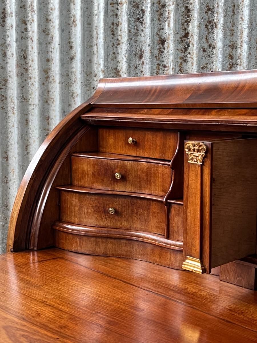 Transition gebombeerd cilinder bureau, fraai boek bloemmahonie gefineerd.