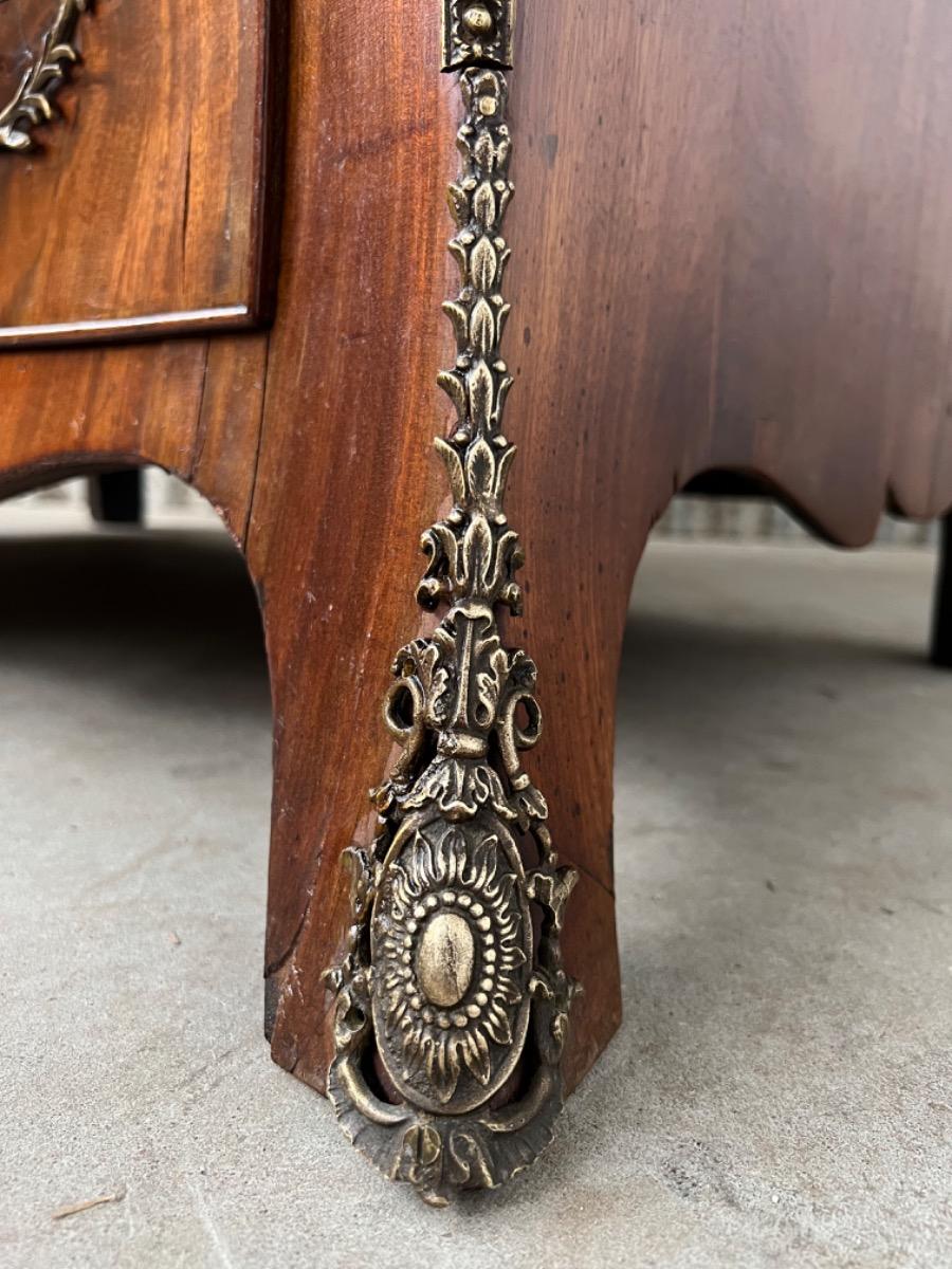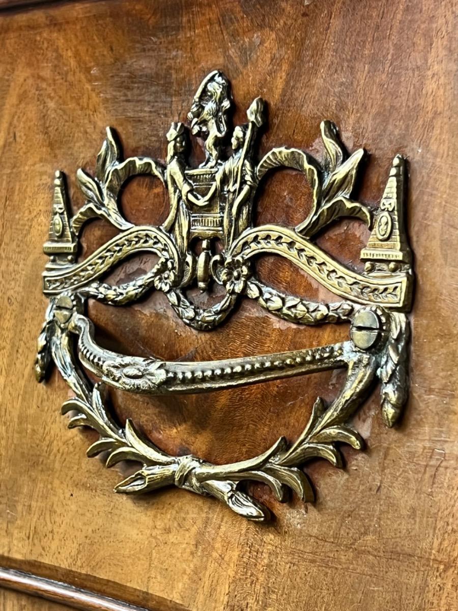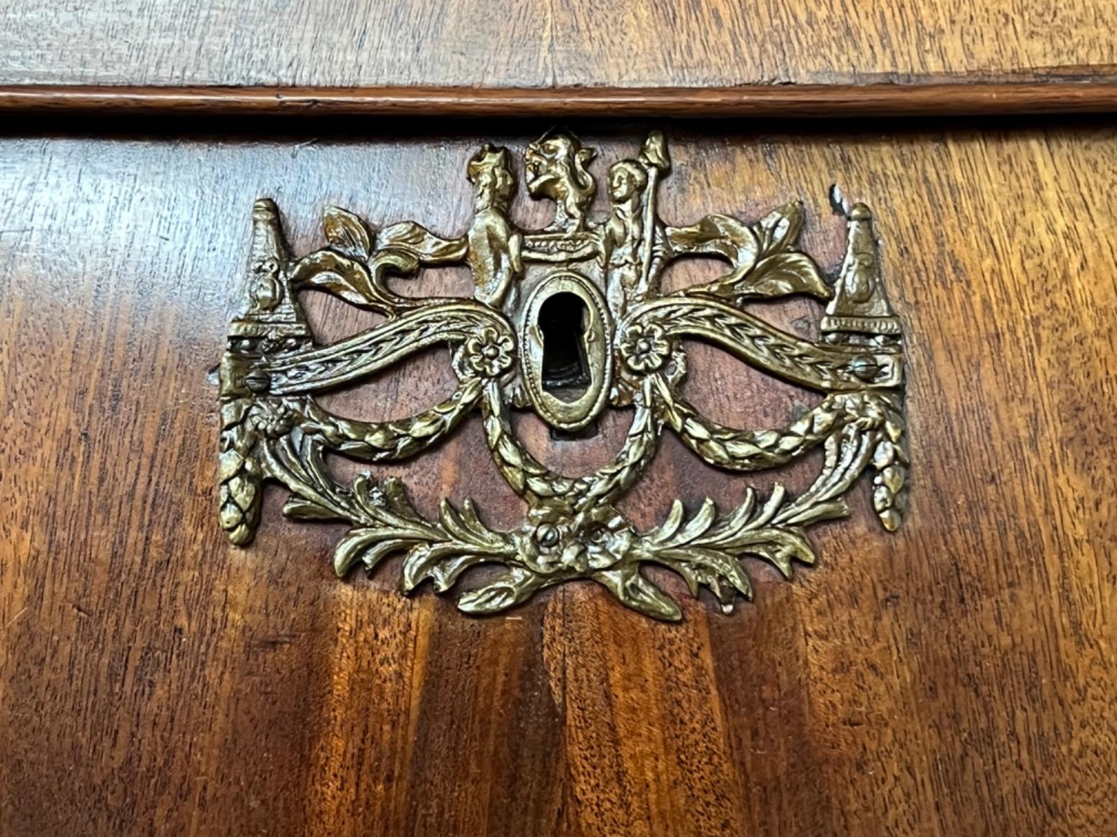 Ornament op schort, sjabots op de poten met verguld messing bandwerk.
