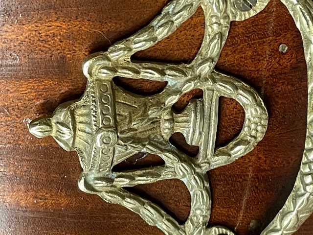 Ornament op schort, sjabots op de poten met verguld messing bandwerk.