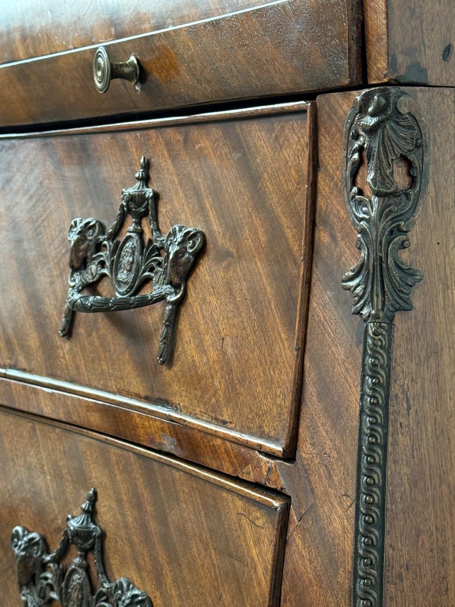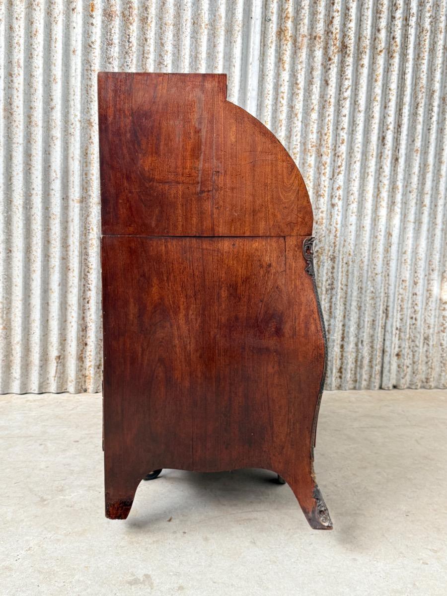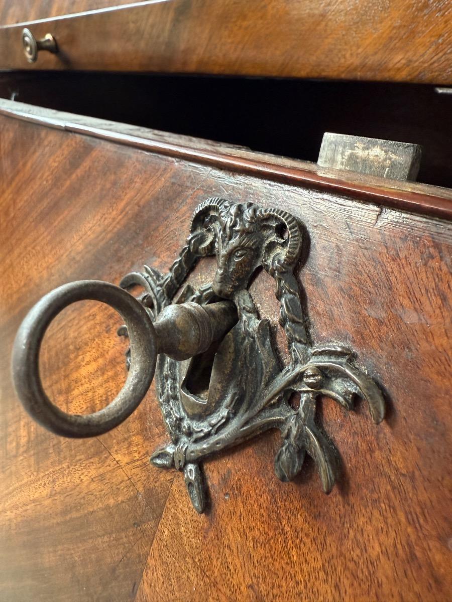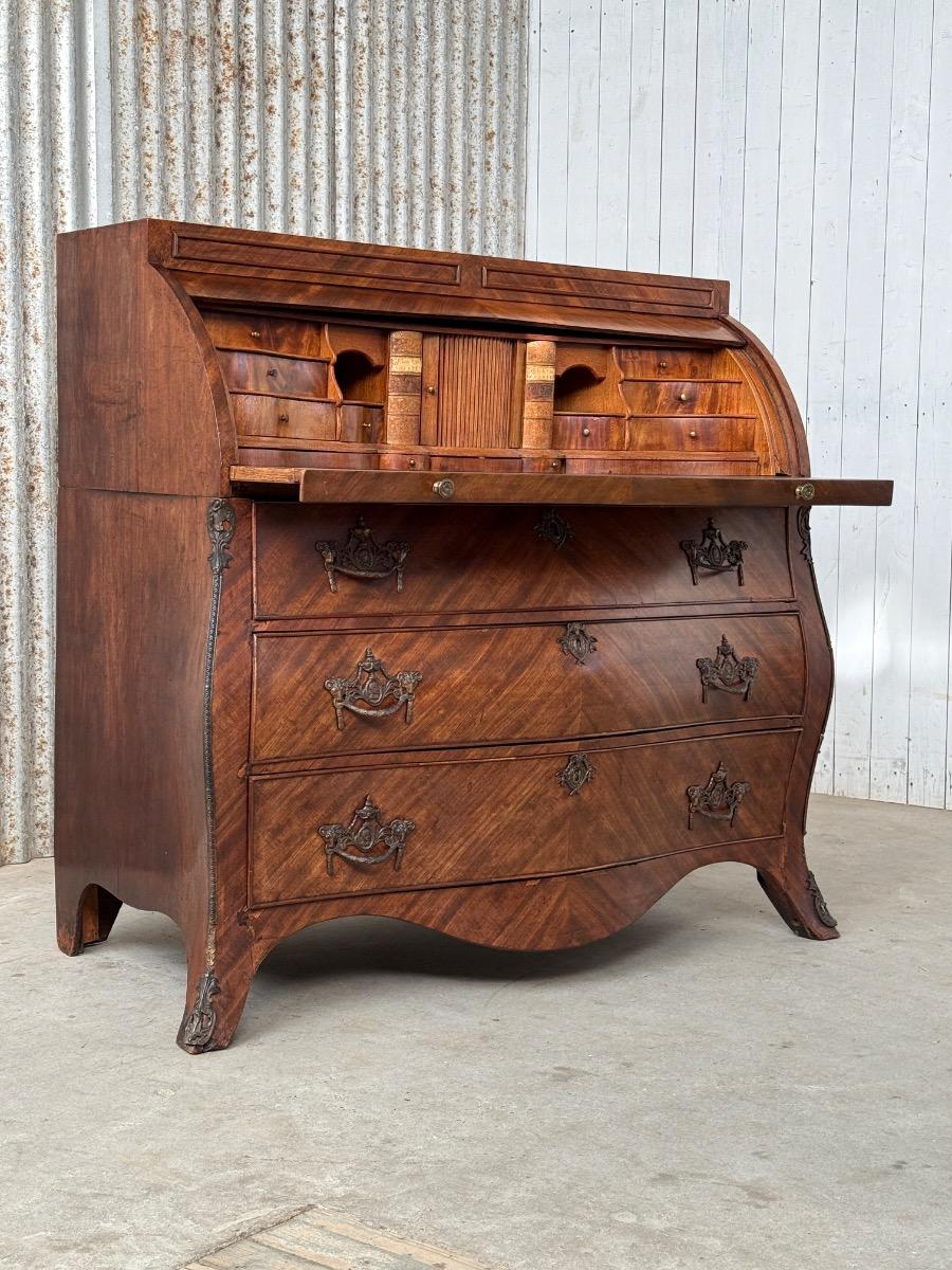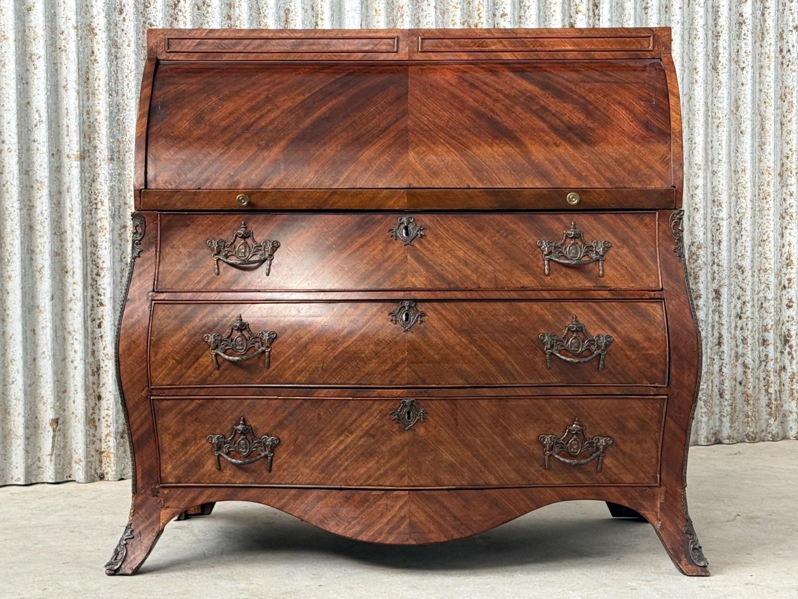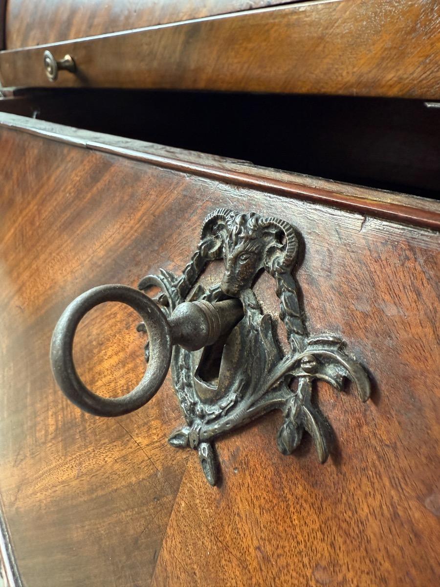 Transition gebombeerd cilinder bureau, fraai visgraad mahonie gefineerd. Het interieur vol met laden, Jalousie deurtje met verborgen laden. En werkend oorspronkelijk slot met sleutel. Vuurverguld oorspronkelijk gegoten messing trek beslag. Ornament op schort ook oorspronkelijk Nederland Ca. 1760 - 1780 Afm: H= 112 cm. B= 113-121 cm. (Min. - Max. meten) D= 54-58 cm. (73 cm. met uitgetrokken blad) Onlangs grondig nagelopen op losse delen van constructie en fineer. Houtworm controle; Geen actieve houtworm aangetroffen op 6/1/2026 Cil-3023~