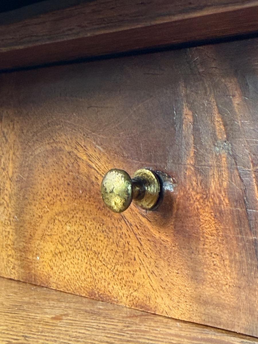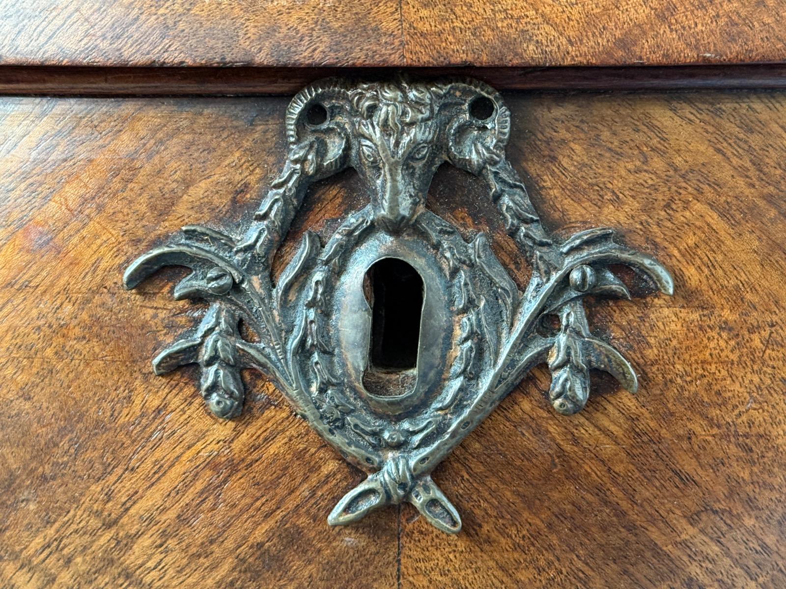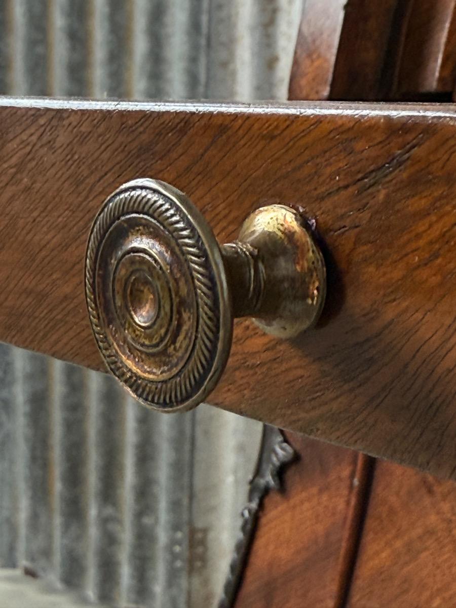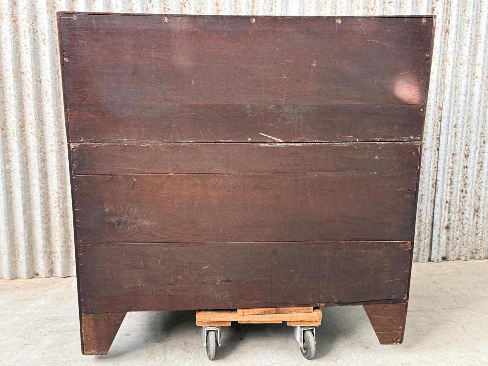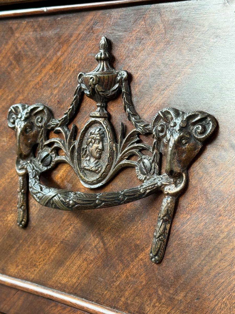 Transition gebombeerd cilinder bureau, fraai visgraad mahonie gefineerd. Het interieur vol met laden, Jalousie deurtje met verborgen laden. En werkend oorspronkelijk slot met sleutel. Vuurverguld oorspronkelijk gegoten messing trek beslag. Ornament op schort ook oorspronkelijk Nederland Ca. 1760 - 1780 Afm: H= 112 cm. B= 113-121 cm. (Min. - Max. meten) D= 54-58 cm. (73 cm. met uitgetrokken blad) Onlangs grondig nagelopen op losse delen van constructie en fineer. Houtworm controle; Geen actieve houtworm aangetroffen op 6/1/2026 Cil-3023~