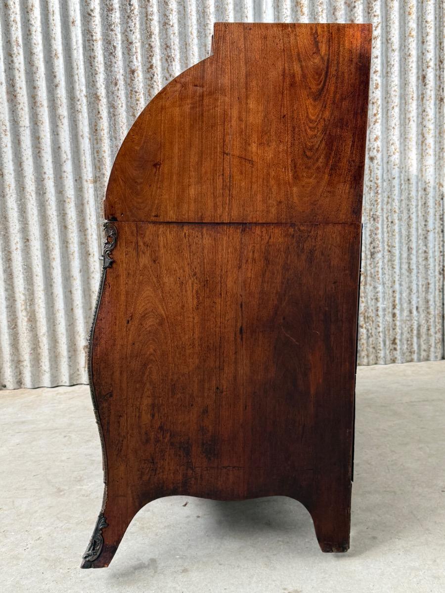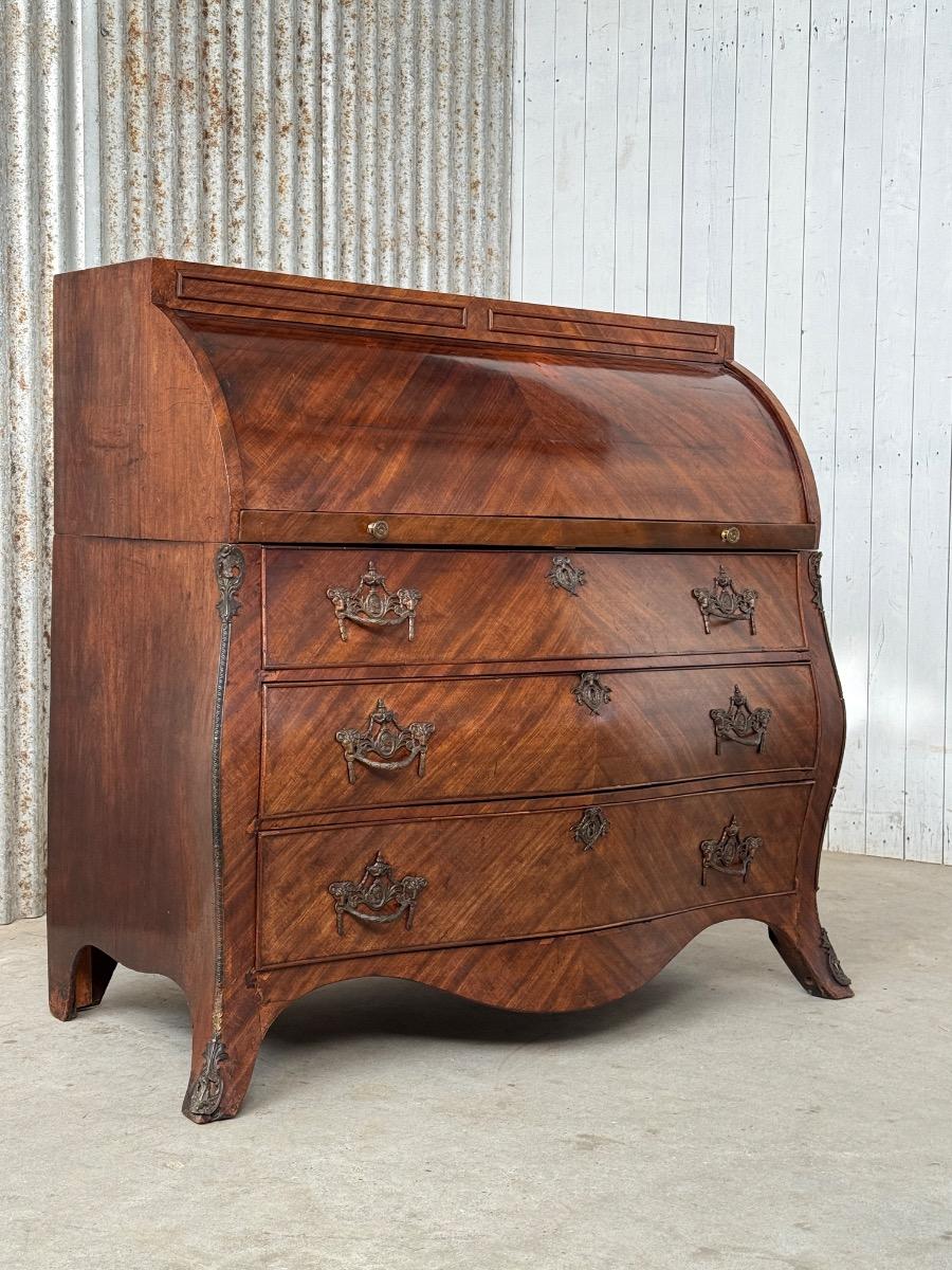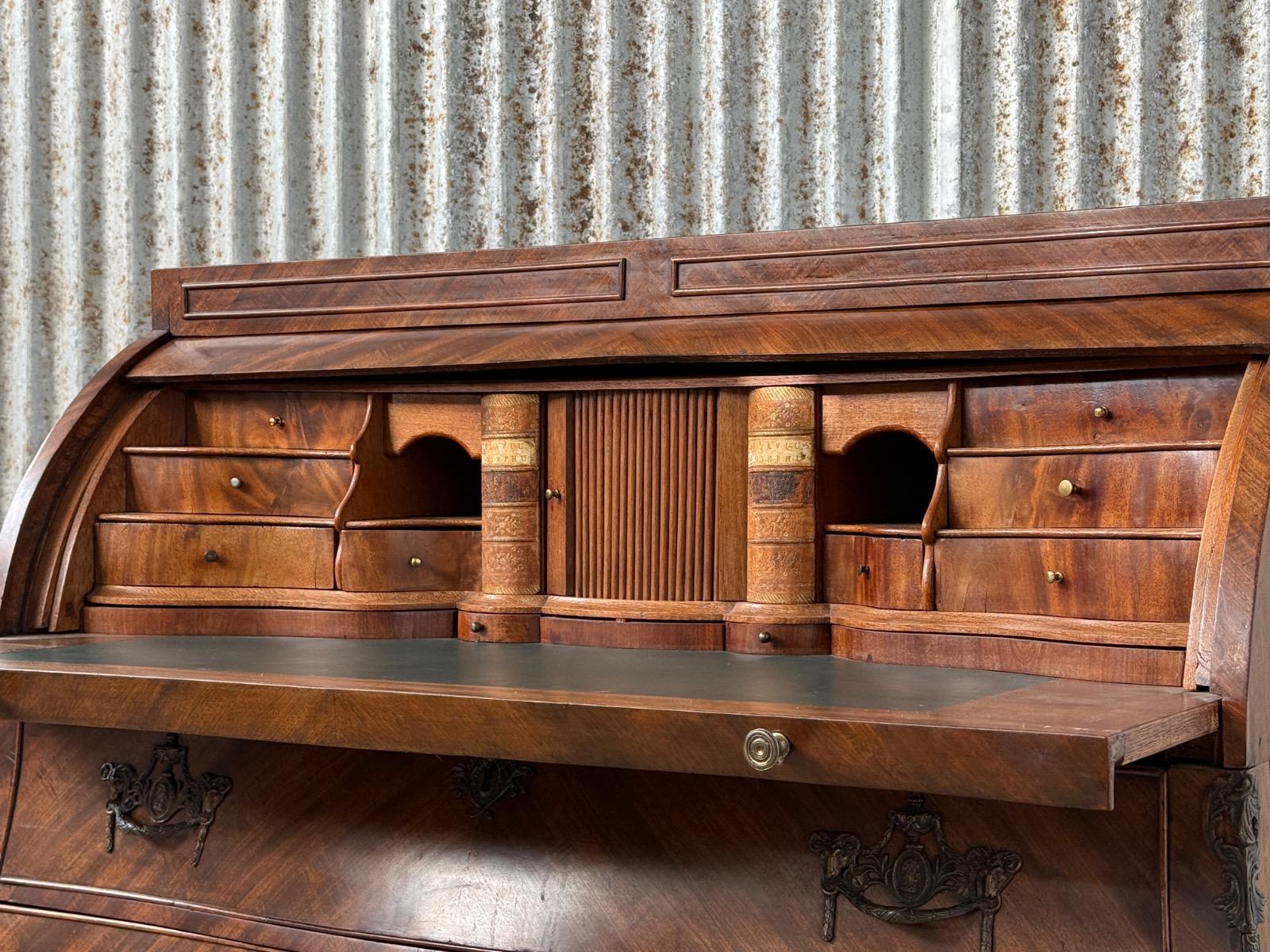 Transition gebombeerd cilinder bureau, fraai visgraad mahonie gefineerd.