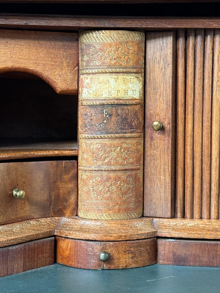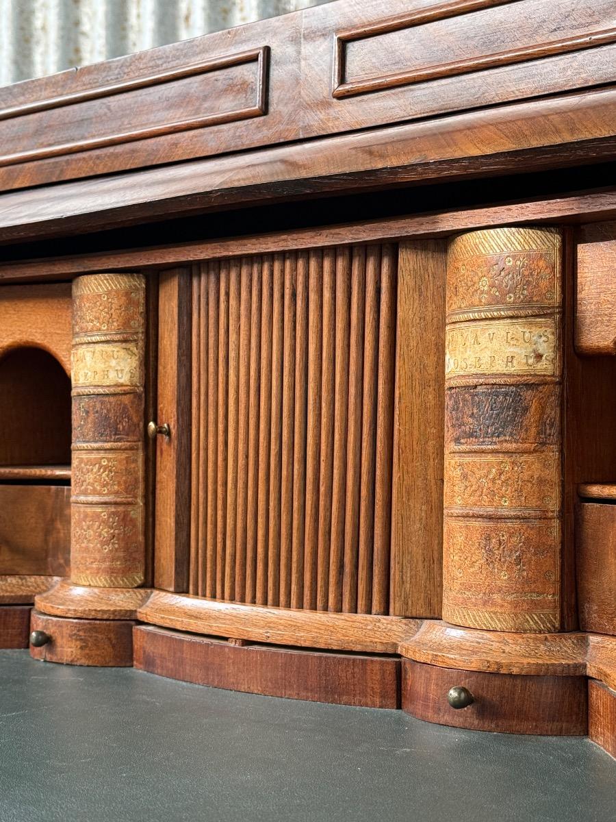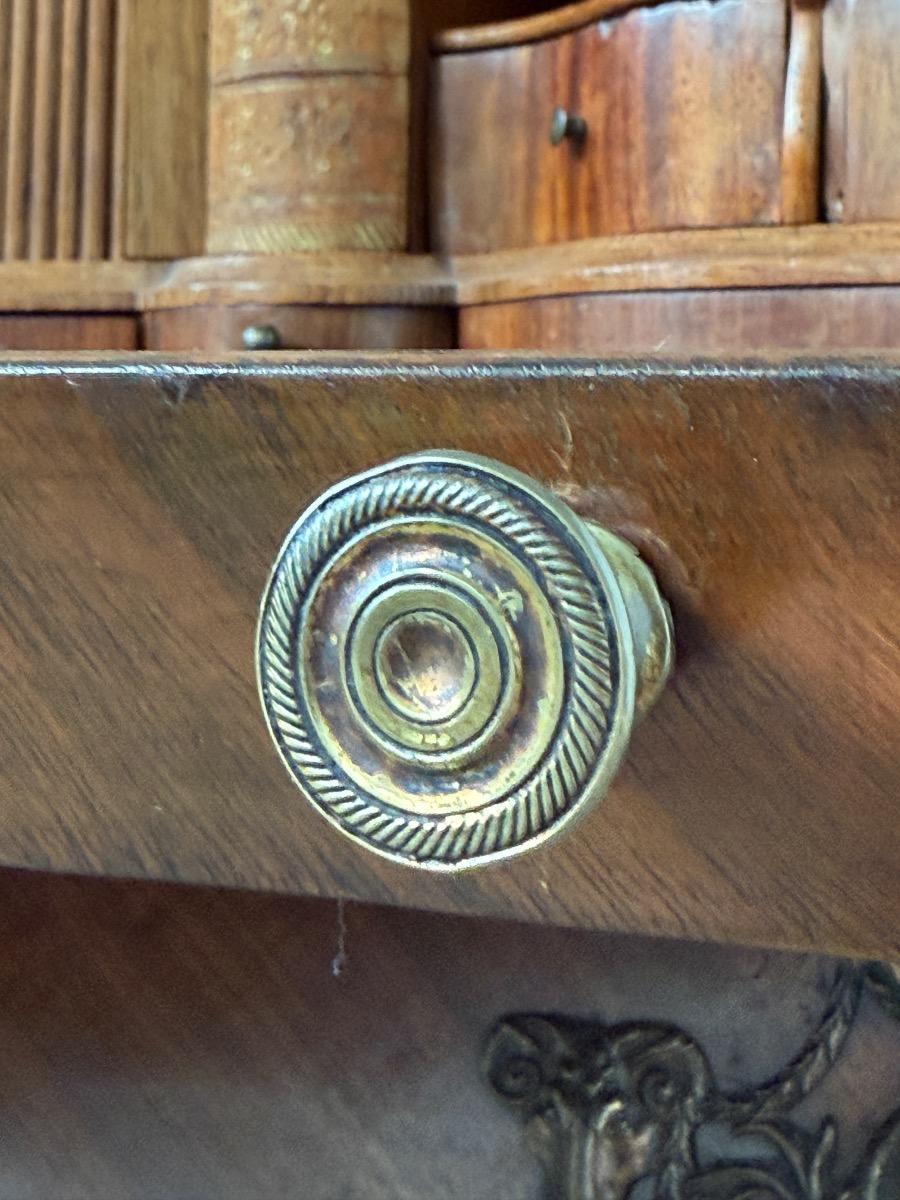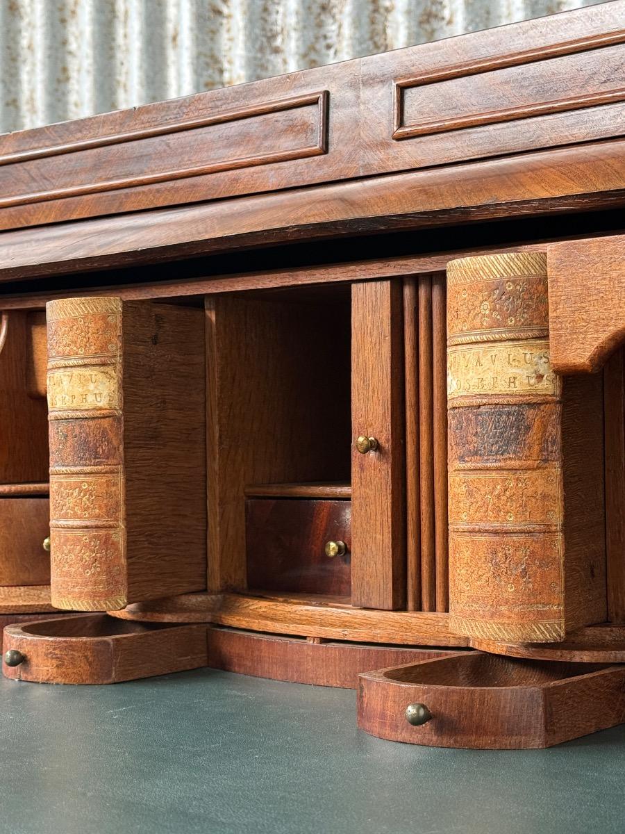 Transition gebombeerd cilinder bureau, fraai visgraad mahonie gefineerd.