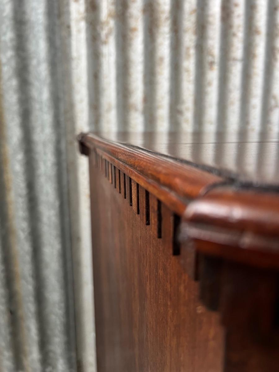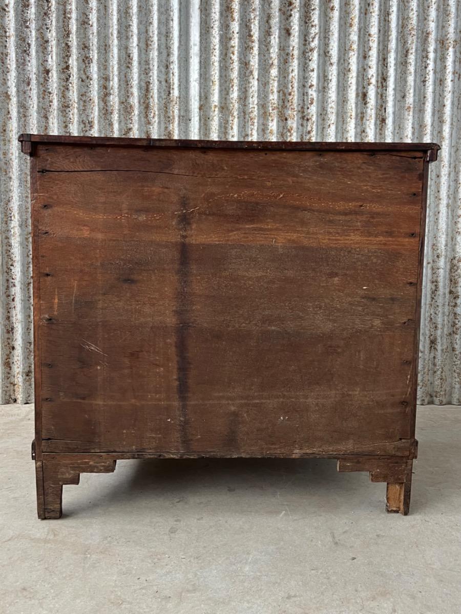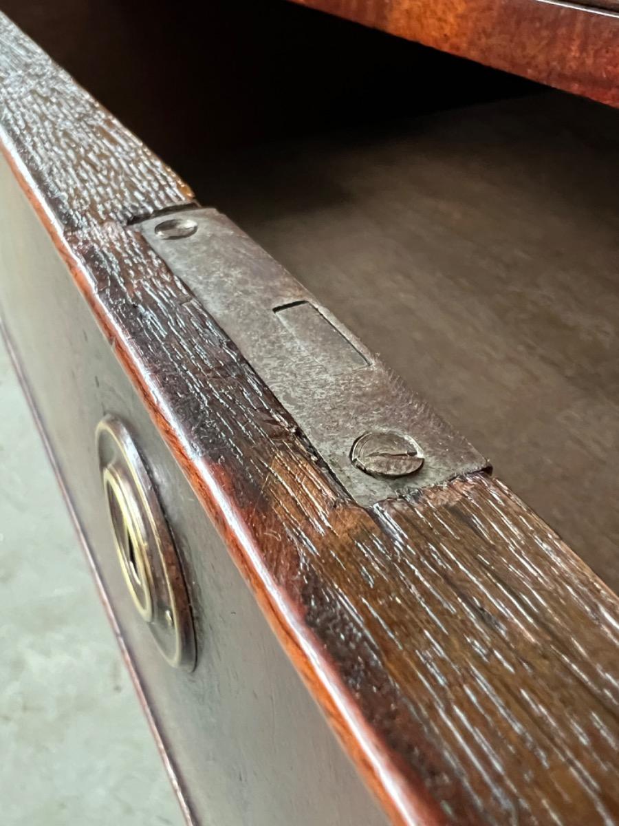 Vier laden met sloten, van eiken hout vervaardigd, mahonie fineer belijmd. Geen fineer schades zichtbaar. Rond beslag van latere datum.