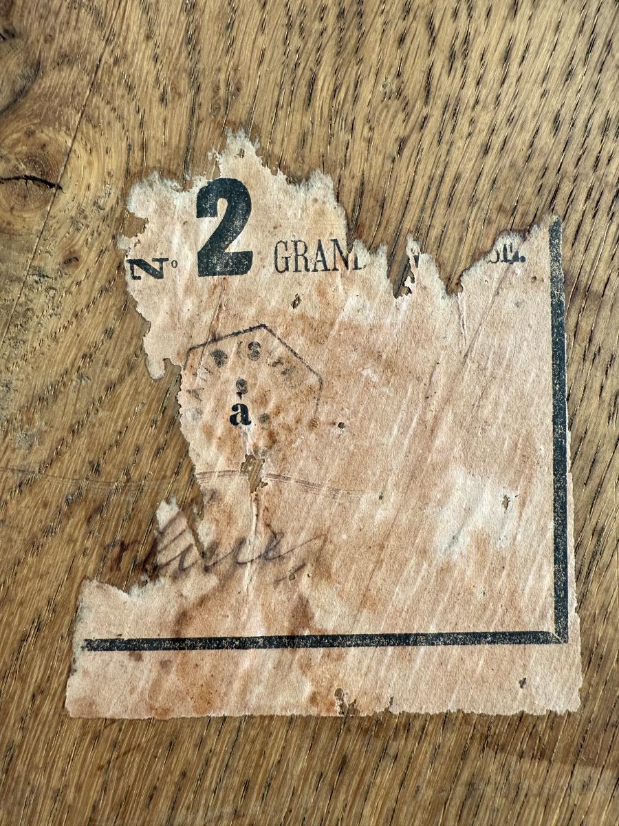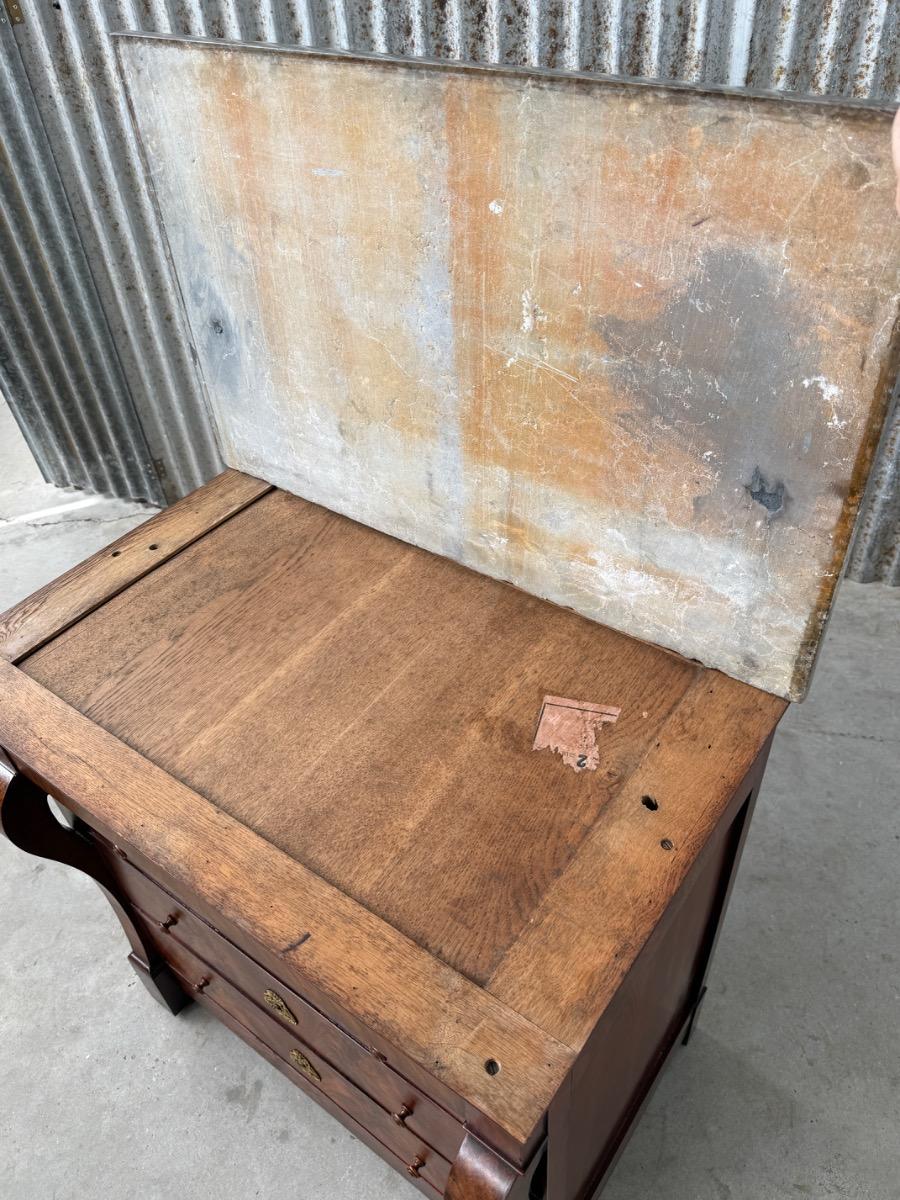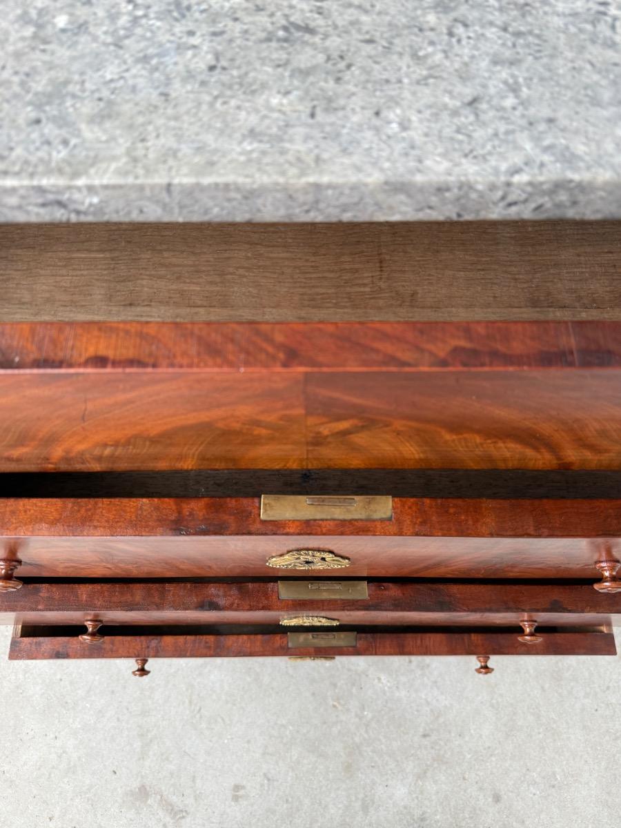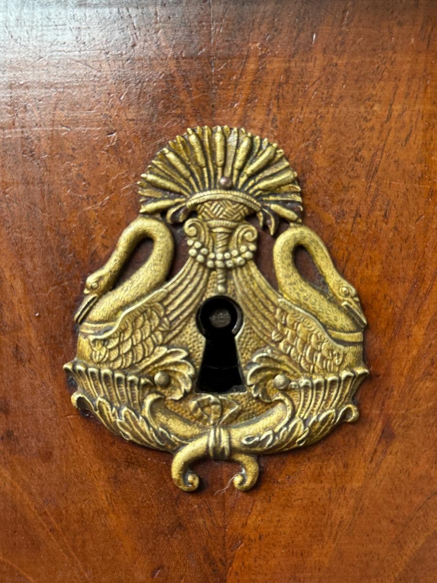 De bovenste lade is een ‘blinde lade’ met twee onzichtbare grepen aan onderzijde van de iets overstekende lade, met mooi gedetailleerd vuur verguld brons beslag.