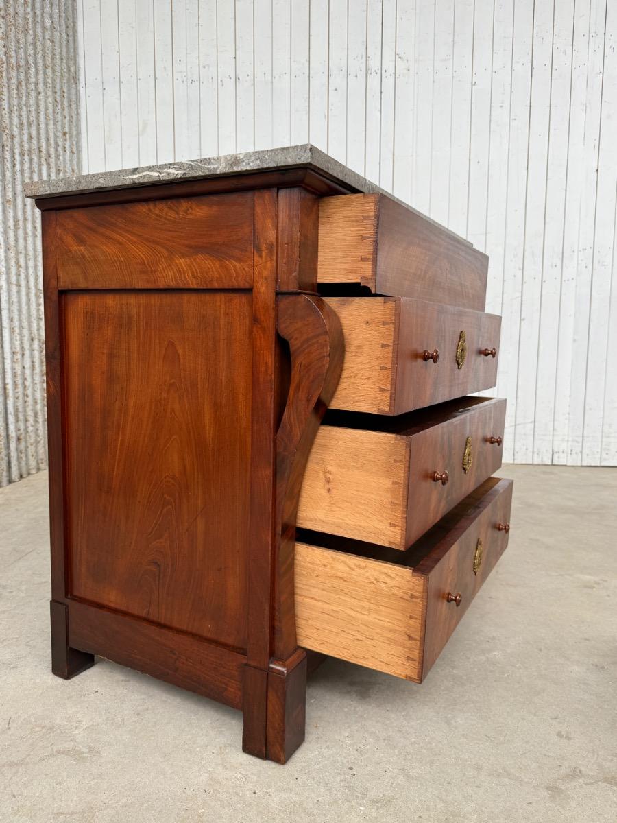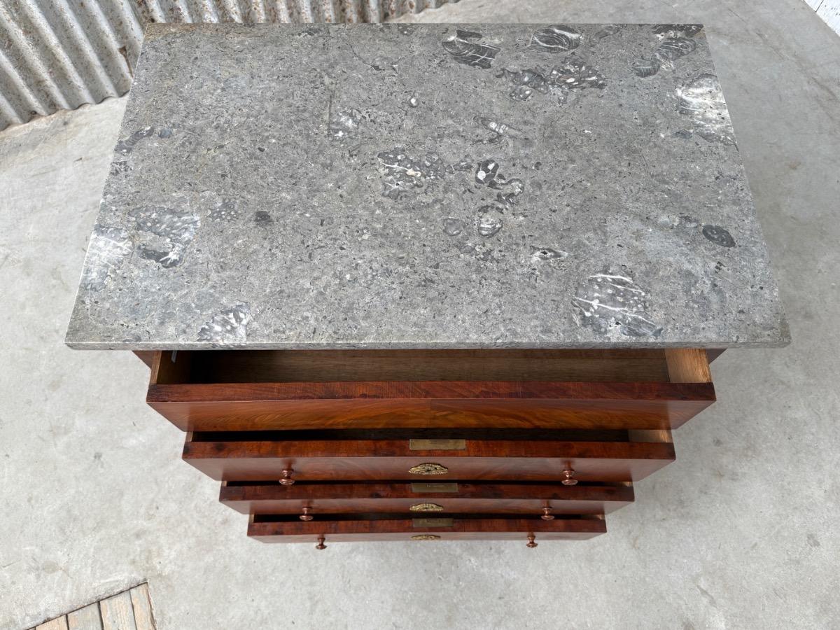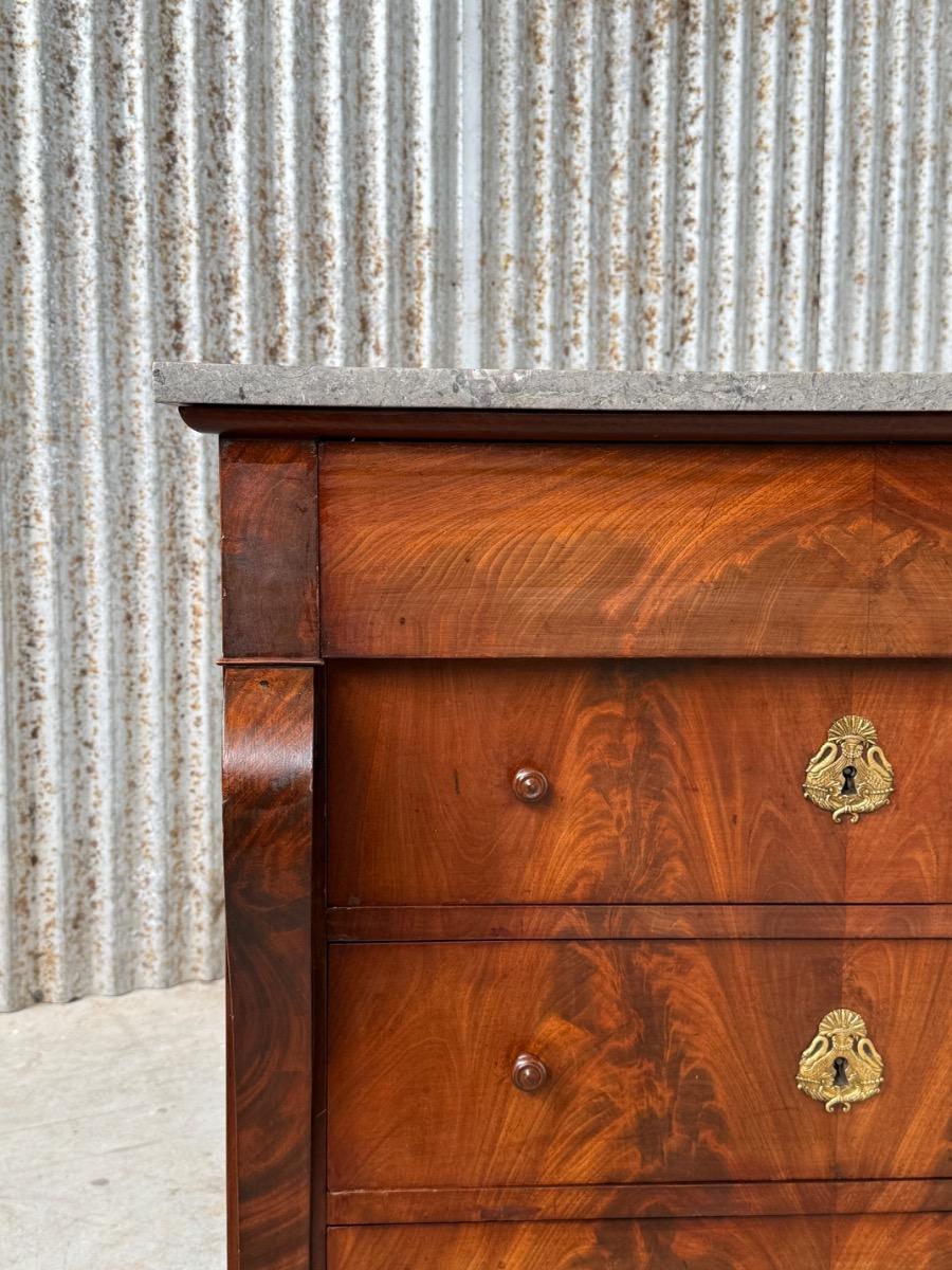 Franse empire commode, met fraai over alle laden doorlopend bloem mahonie, gris de Marais hardstenen blad (marmer).