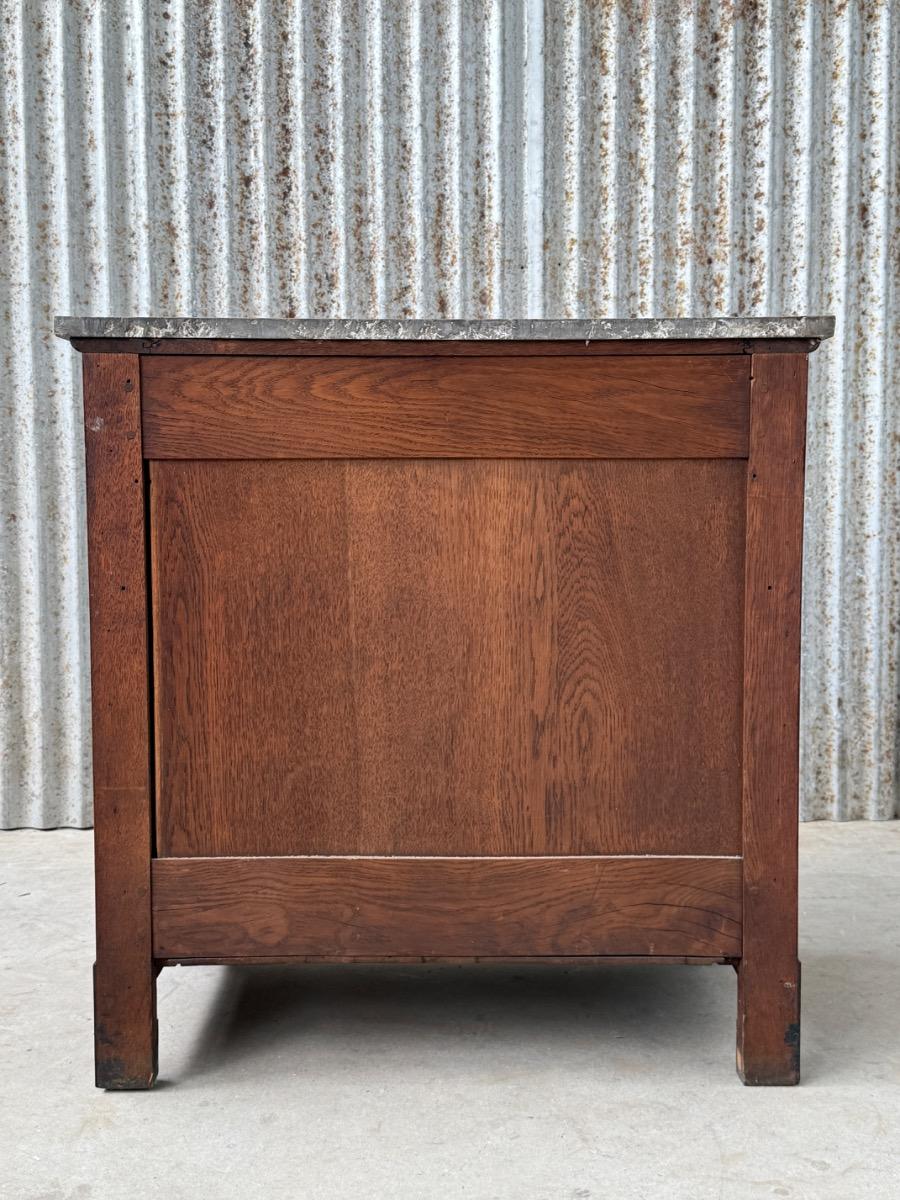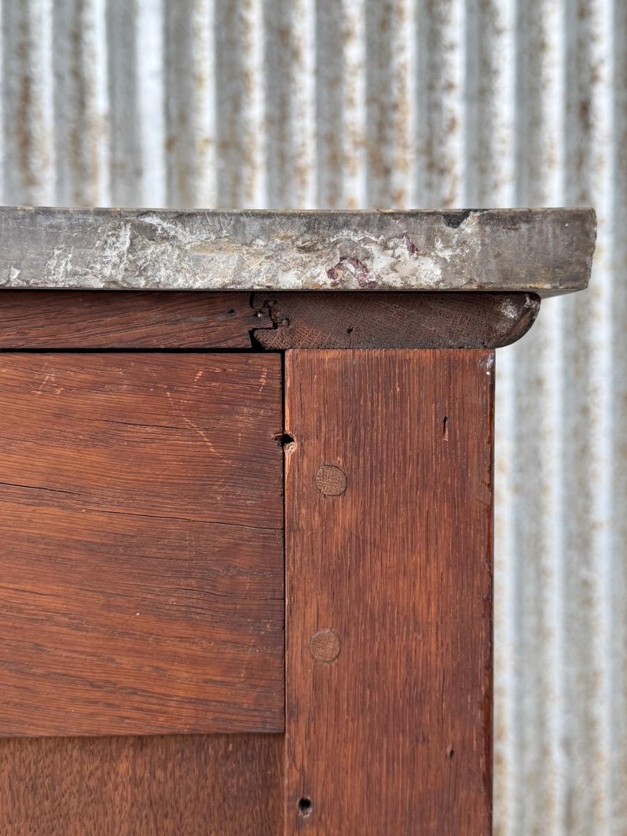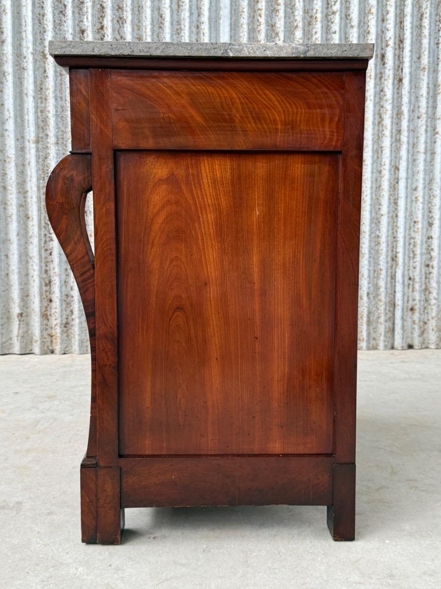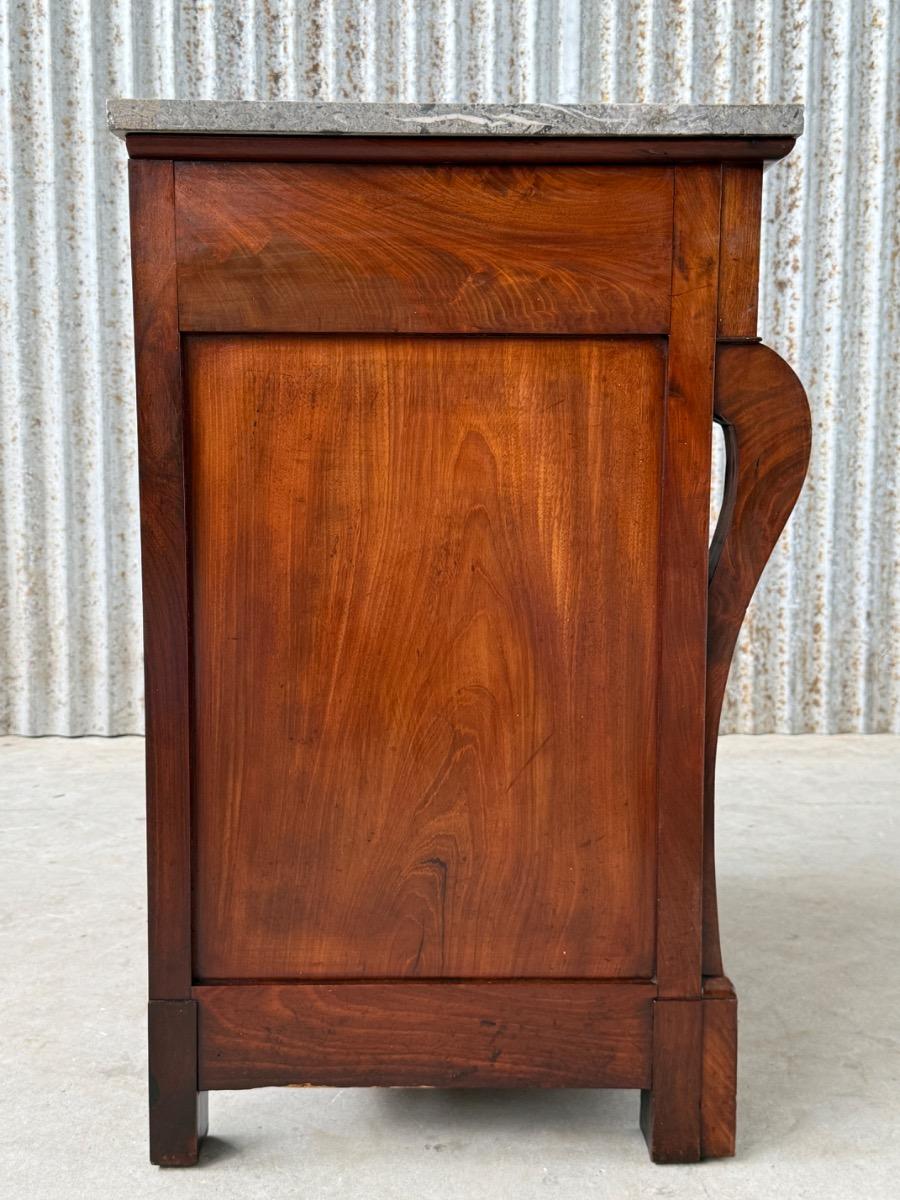 Franse empire commode, met fraai over alle laden doorlopend bloem mahonie, gris de Marais hardstenen blad (marmer).