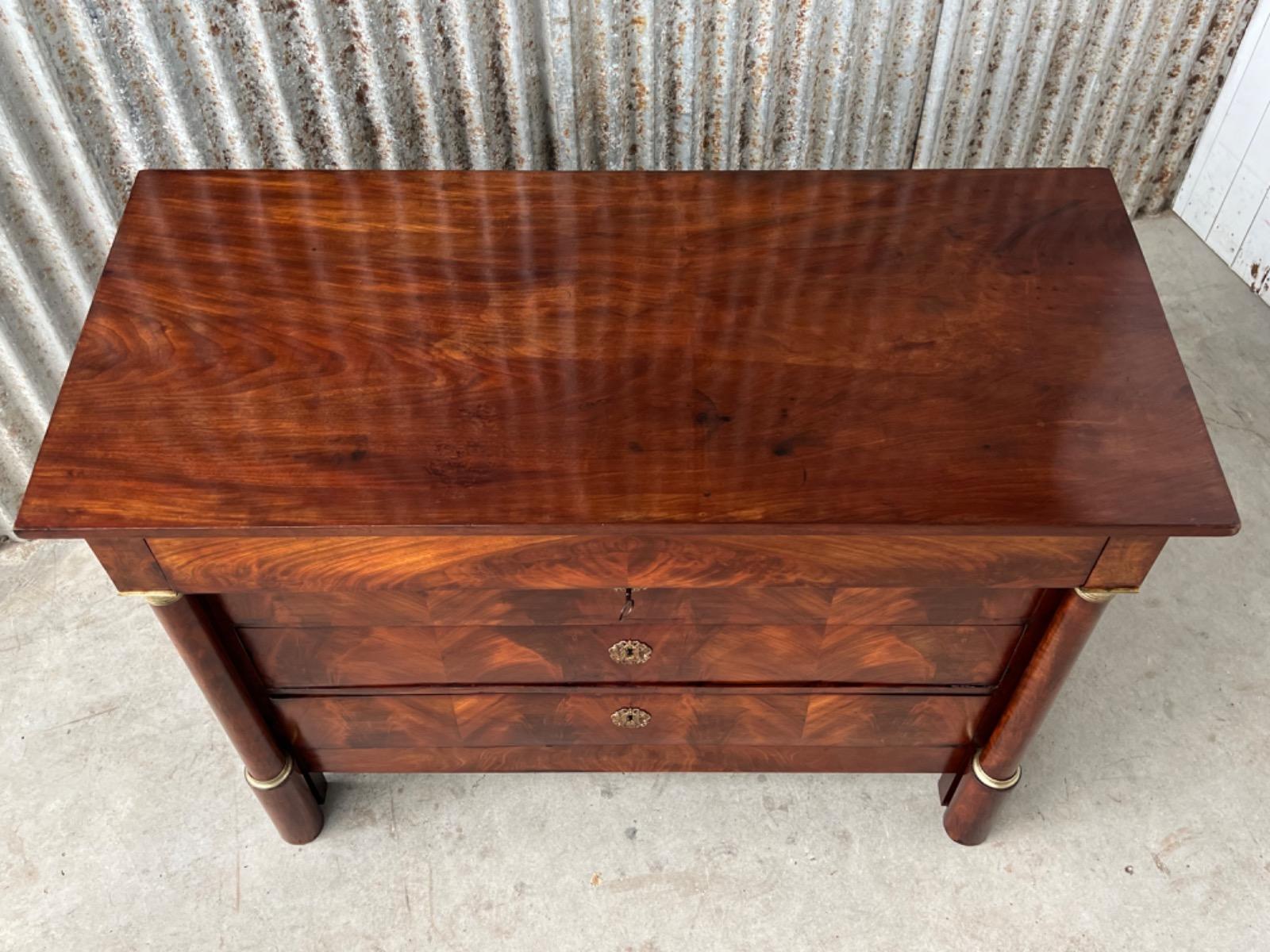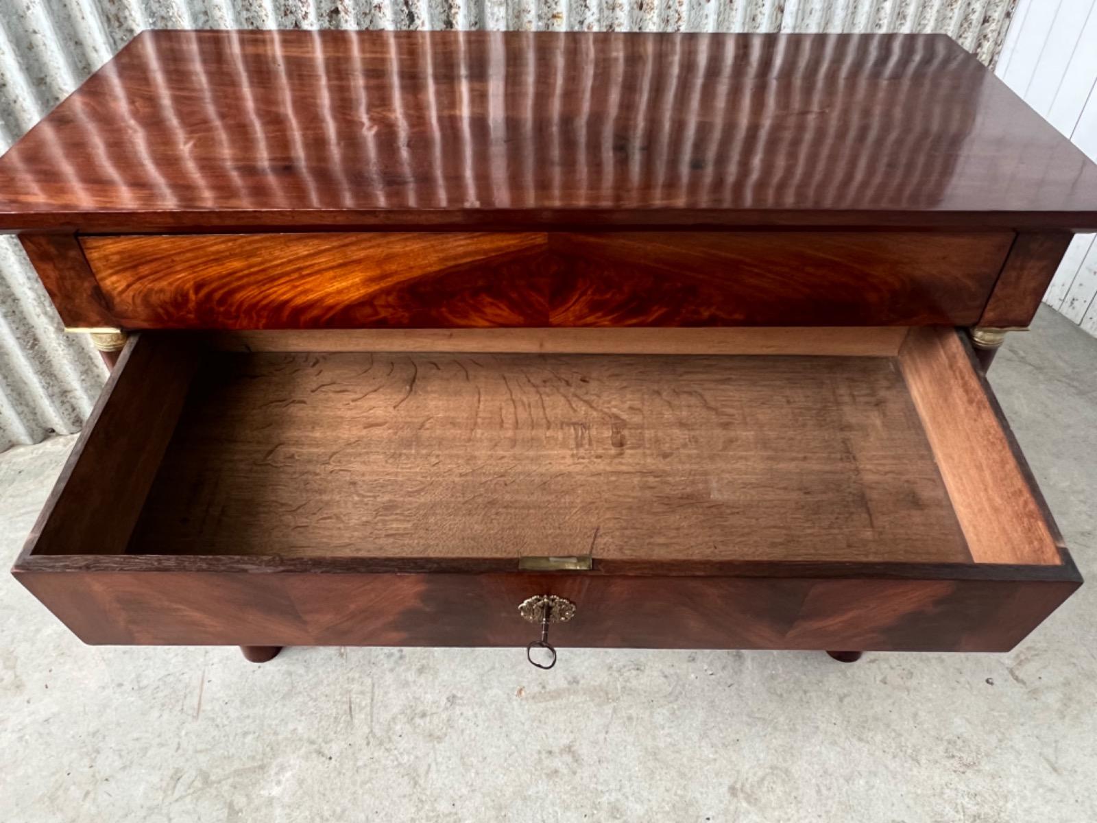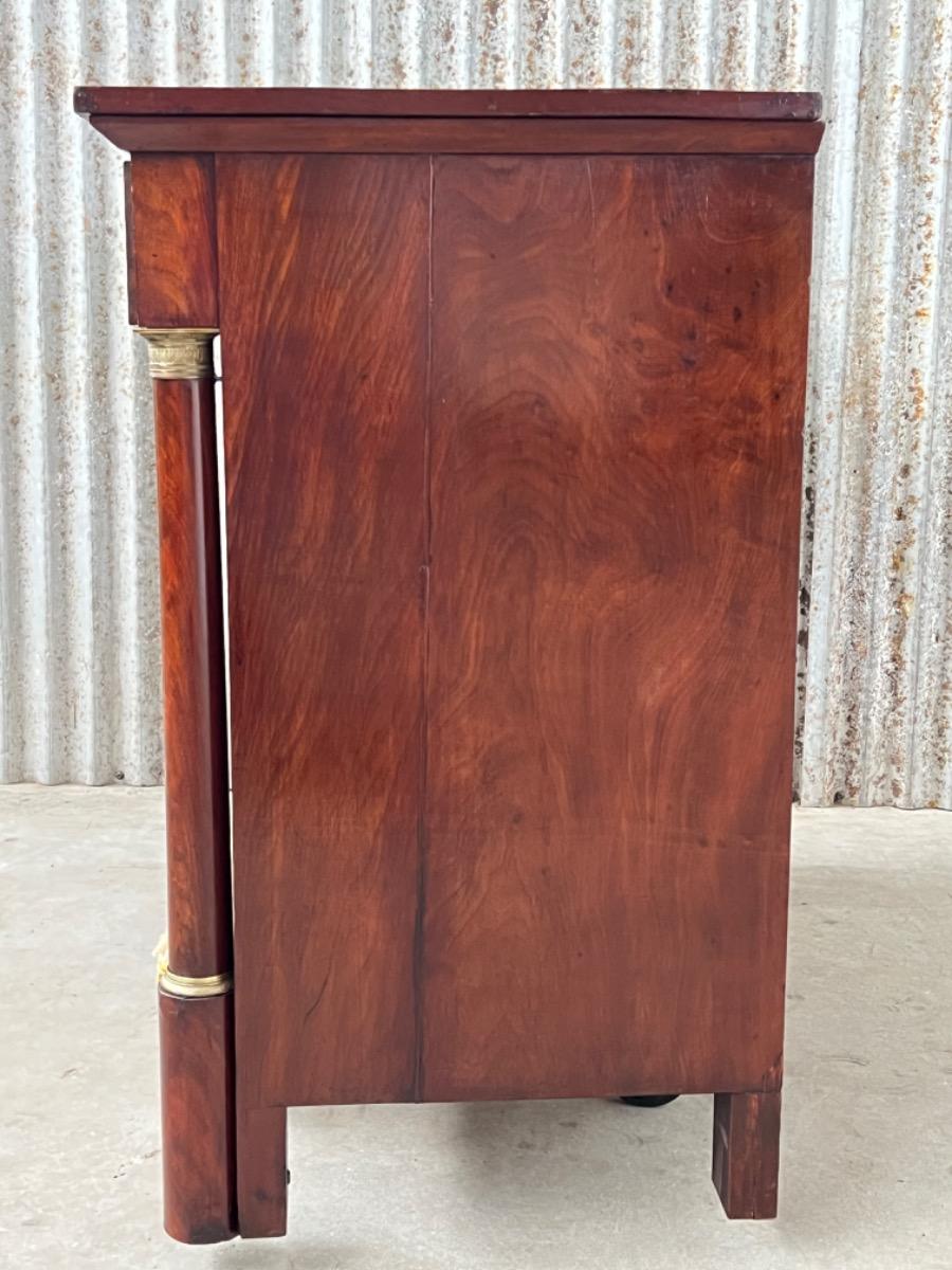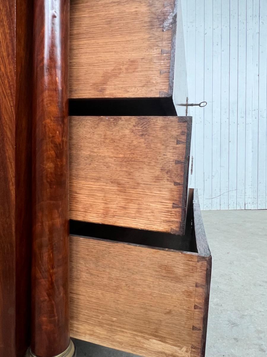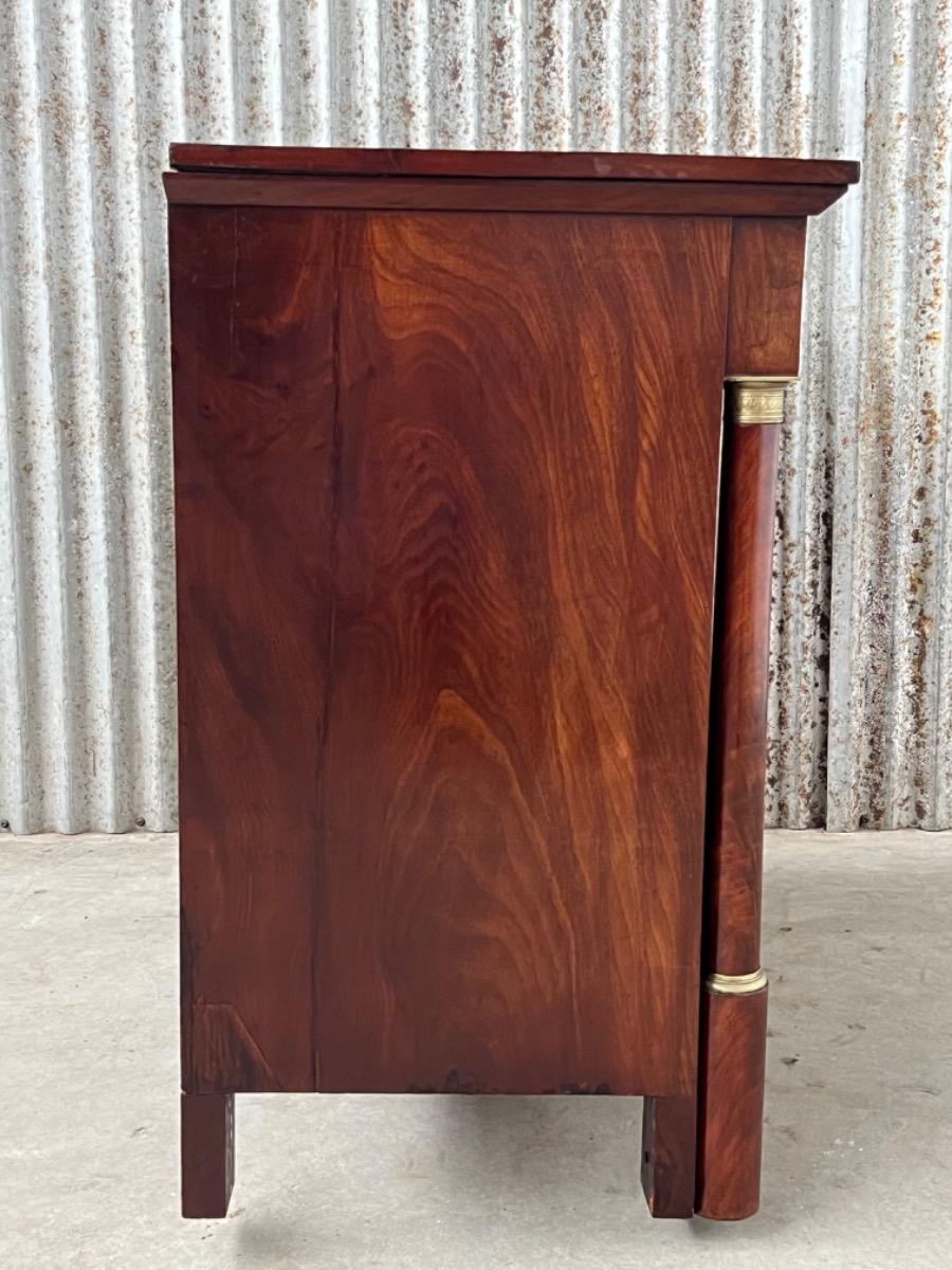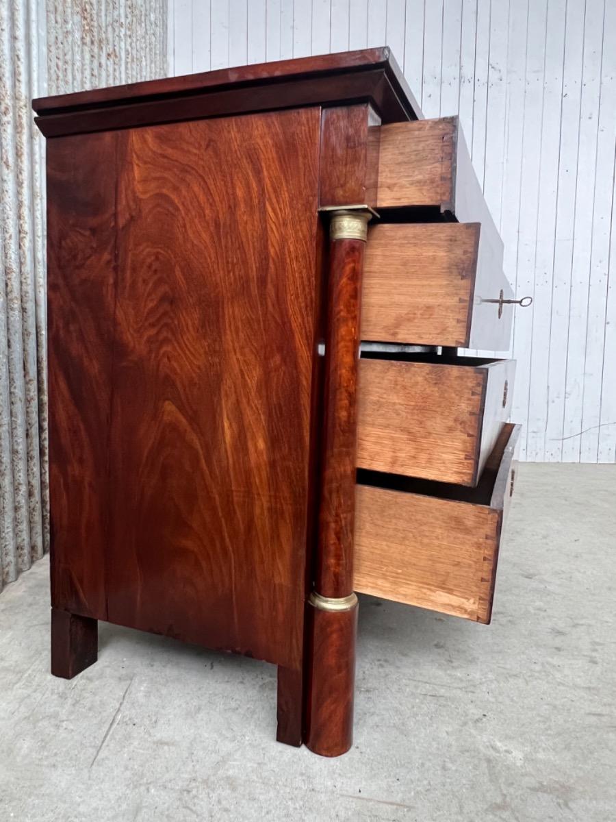 Franse empire ladekast of commode, met fraai over alle laden doorlopend mahonie met het oorspronkelijke dikke (2,5. cm) gekapte St. Anna marmeren blad.