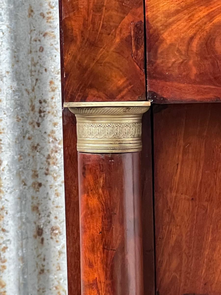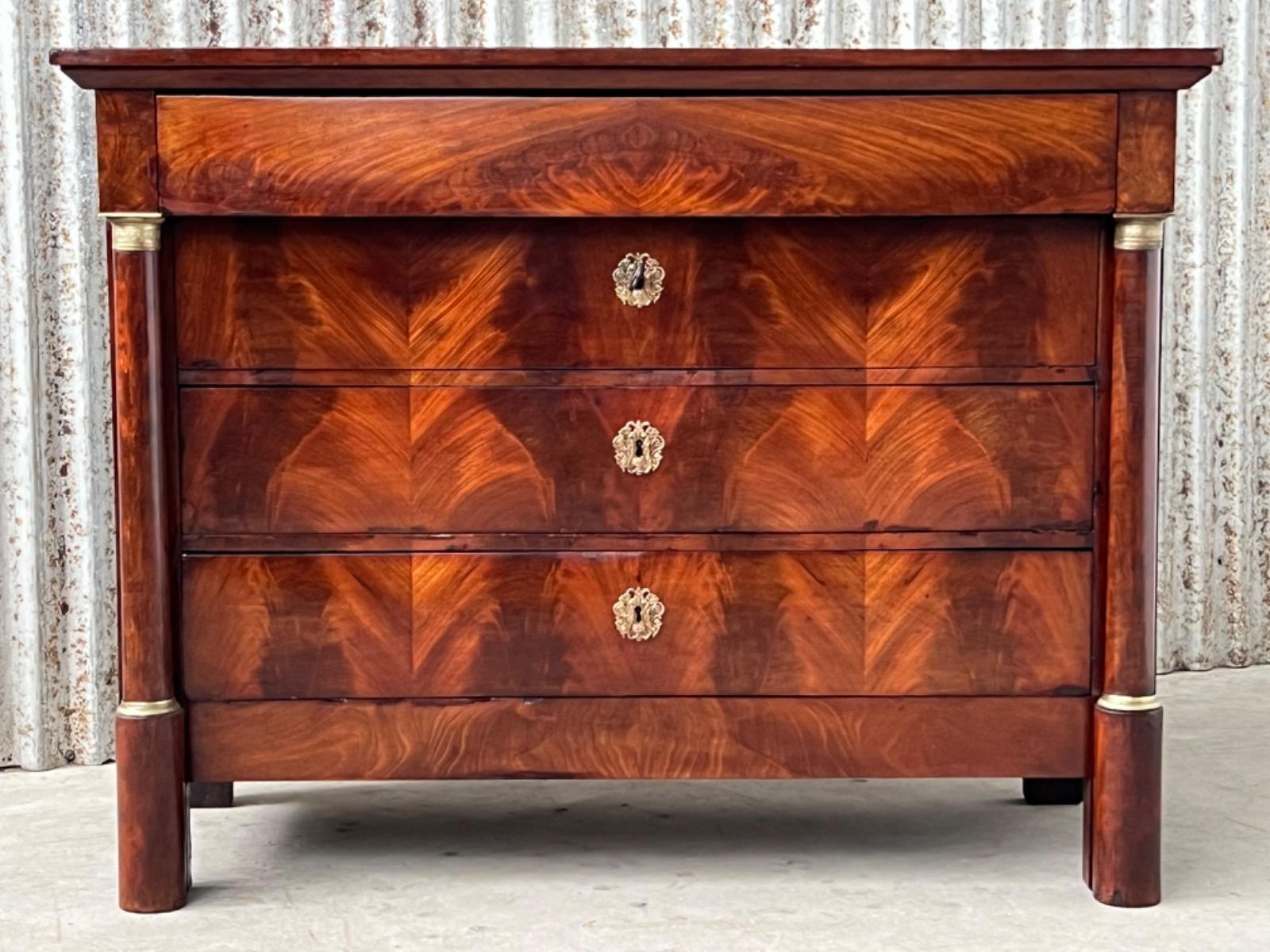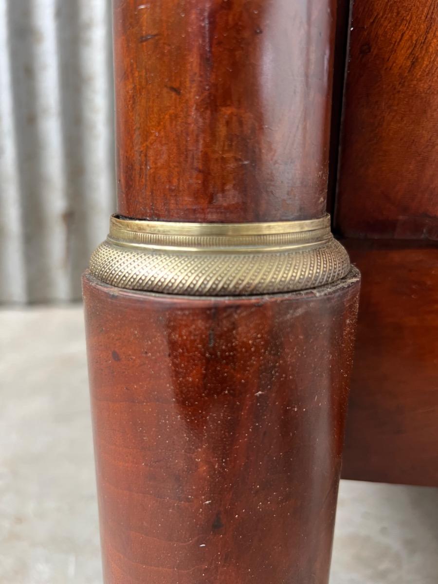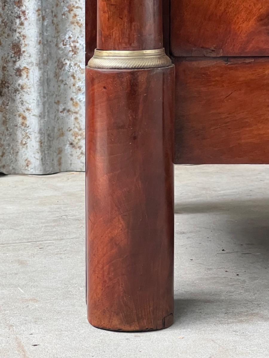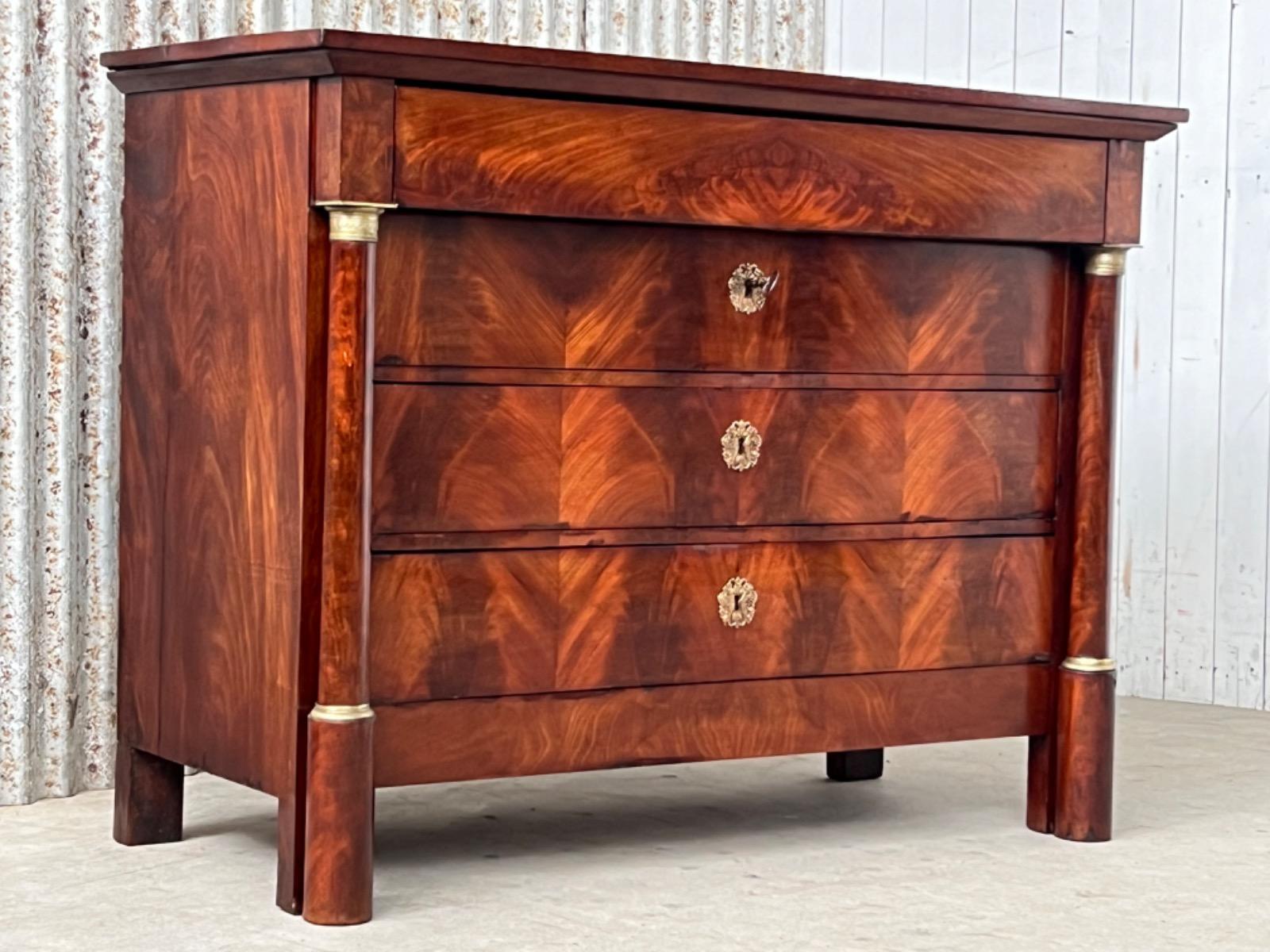 Franse empire ladekast of commode, met fraai over alle laden doorlopend mahonie met het oorspronkelijke dikke (2,5. cm) gekapte St. Anna marmeren blad.