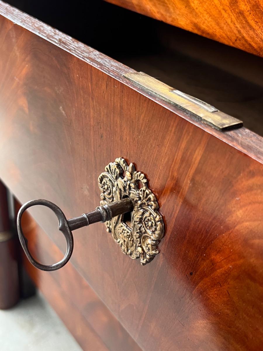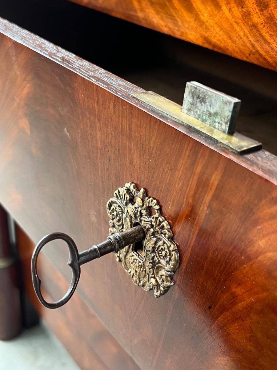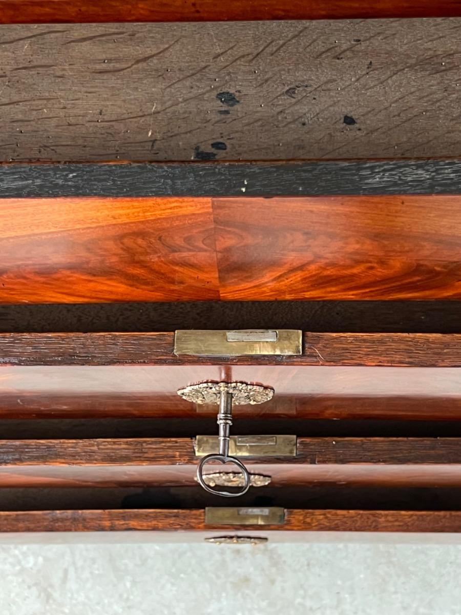 Messing schild beslag op de laden met op de bovenste lade, dit is een ‘blinde lade’ met twee onzichtbare grepen aan onderzijde van de iets overstekende lade.