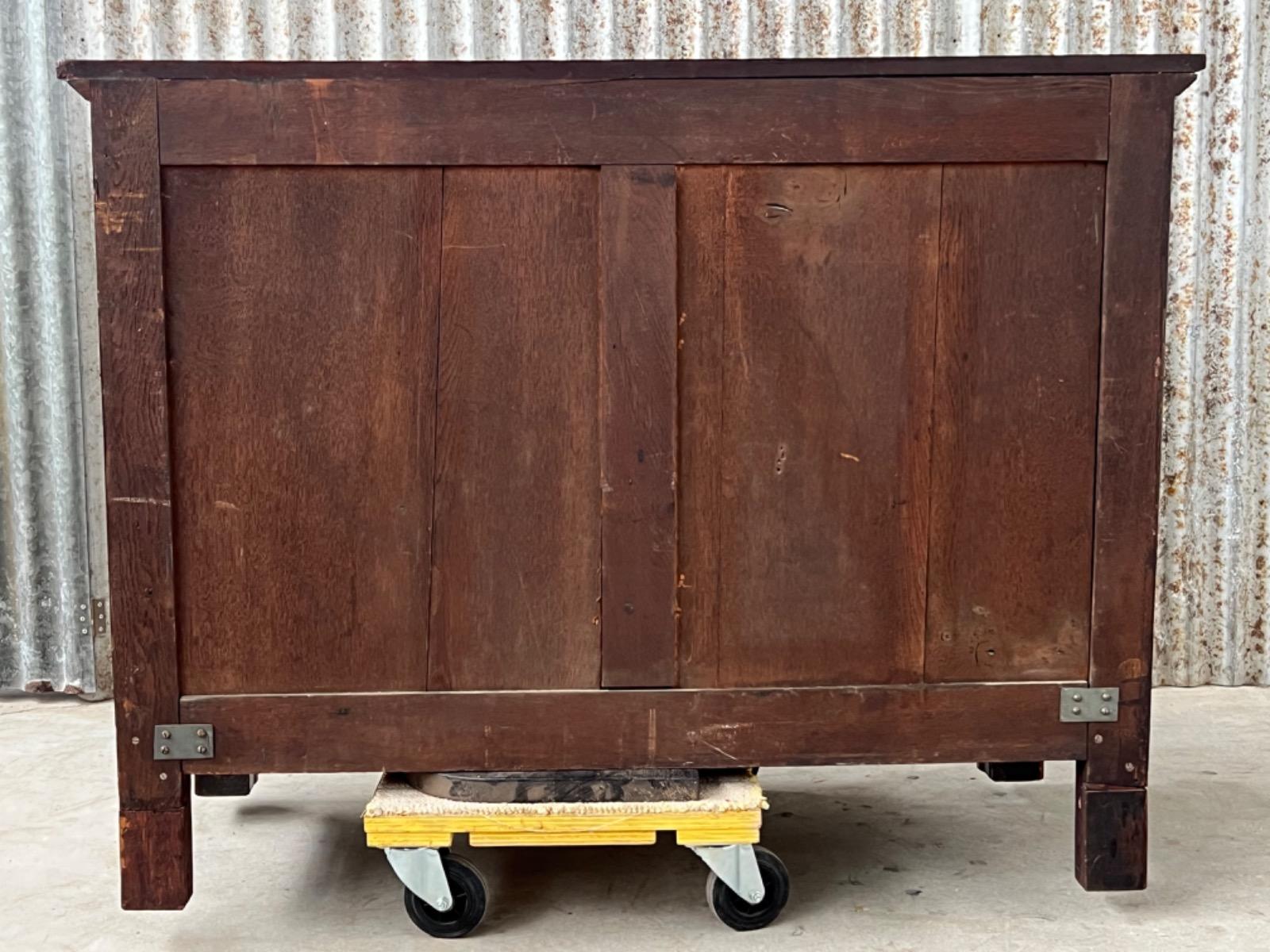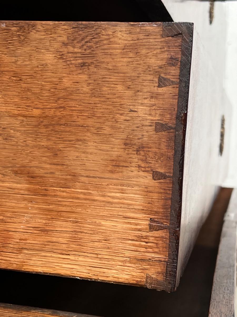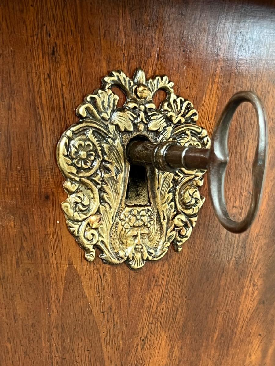 Messing schild beslag op de laden met op de bovenste lade, dit is een ‘blinde lade’ met twee onzichtbare grepen aan onderzijde van de iets overstekende lade.