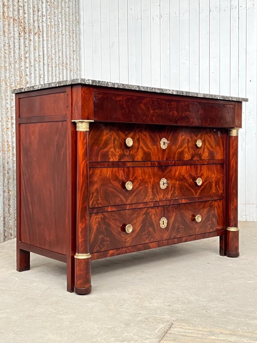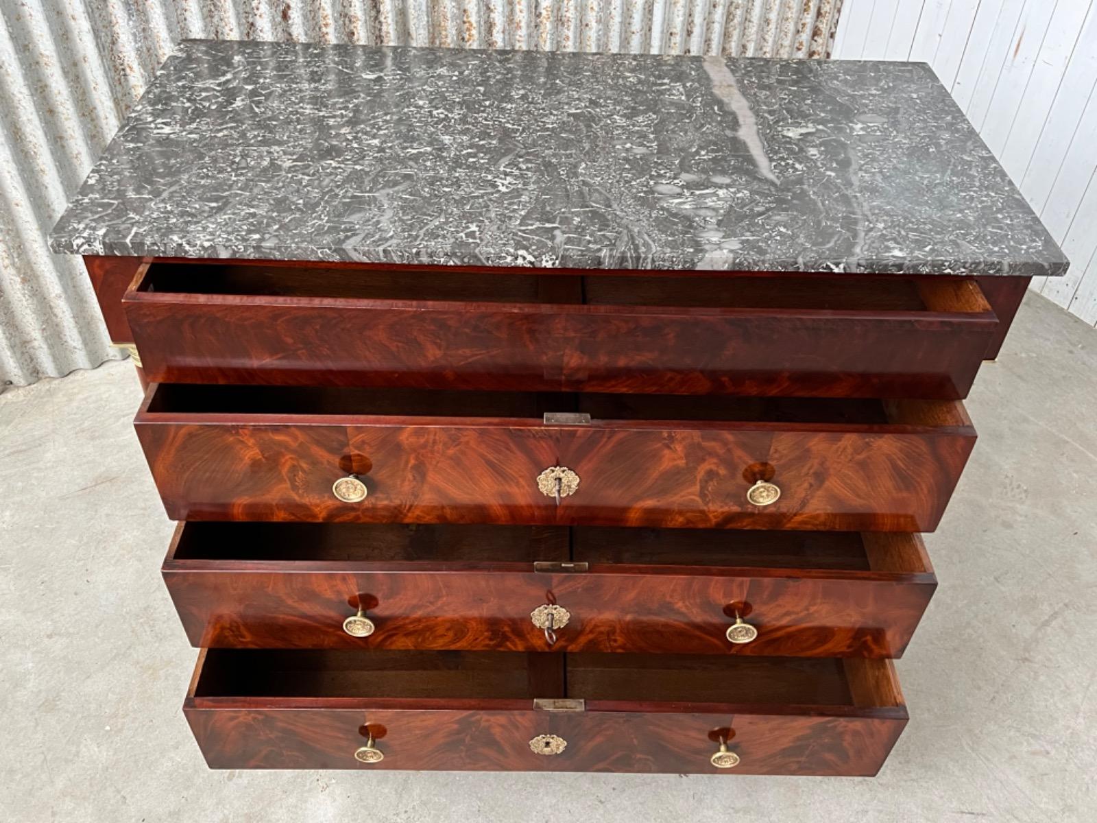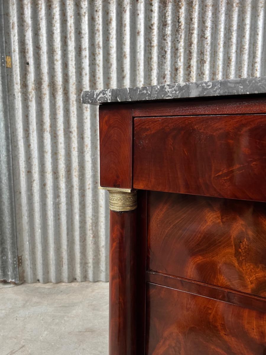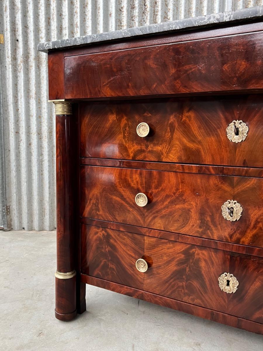 Franse empire ladekast of commode, met fraai over alle laden doorlopend mahonie met het oorspronkelijke dikke (2,5. cm) gekapte Gris Ambrosia marmeren blad.