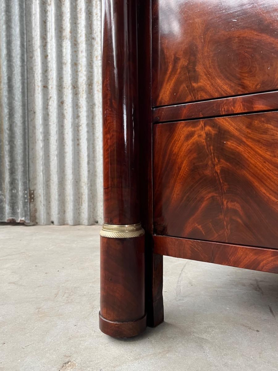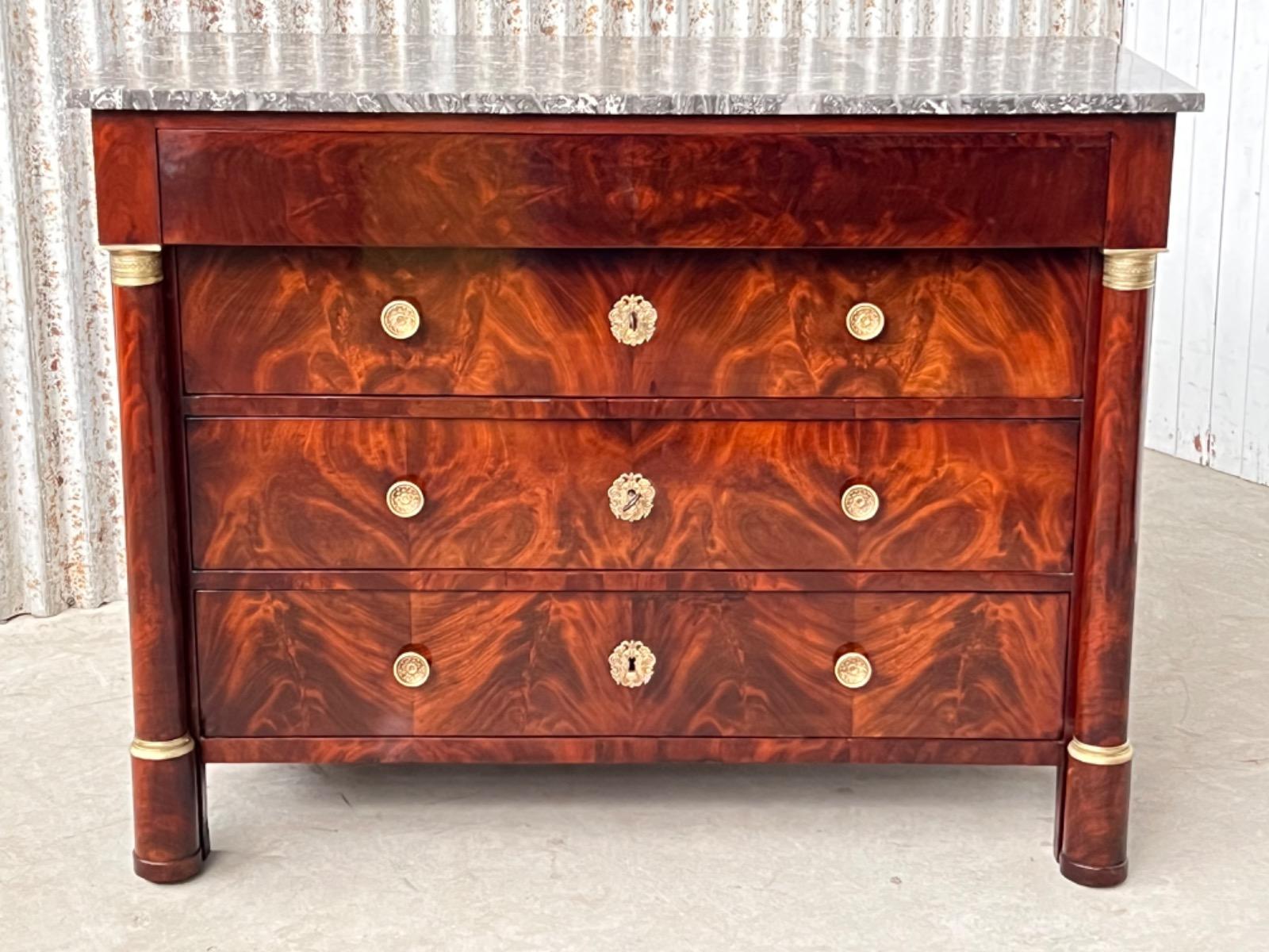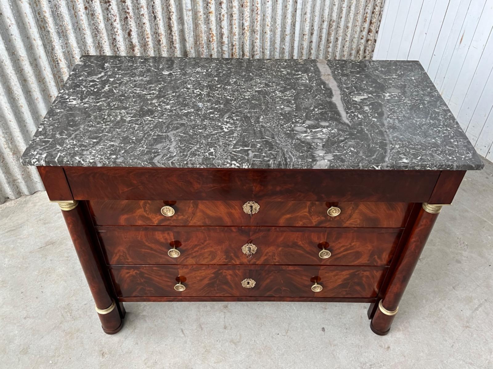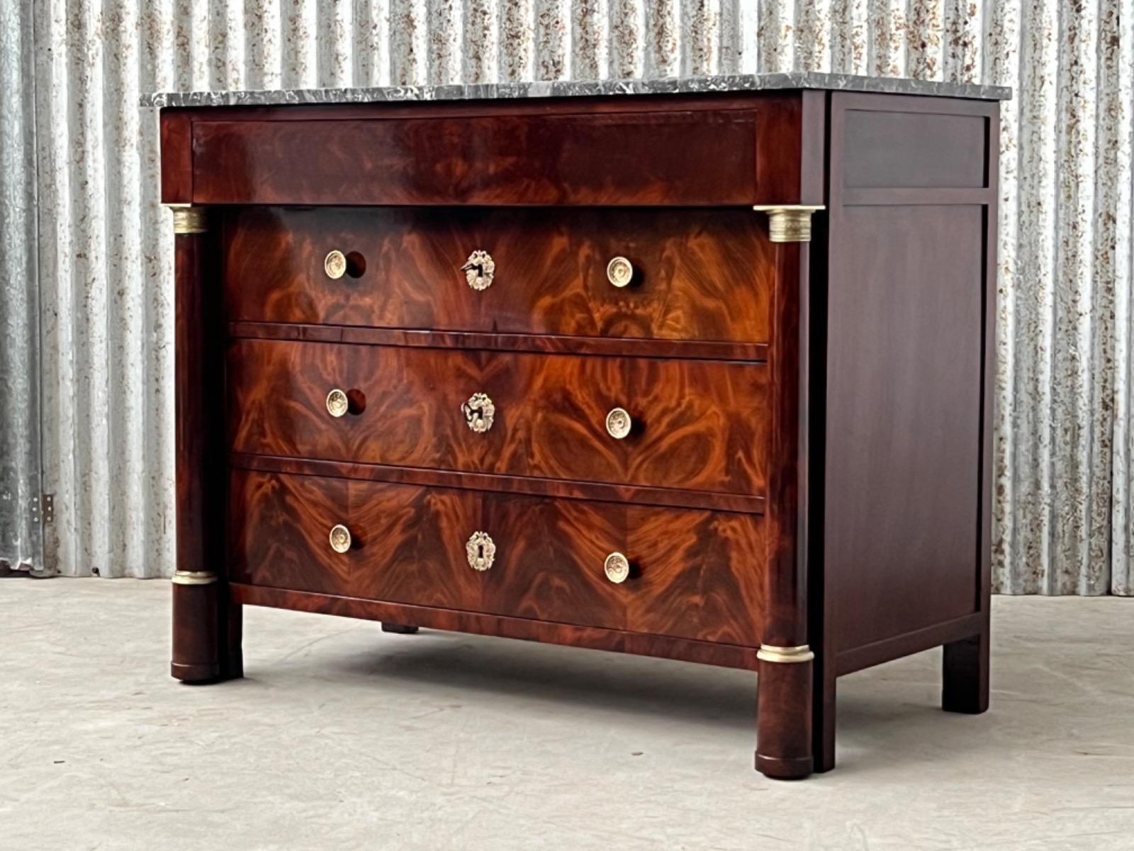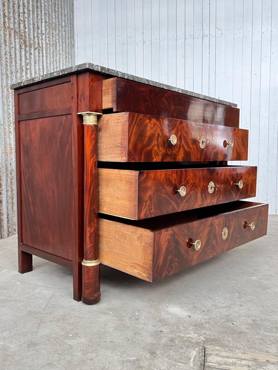 Franse empire ladekast of commode, met fraai over alle laden doorlopend mahonie met het oorspronkelijke dikke (2,5. cm) gekapte Gris Ambrosia marmeren blad.