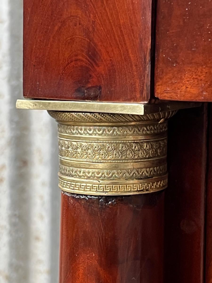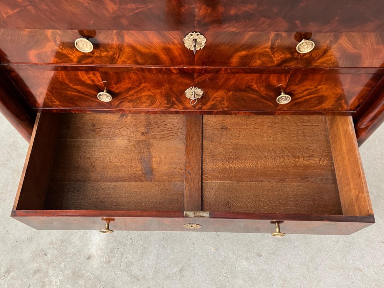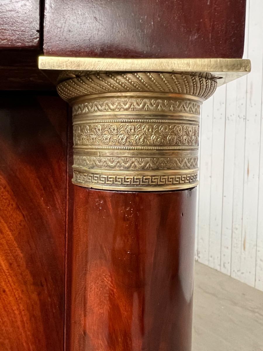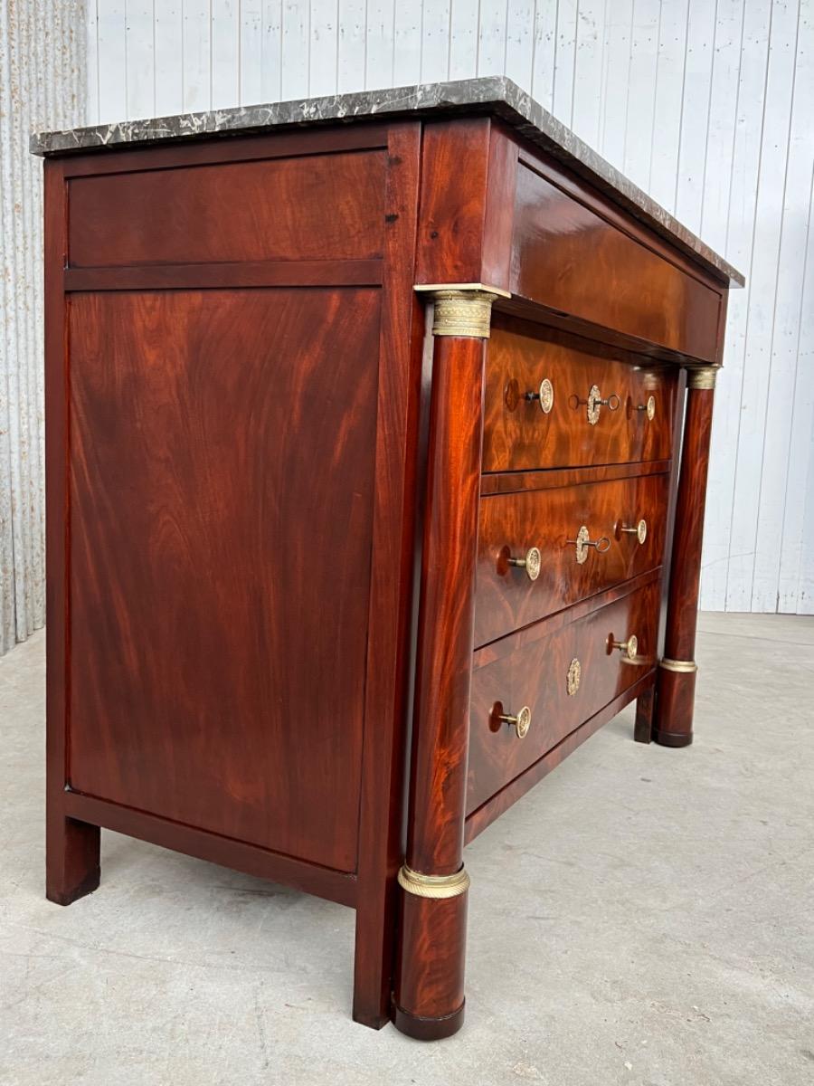 Franse empire ladekast of commode, met fraai over alle laden doorlopend mahonie met het oorspronkelijke dikke (2,5. cm) gekapte Gris Ambrosia marmeren blad.