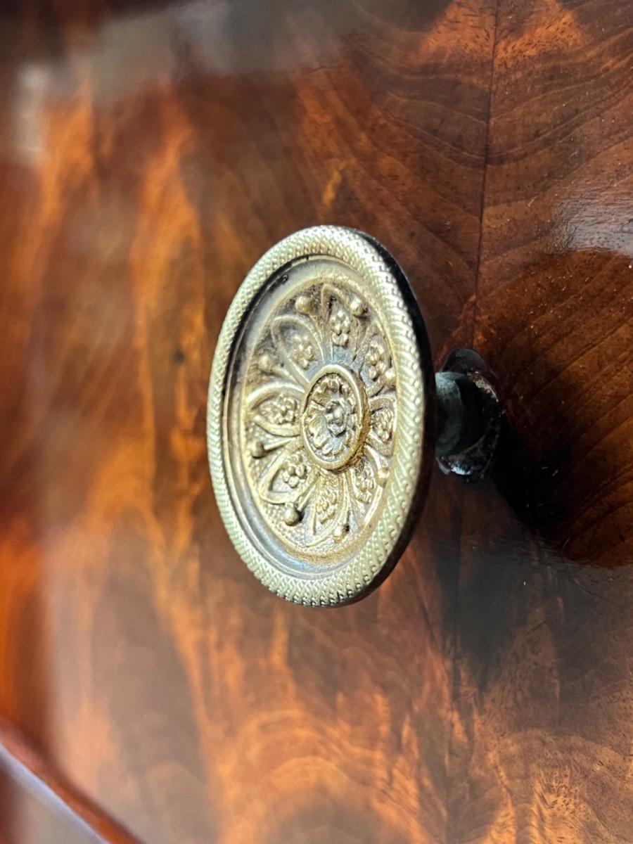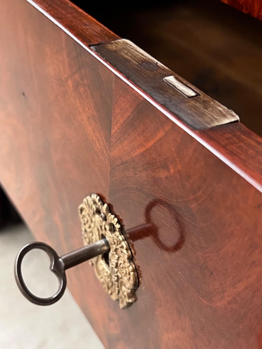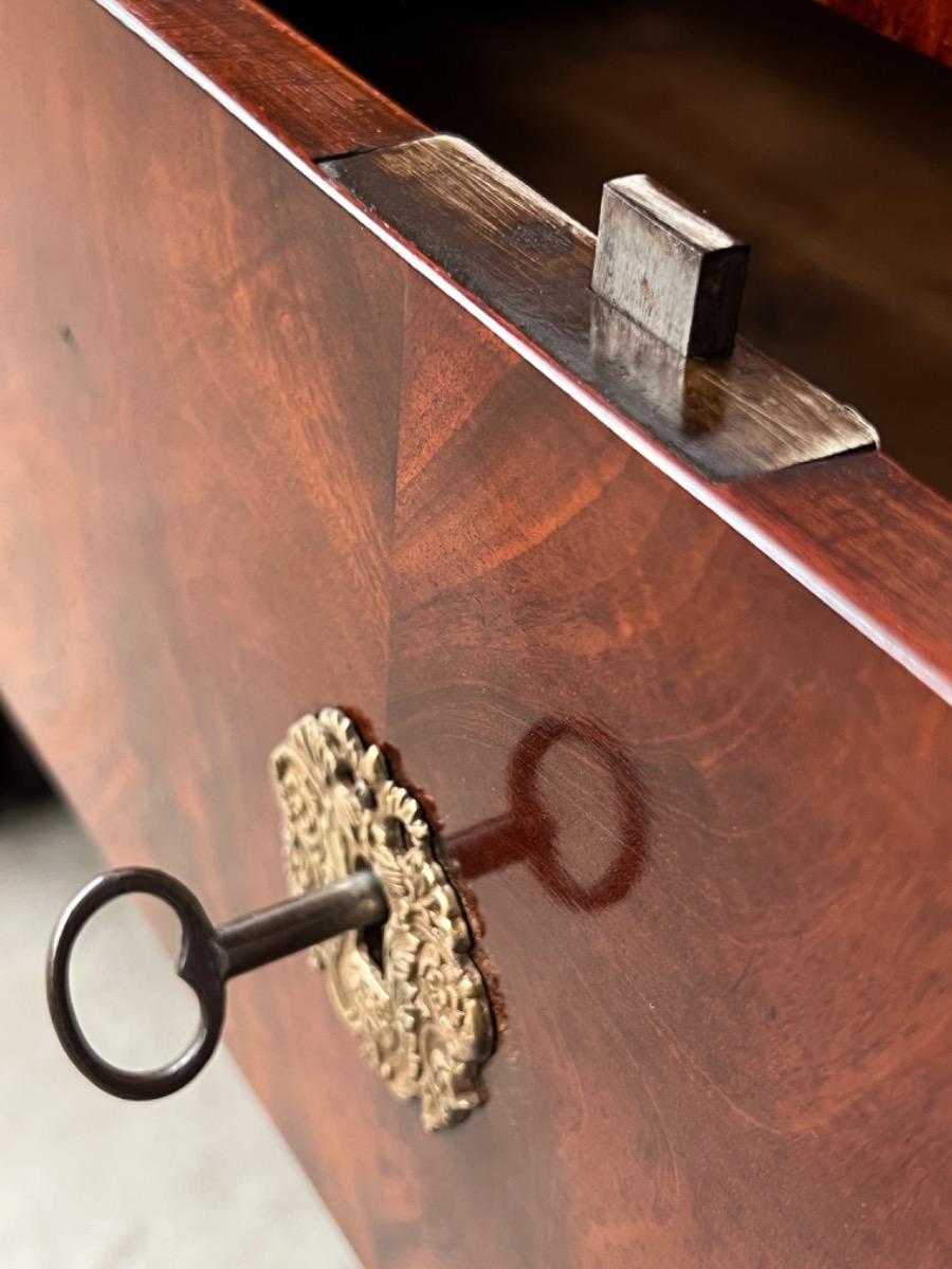 Messing knoppen en schild beslag op de 3 laden, met op de bovenste lade, dit is een ‘blinde lade’ met twee onzichtbare grepen aan onderzijde van de iets overstekende lade.