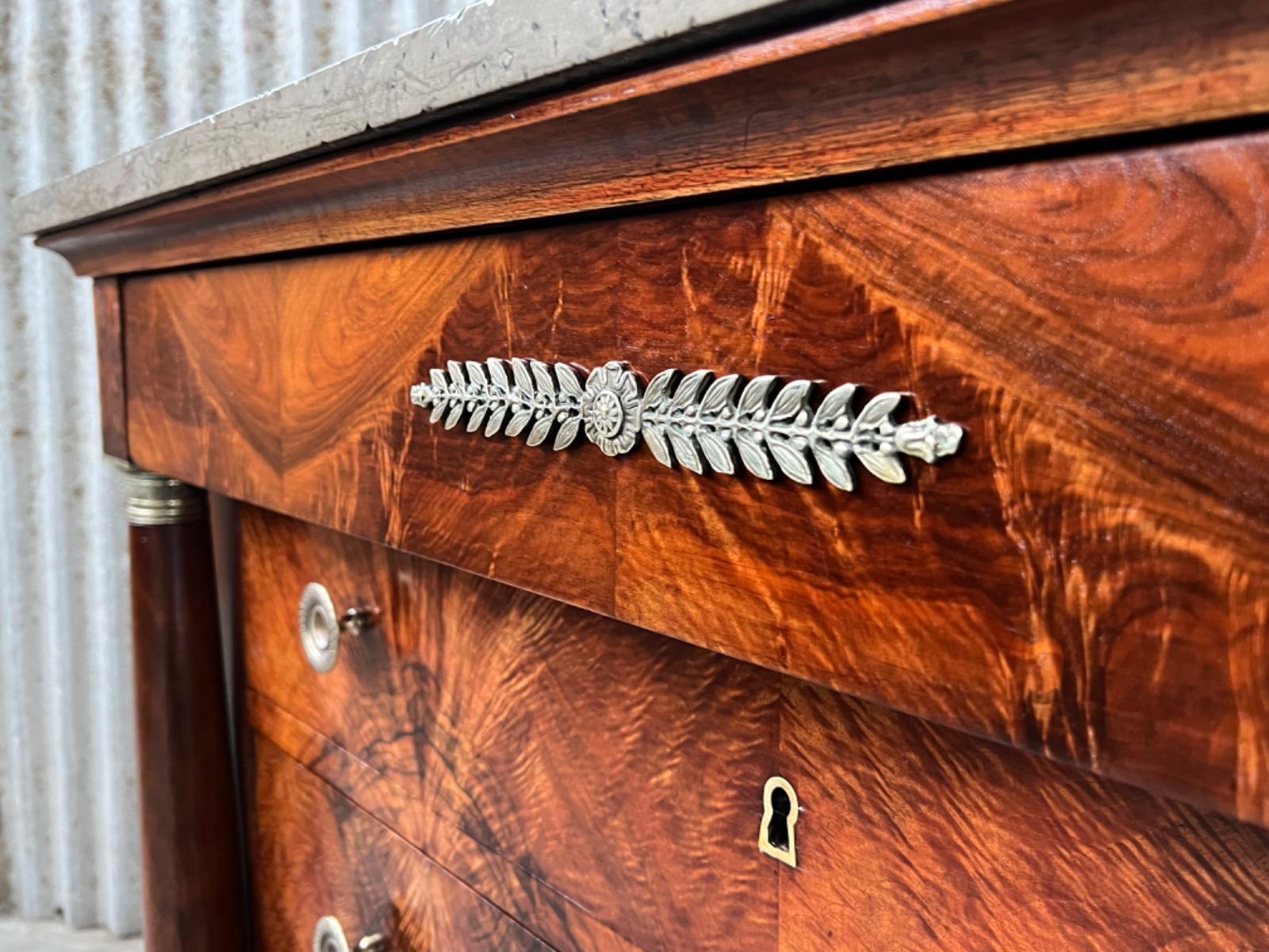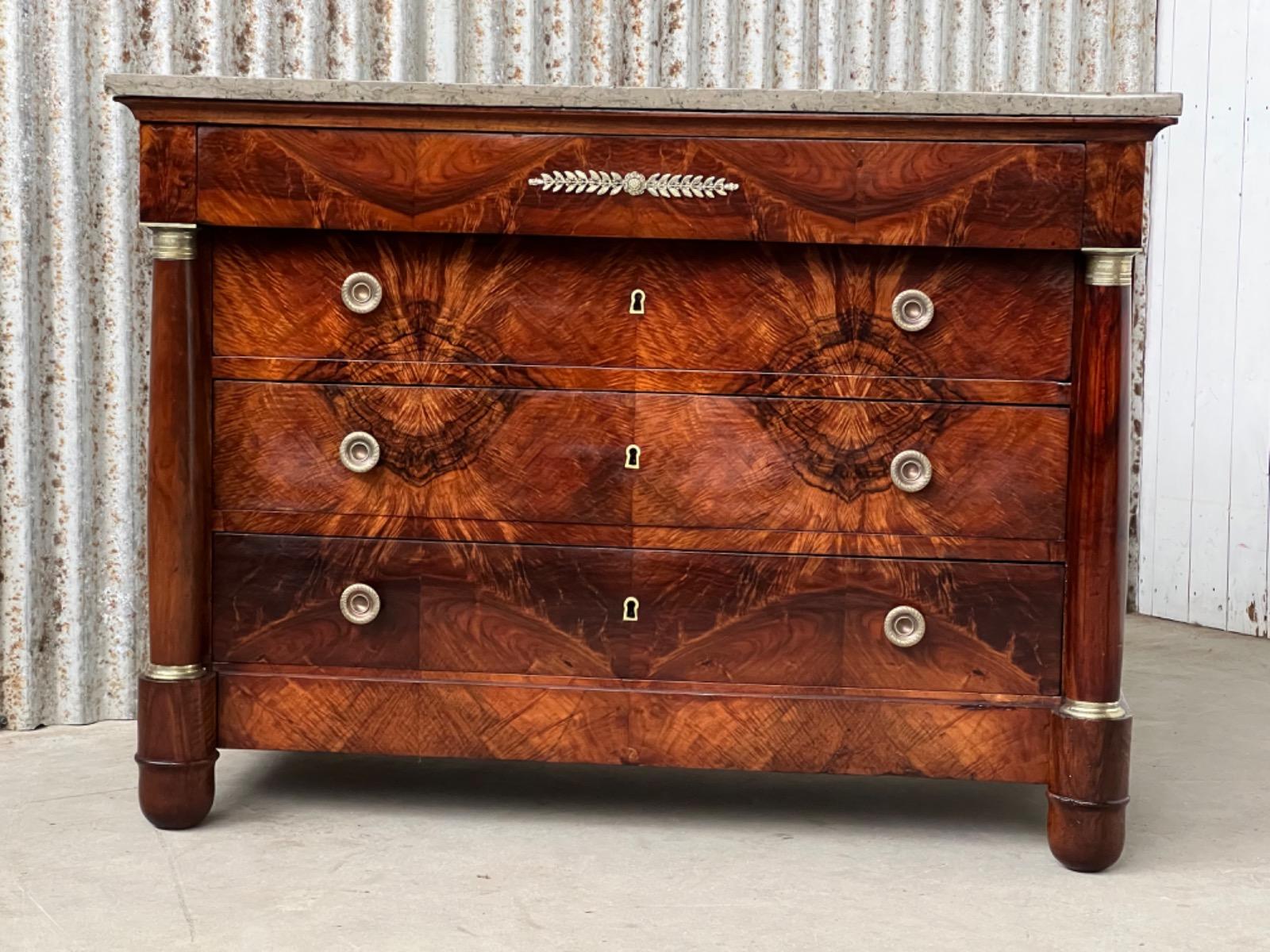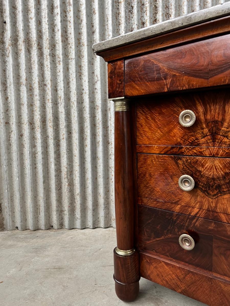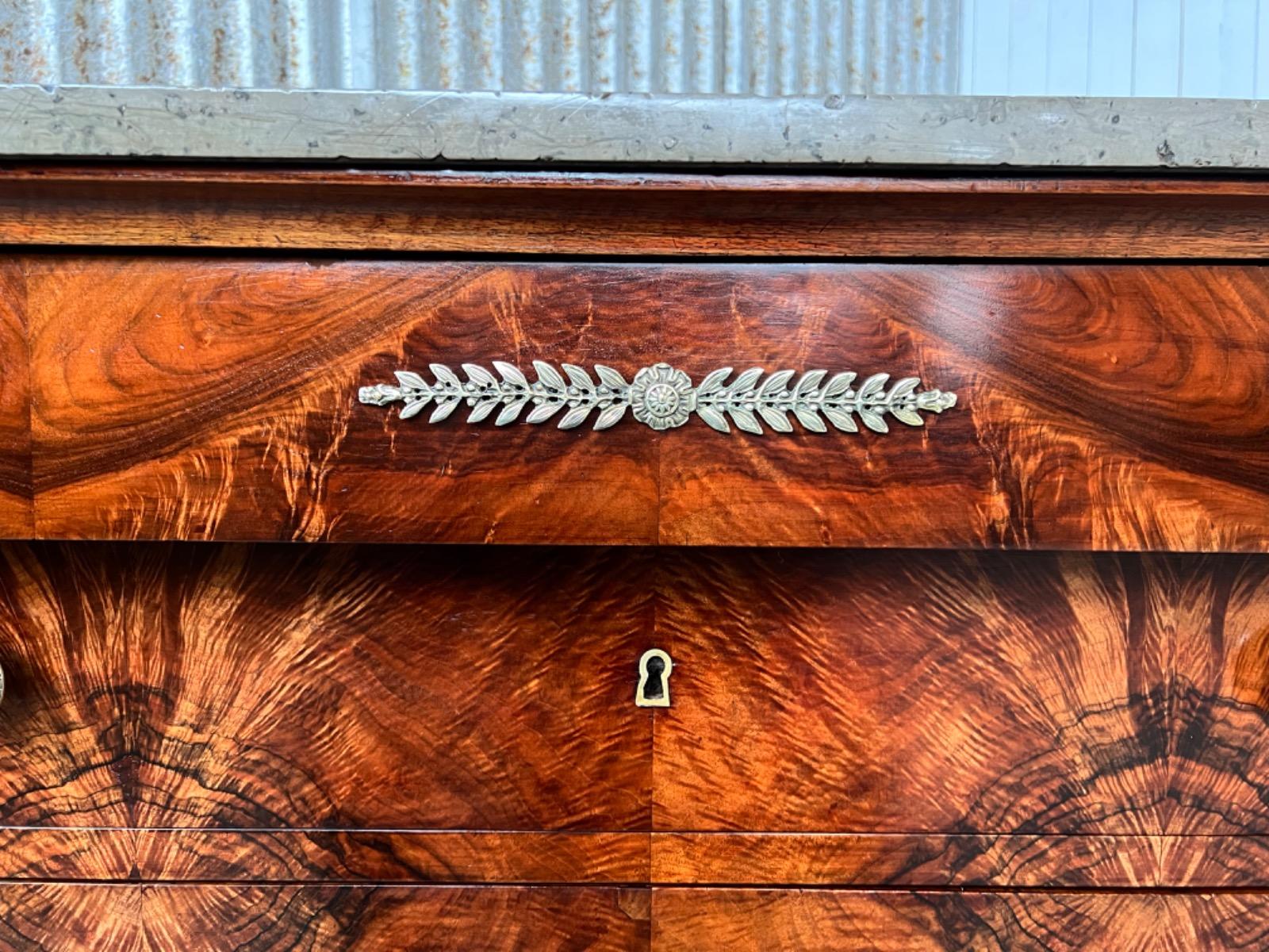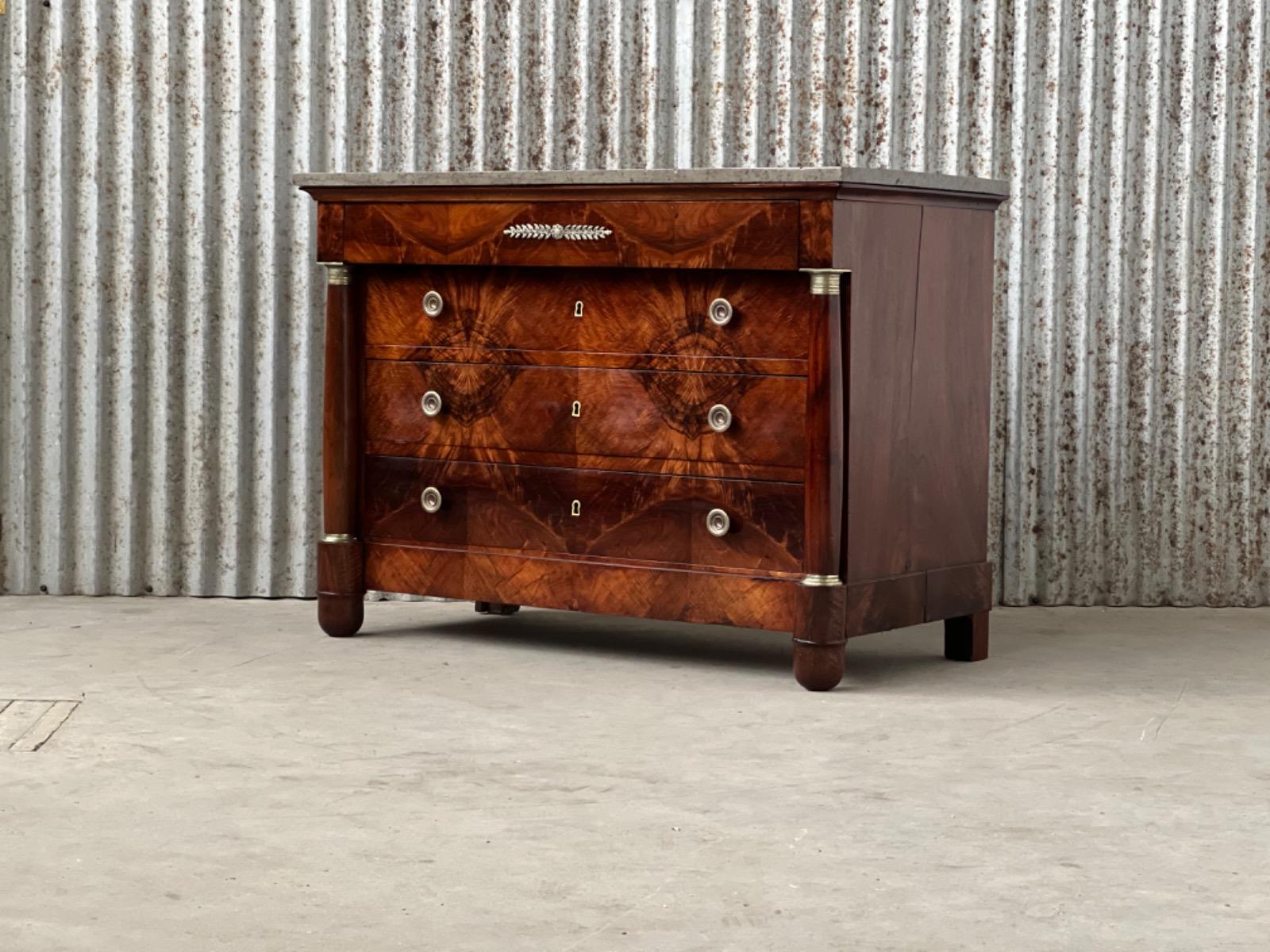 Franse empire ladekast of commode, met fraai over alle laden doorlopend Noten, met het oorspronkelijke dikke (2,5. cm) gekapte Gris Ambrosia marmeren blad.