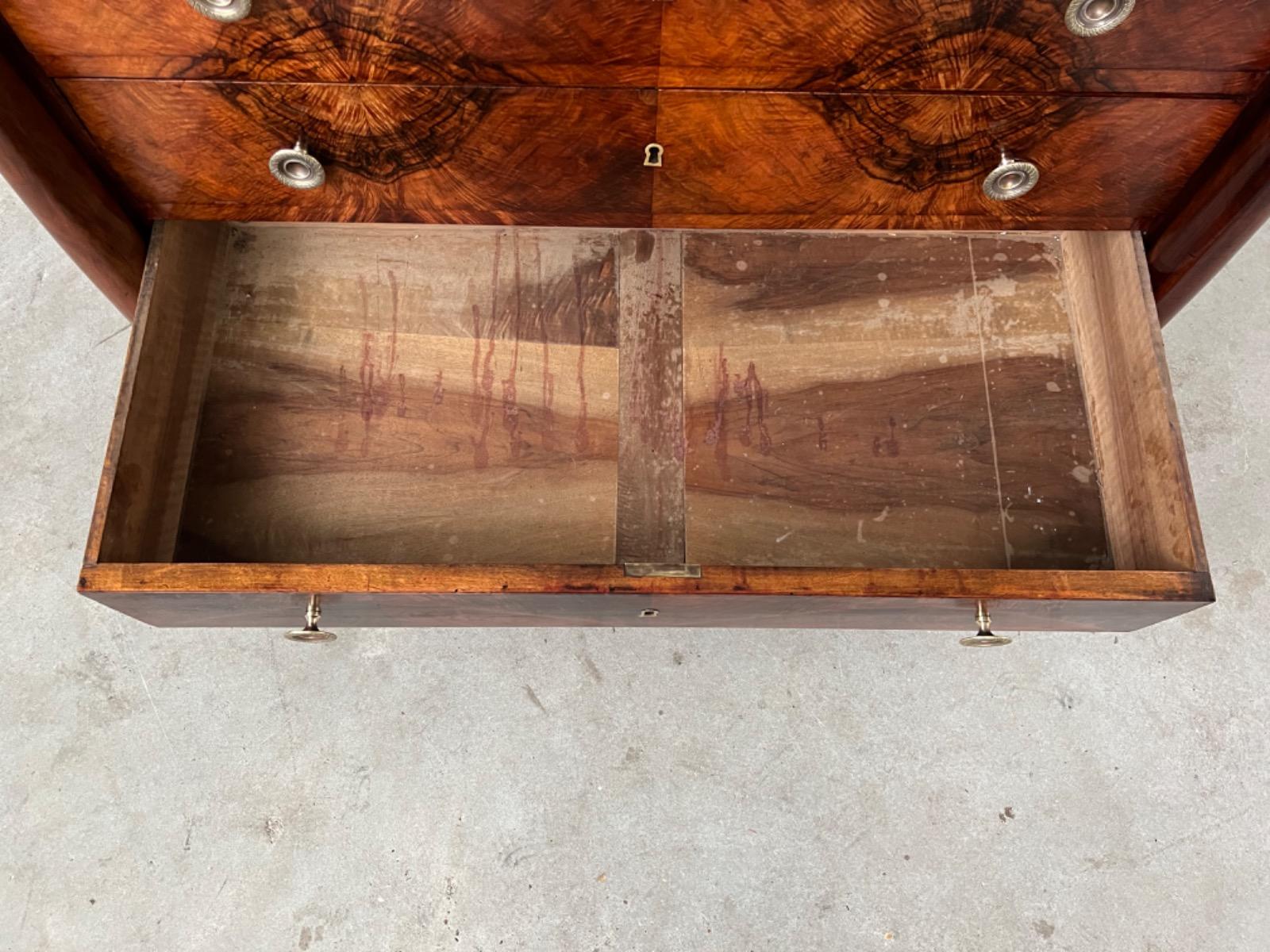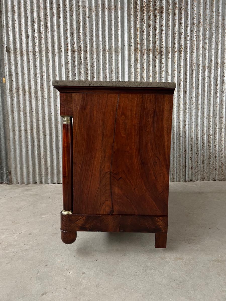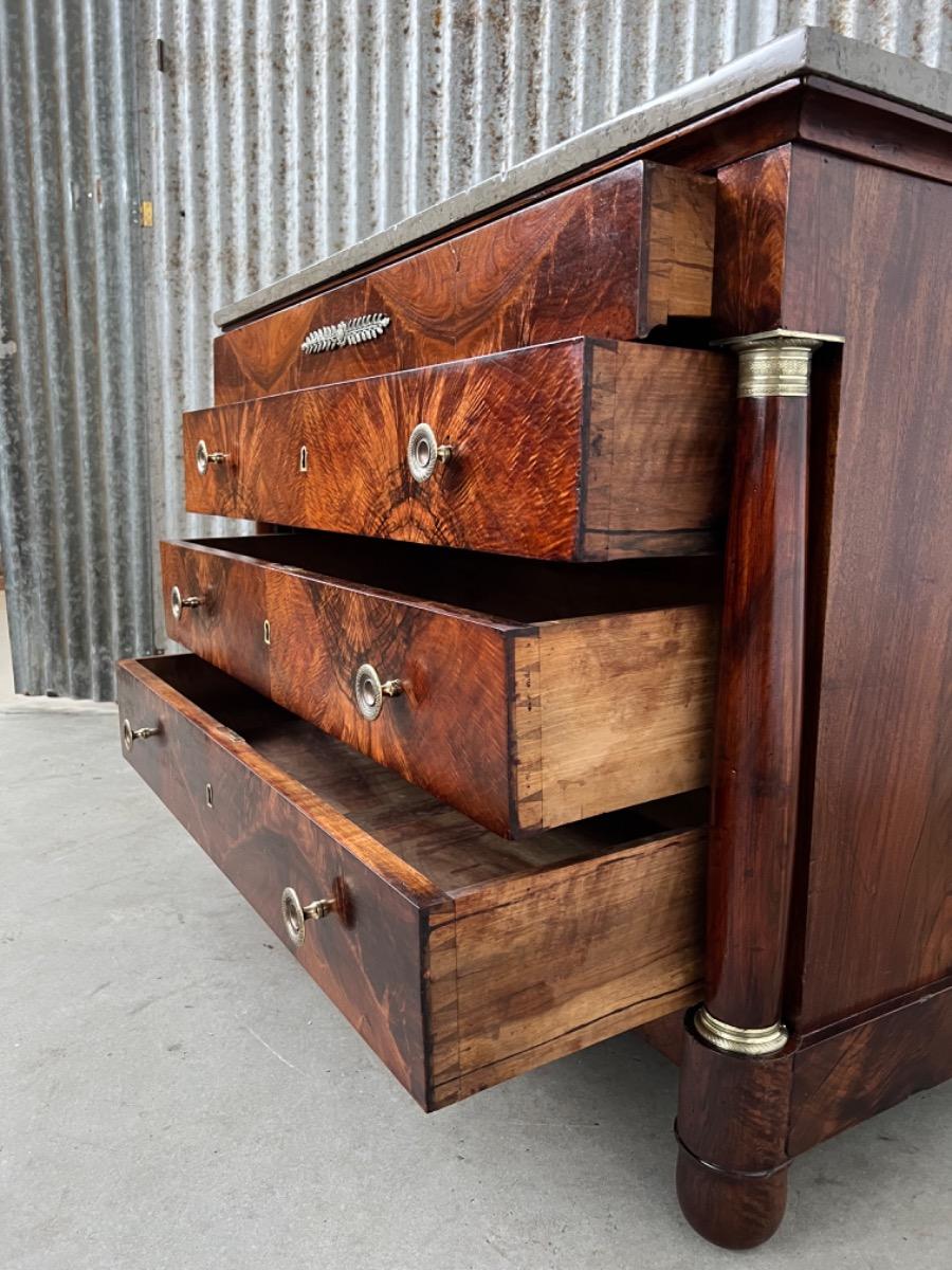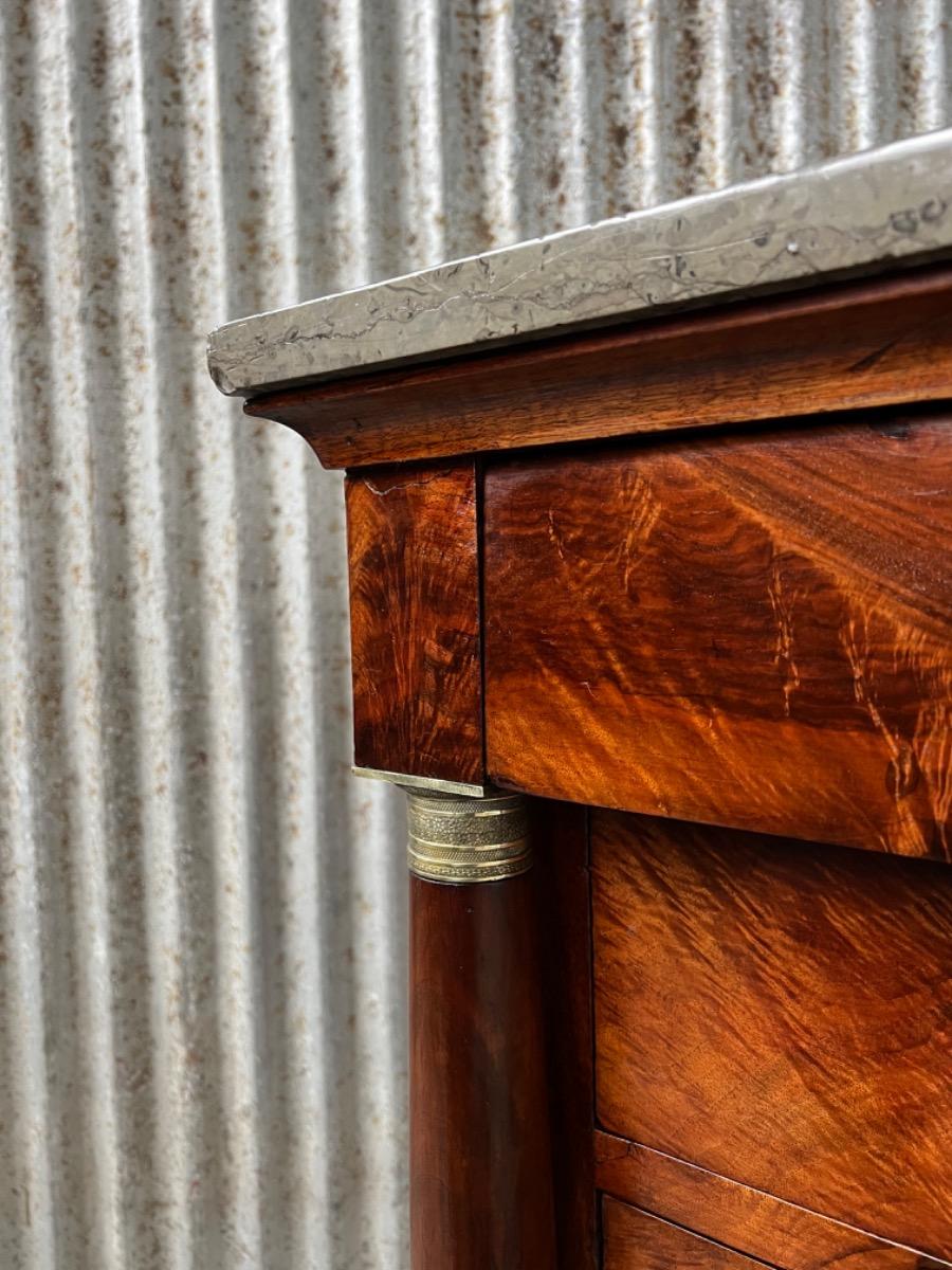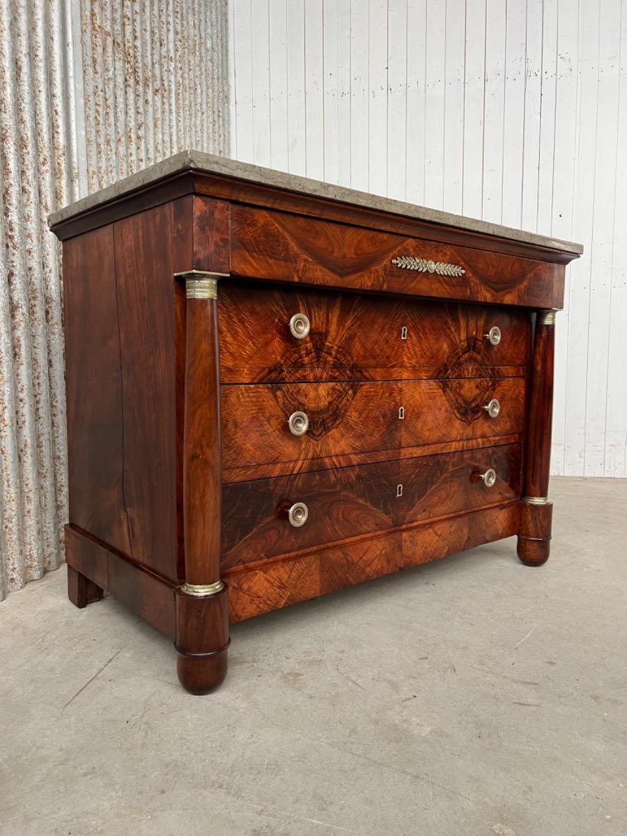 Franse empire ladekast of commode, met fraai over alle laden doorlopend Noten, met het oorspronkelijke dikke (2,5. cm) gekapte Gris Ambrosia marmeren blad.