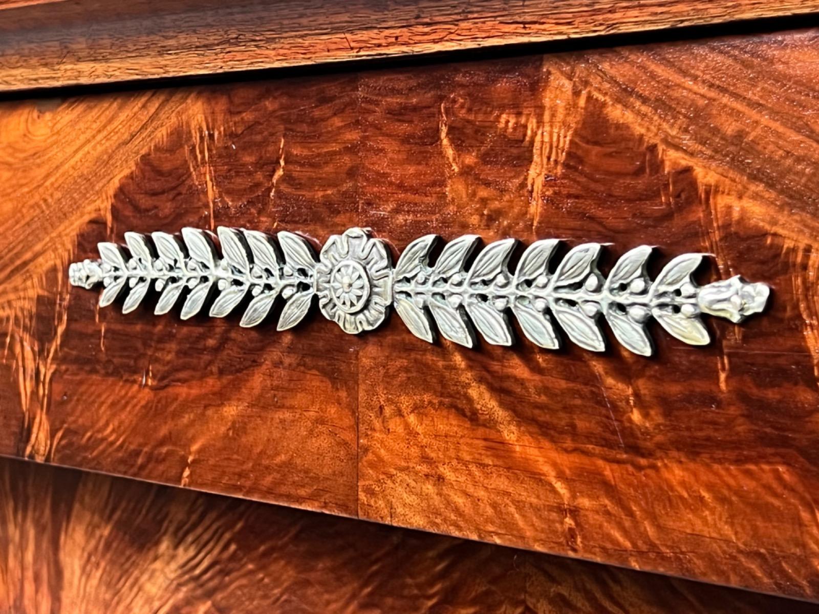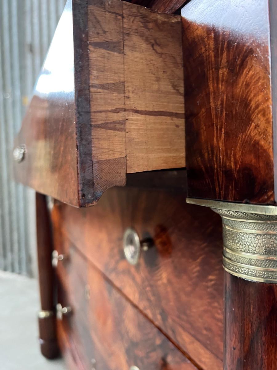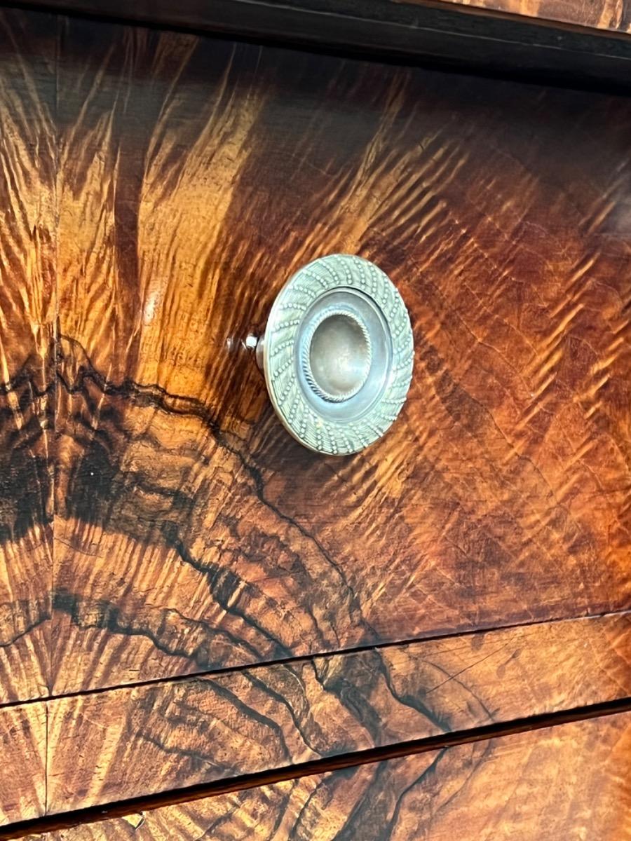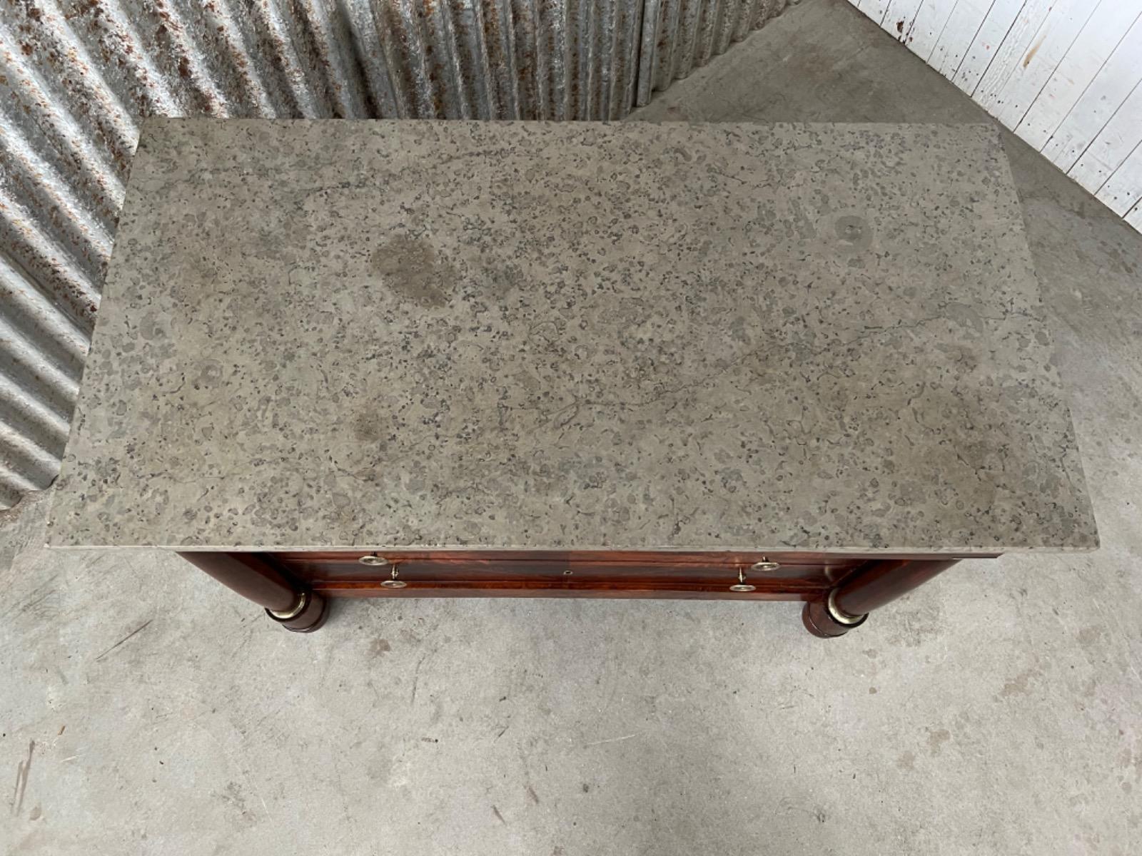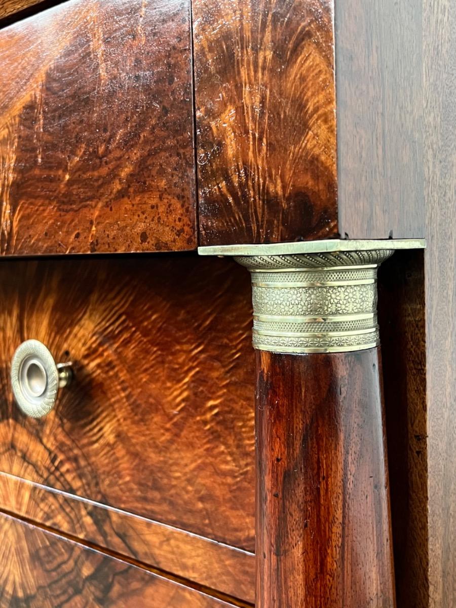 Franse empire ladekast of commode, met fraai over alle laden doorlopend Noten, met het oorspronkelijke dikke (2,5. cm) gekapte Gris Ambrosia marmeren blad.