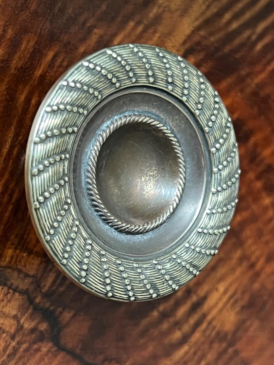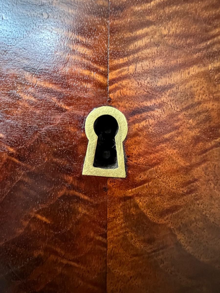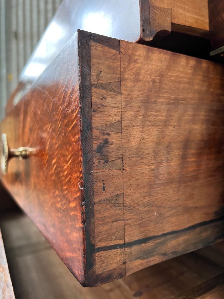 Messing knoppen en schildbeslag op de 3 laden, met op de bovenste lade, dit is een ‘blinde lade’ met twee onzichtbare grepen aan onderzijde van de iets overstekende lade.