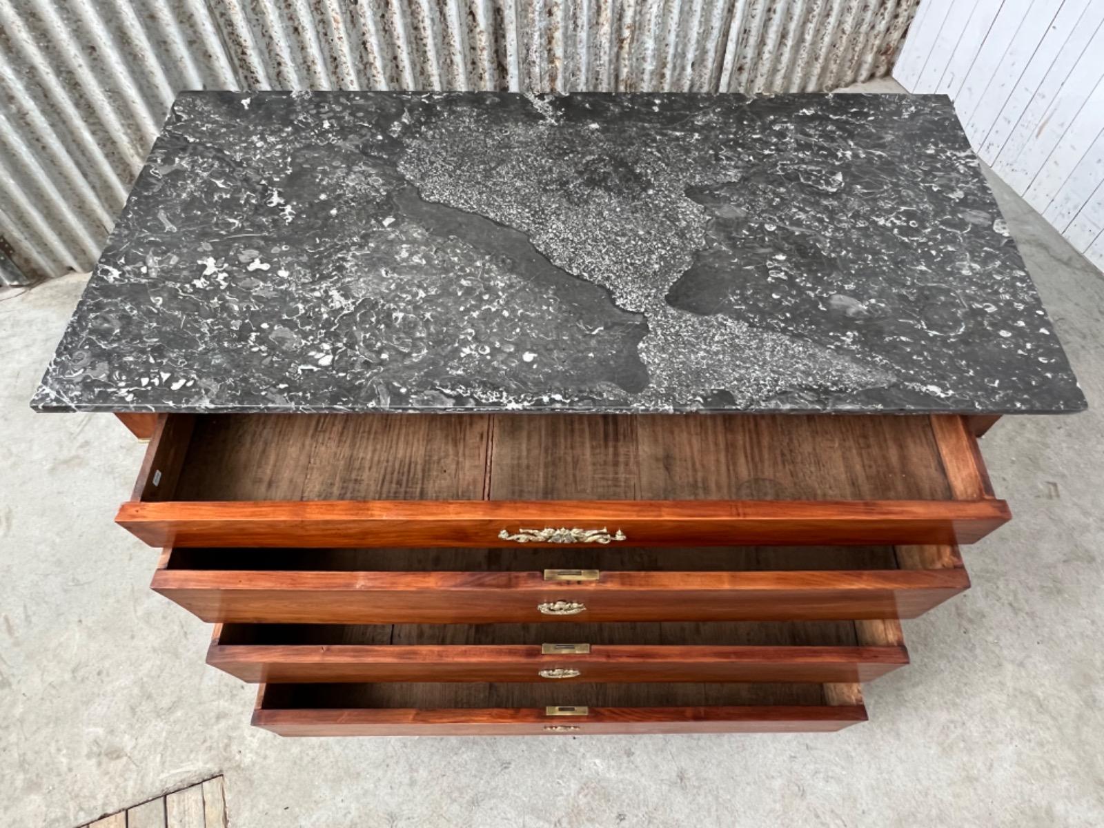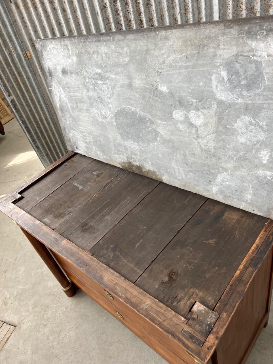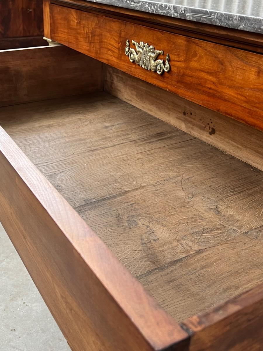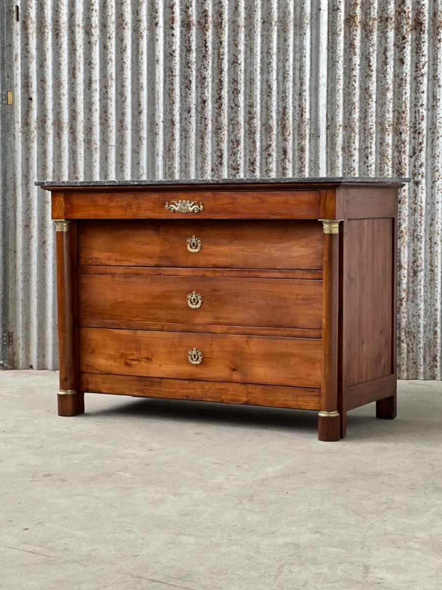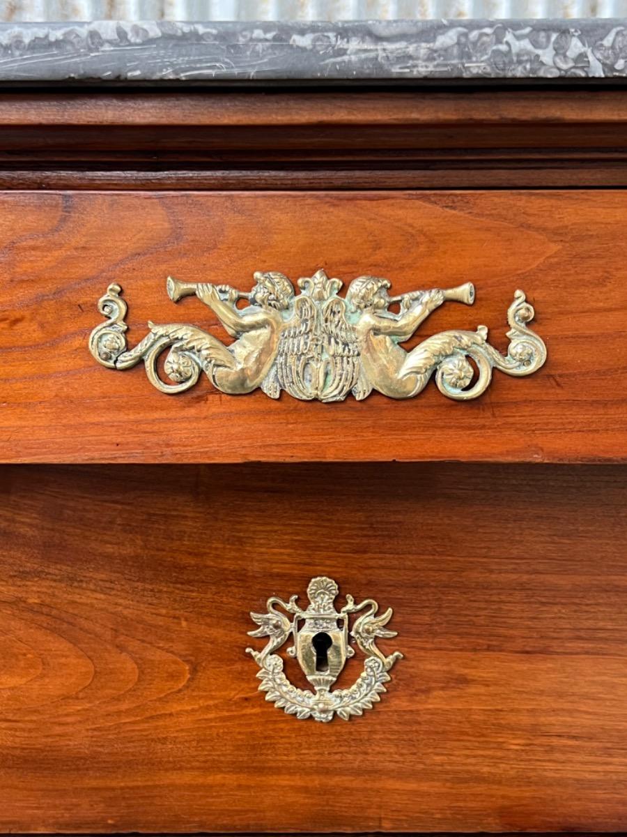 Franse empire ladekast, volle kersenhouten pilaren met oorspronkelijke vuurverguld messing kapitelen. Sloten in de drie onderladen aanwezig, werkend en oorspronkelijk, met daarbij 1 werkende sleutels. Messing schildbeslag op de 3 laden. De bovenste ‘blinde lade’ heeft een enkel massief messing ornament Beide zijden zijn voorzien van een paneel dat vrij kan ‘krimpen en uitzetten’. Marmer gedekt, ‘Gris de Marais’, kleine oude restauratie linker voor hoek. (Zie fotos). Frankrijk, goede kwaliteit, omstreeks 1800 - 1815 Afm: H= 90 cm. B= 118 - 122 cm. (min. - max. maten) D= 50 - 61 cm. (min. - max. maten) Onlangs grondig nagelopen op losse delen van constructie en fineer. Geen active houtworm aangetroffen op 18/7/2024 comm-2768~