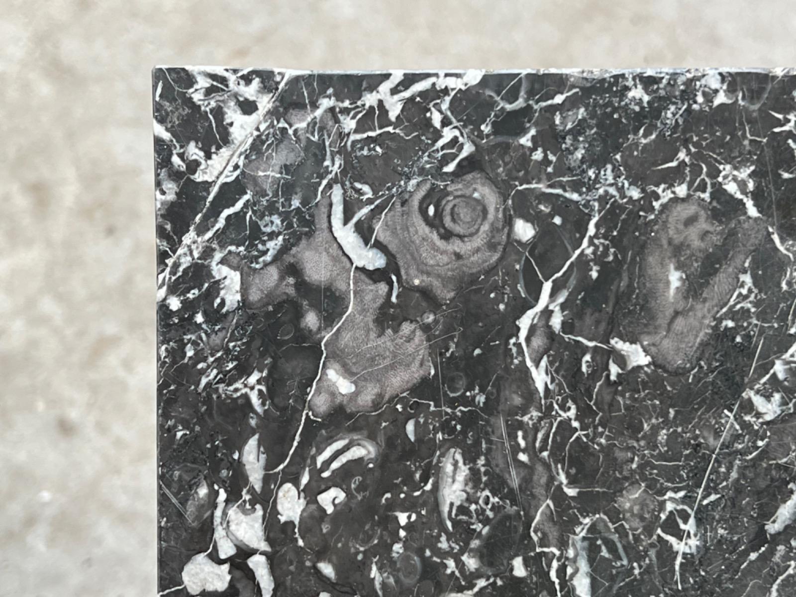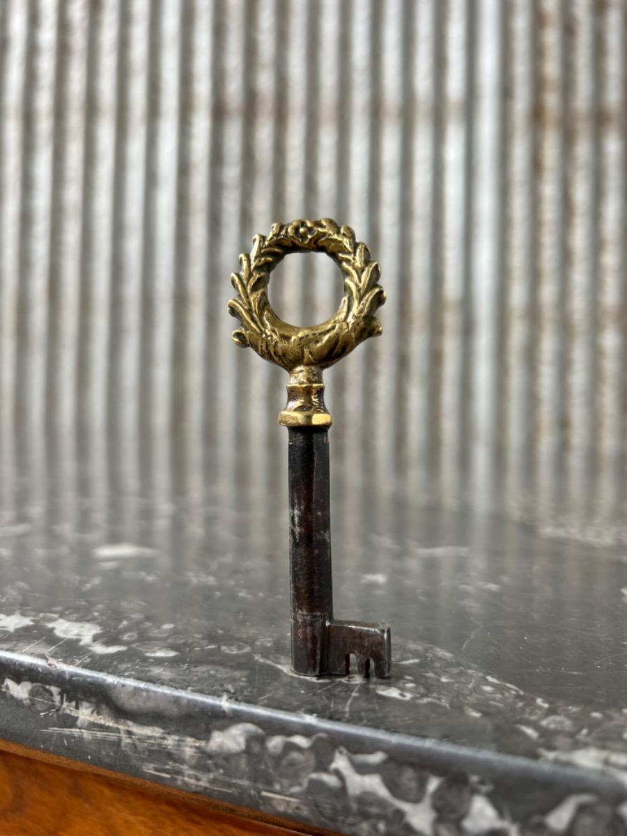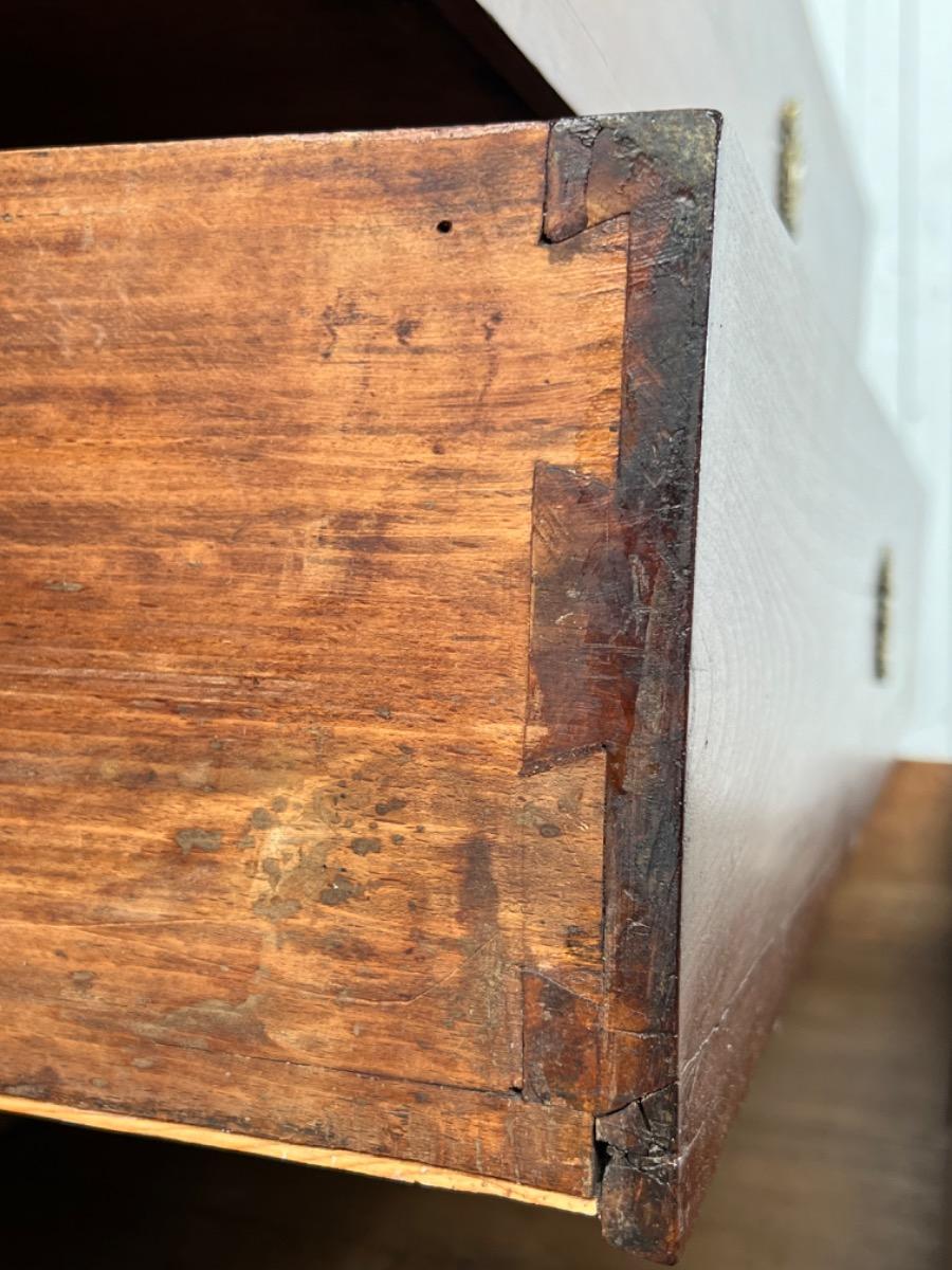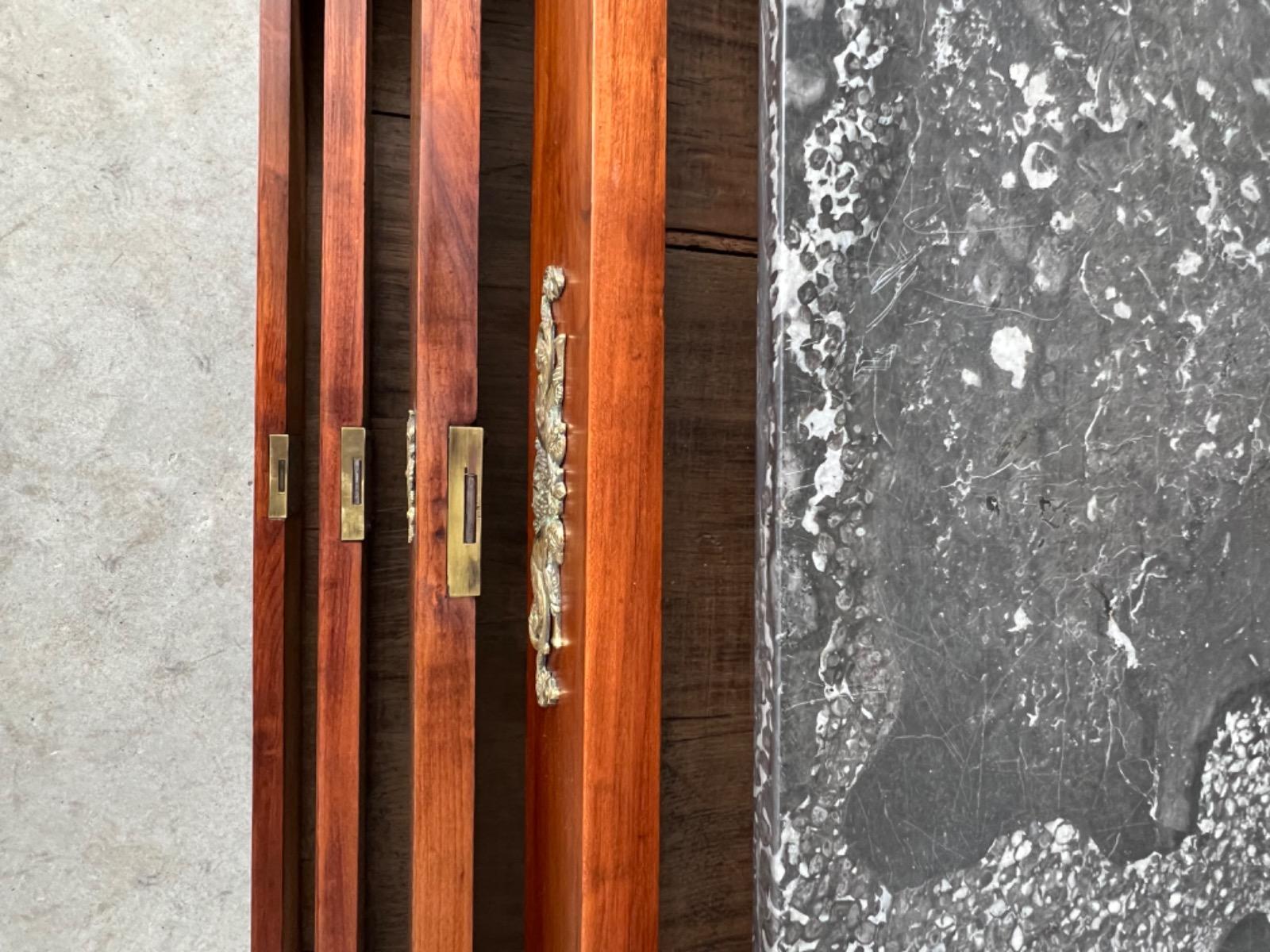 Franse empire ladekast, volle kersenhouten pilaren met oorspronkelijke vuurverguld messing kapitelen. Sloten in de drie onderladen aanwezig, werkend en oorspronkelijk, met daarbij 1 werkende sleutels. Messing schildbeslag op de 3 laden. De bovenste ‘blinde lade’ heeft een enkel massief messing ornament Beide zijden zijn voorzien van een paneel dat vrij kan ‘krimpen en uitzetten’. Marmer gedekt, ‘Gris de Marais’, kleine oude restauratie linker voor hoek. (Zie fotos). Frankrijk, goede kwaliteit, omstreeks 1800 - 1815 Afm: H= 90 cm. B= 118 - 122 cm. (min. - max. maten) D= 50 - 61 cm. (min. - max. maten) Onlangs grondig nagelopen op losse delen van constructie en fineer. Geen active houtworm aangetroffen op 18/7/2024 comm-2768~