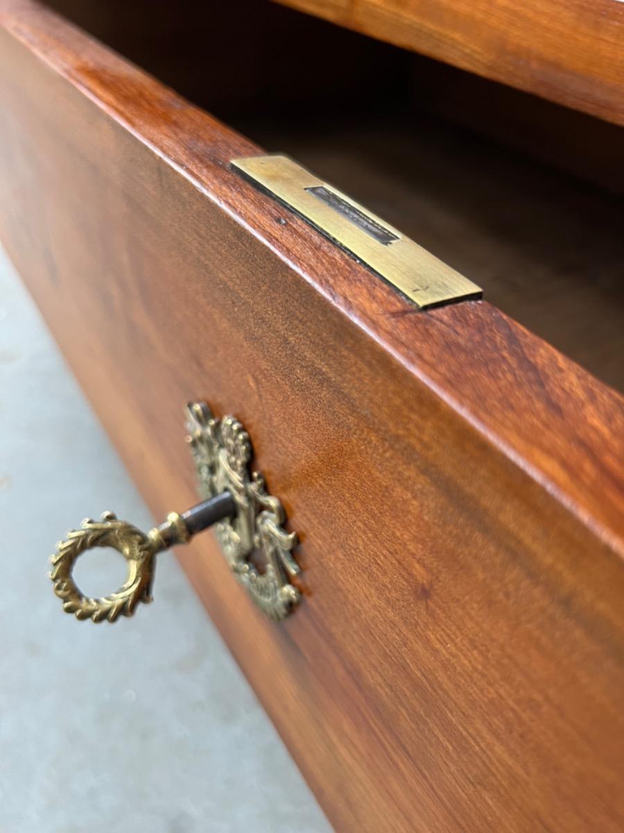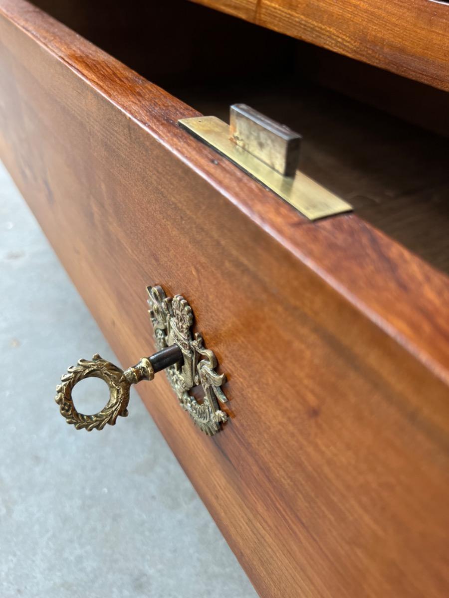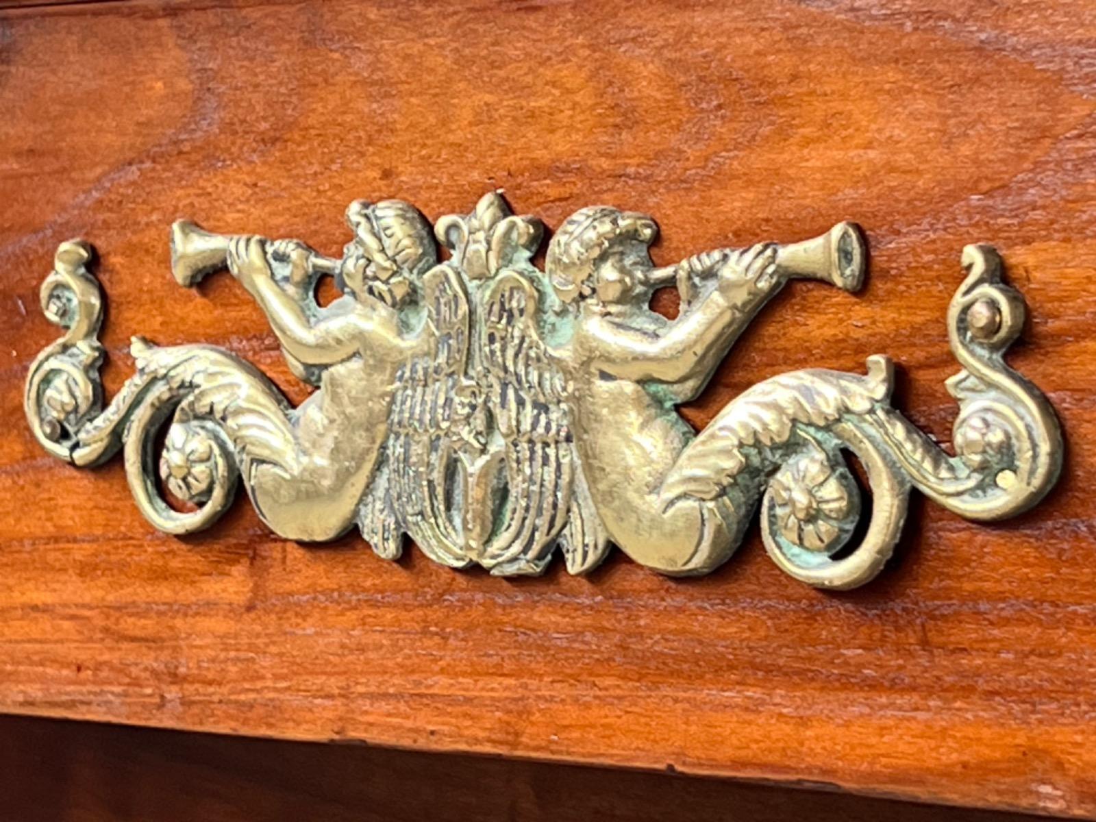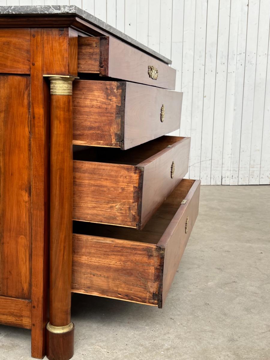 Franse kersenhouten empire ladekast, volle kersenhouten pilaren met oorspronkelijke vuurverguld messing kapitelen.