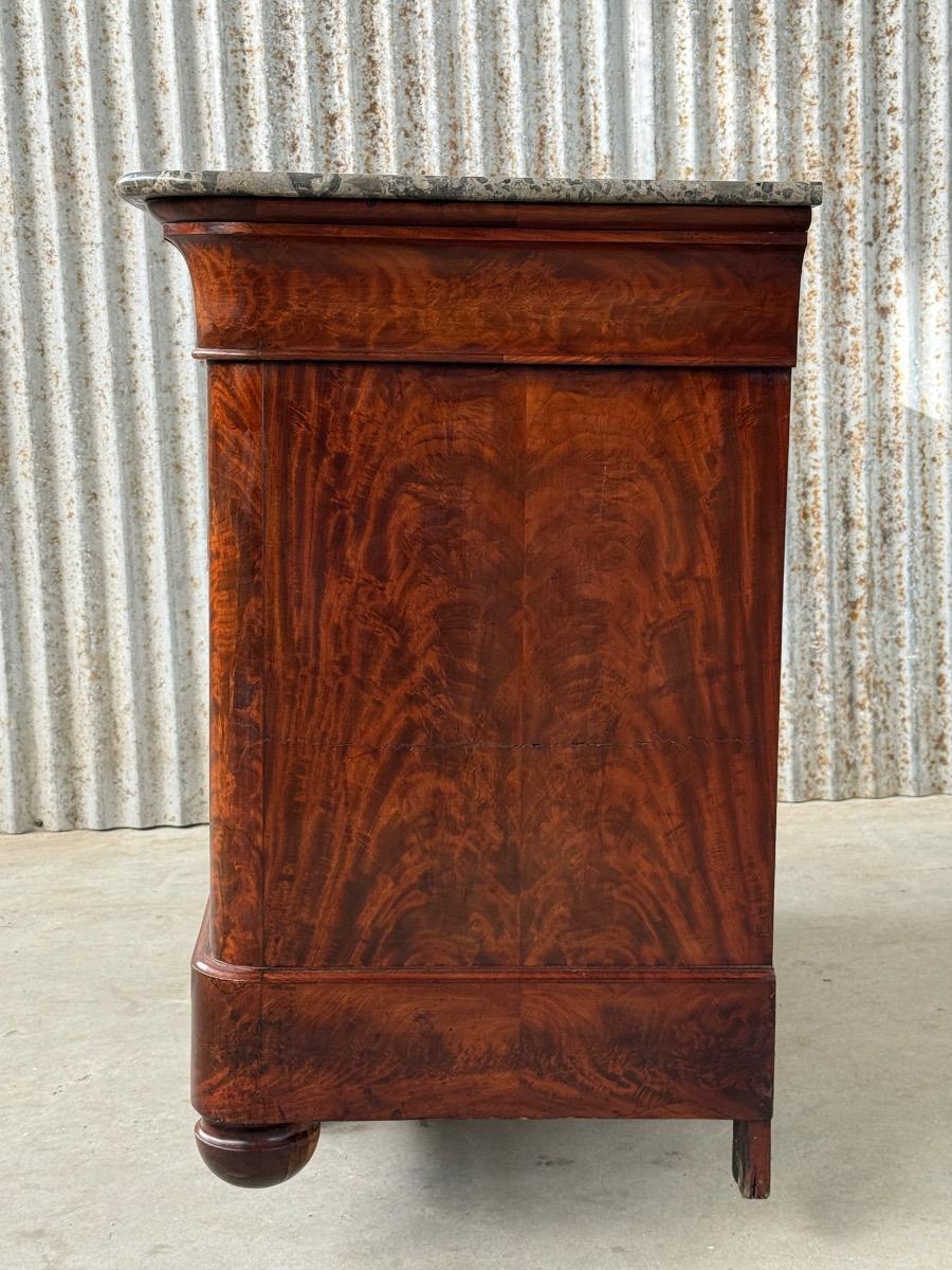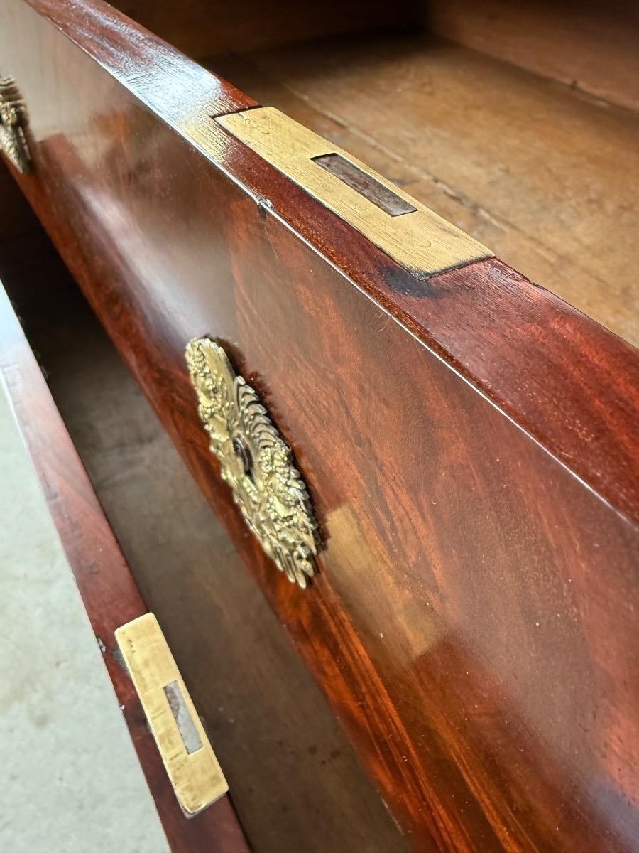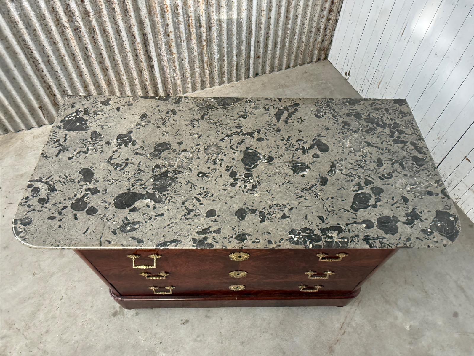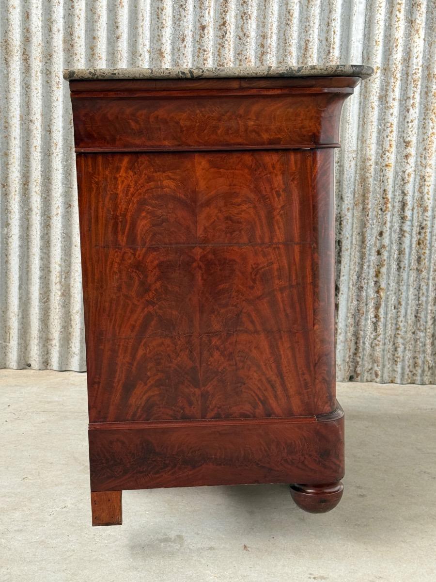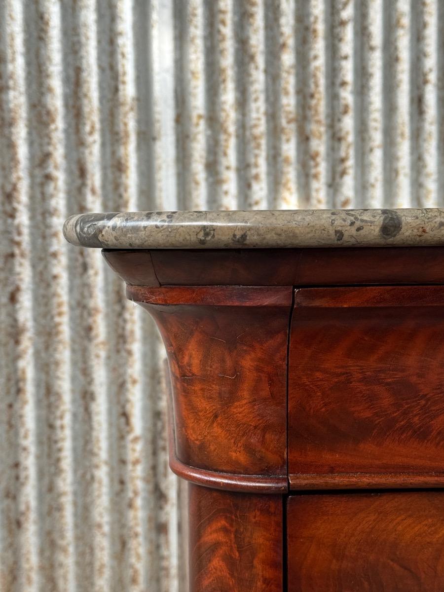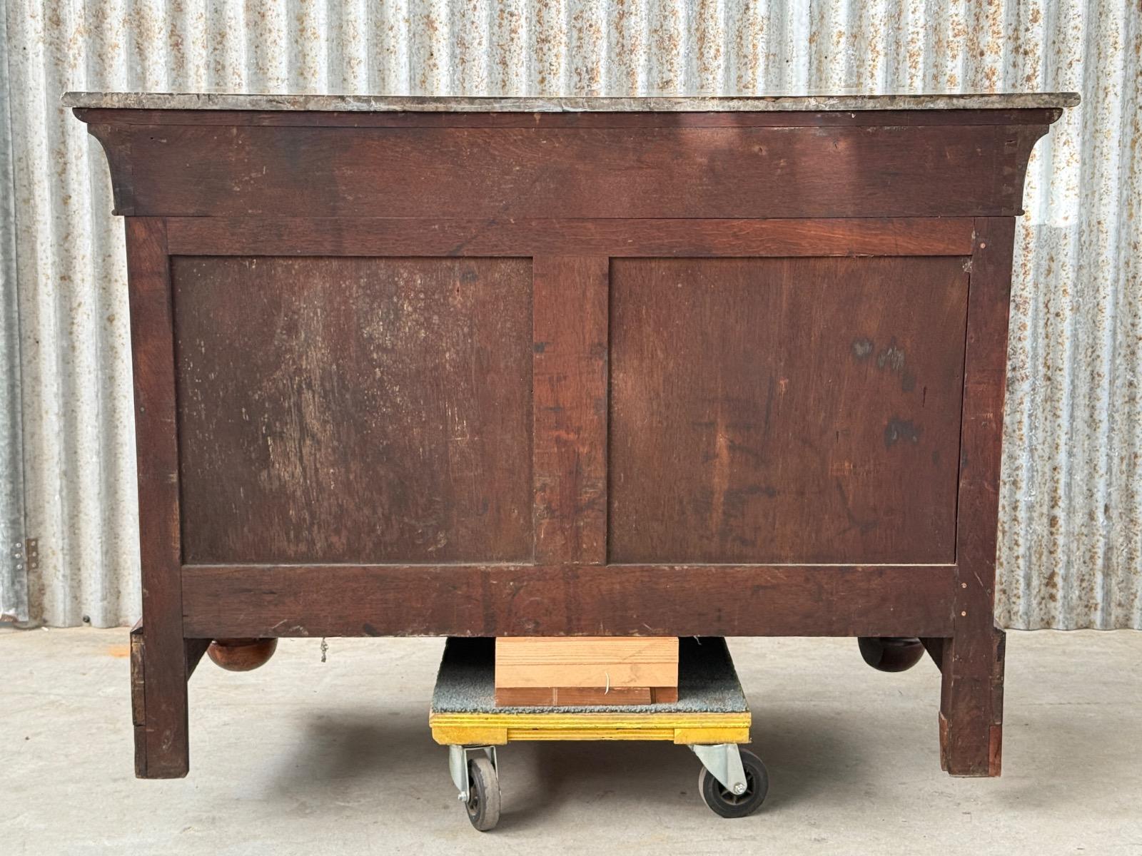Ladekast of commode met 4 laden, eerste helft 19e eeuw. Met messing entré beslag, alle sloten aanwezig maar zonder sleutel. Uniek en zeer fraai lade beslag / lade trekkers. Vuur verguld gegoten messing. Fineer aan voorzijden mooi doorlopend patroon van mahonie fineer op alle laden. Achterwand gemaakt van 2 panelen in frame. zijden ongescheurd. Geheel gedekt met "Gris de Marais marmer" dat gebroken is geweest maar goed stevig en netjes gelijmd. Zie de uitgebreide foto’s. In zeer goede en direct te gebruiken staat. Frankrijk Ca. 1820-1840 Afm: H= 94 cm. B= 116 - 130,5 cm. ( smalst - breedst ) D= 53 - 61 cm. ( ondiepst - diepst ) Onlangs grondig nagelopen op losse delen van constructie en fineer. Houtworm controle : Geen levende houtworm aangetroffen op 10/12/2025 Comm-3019~