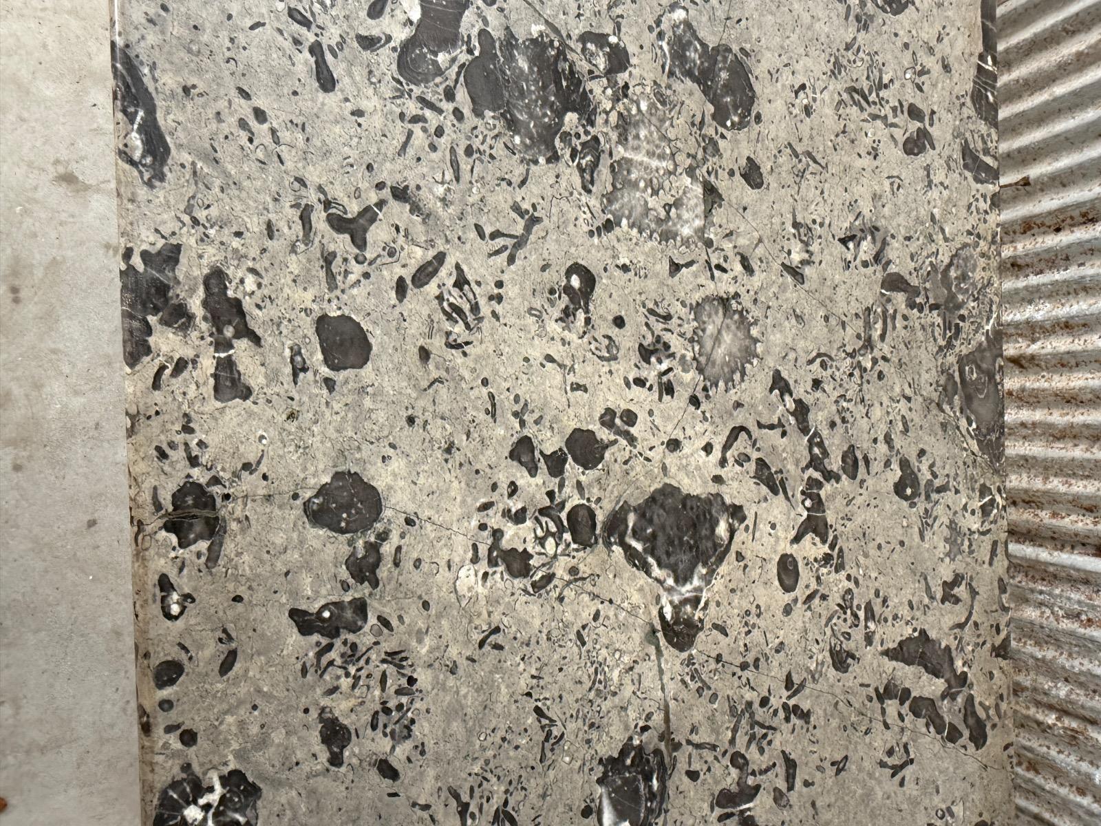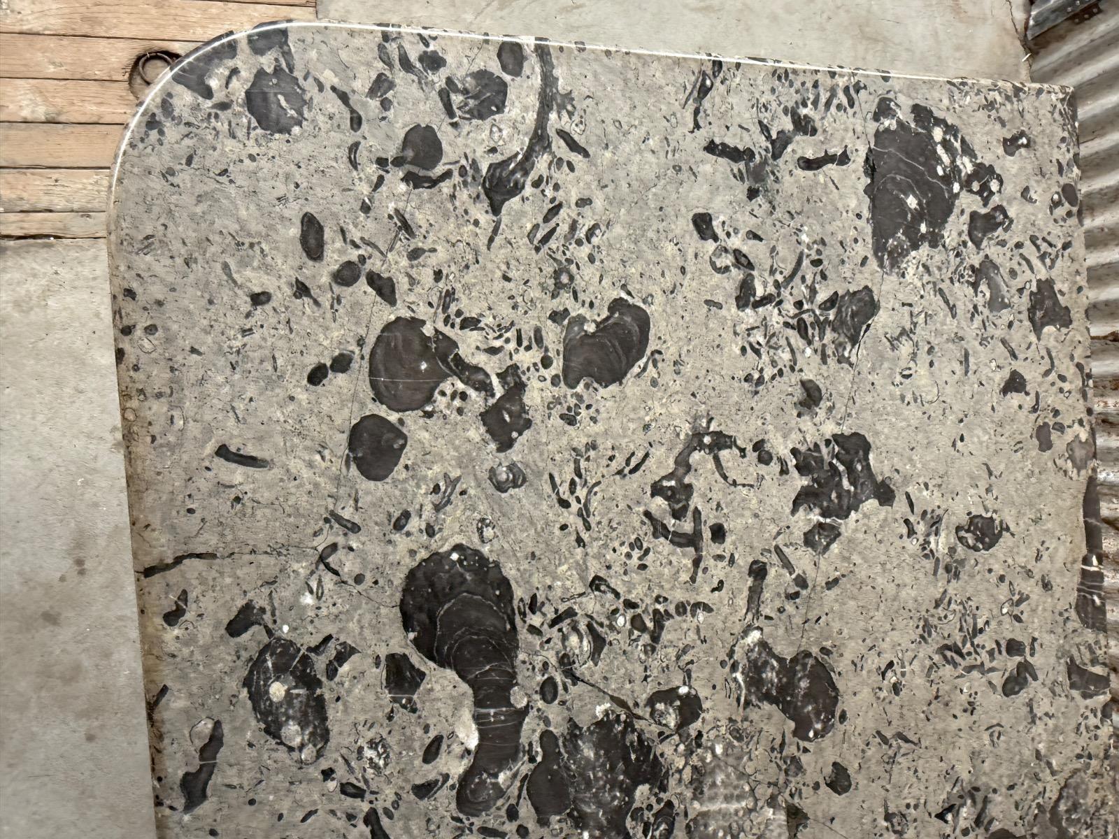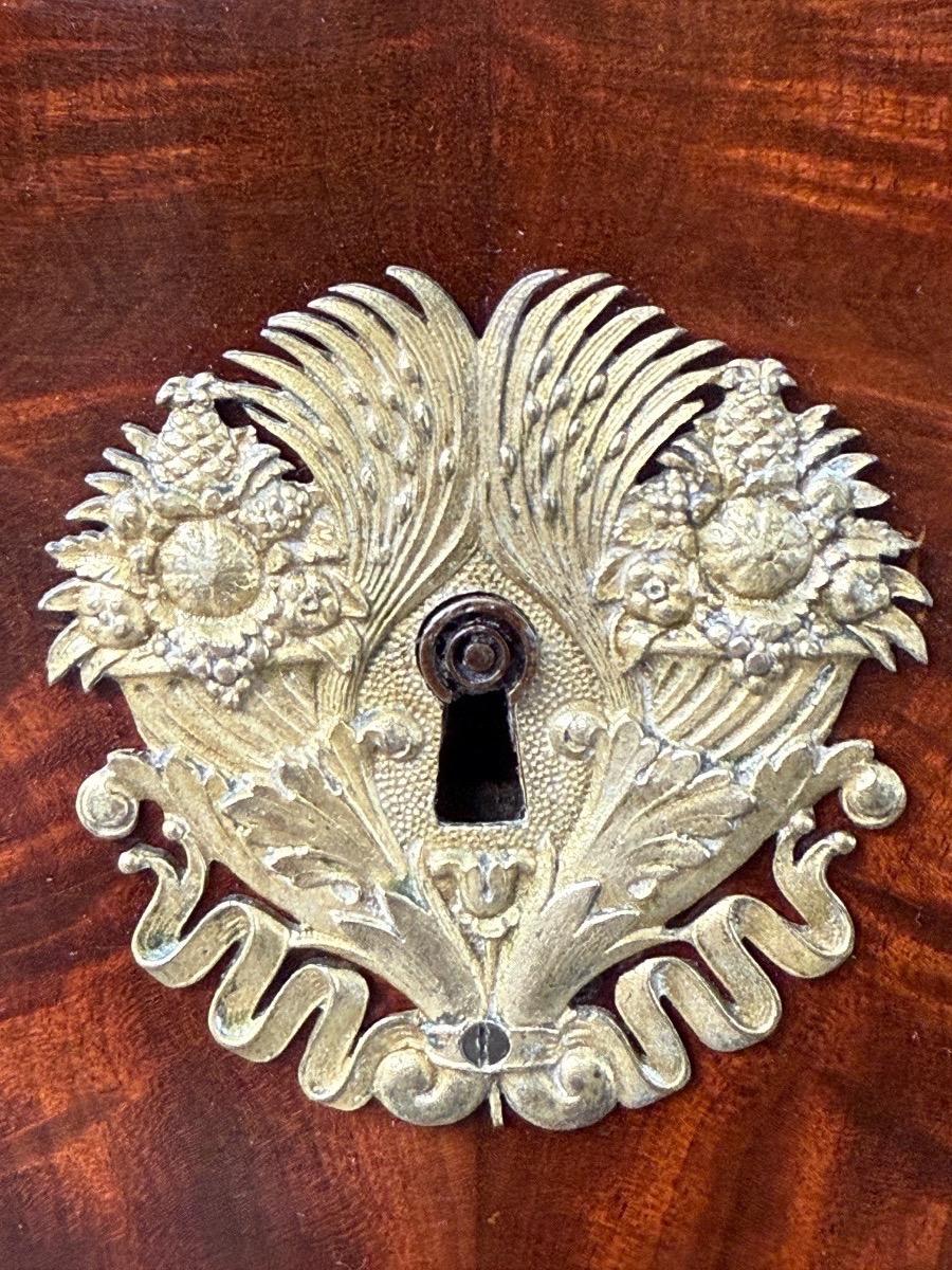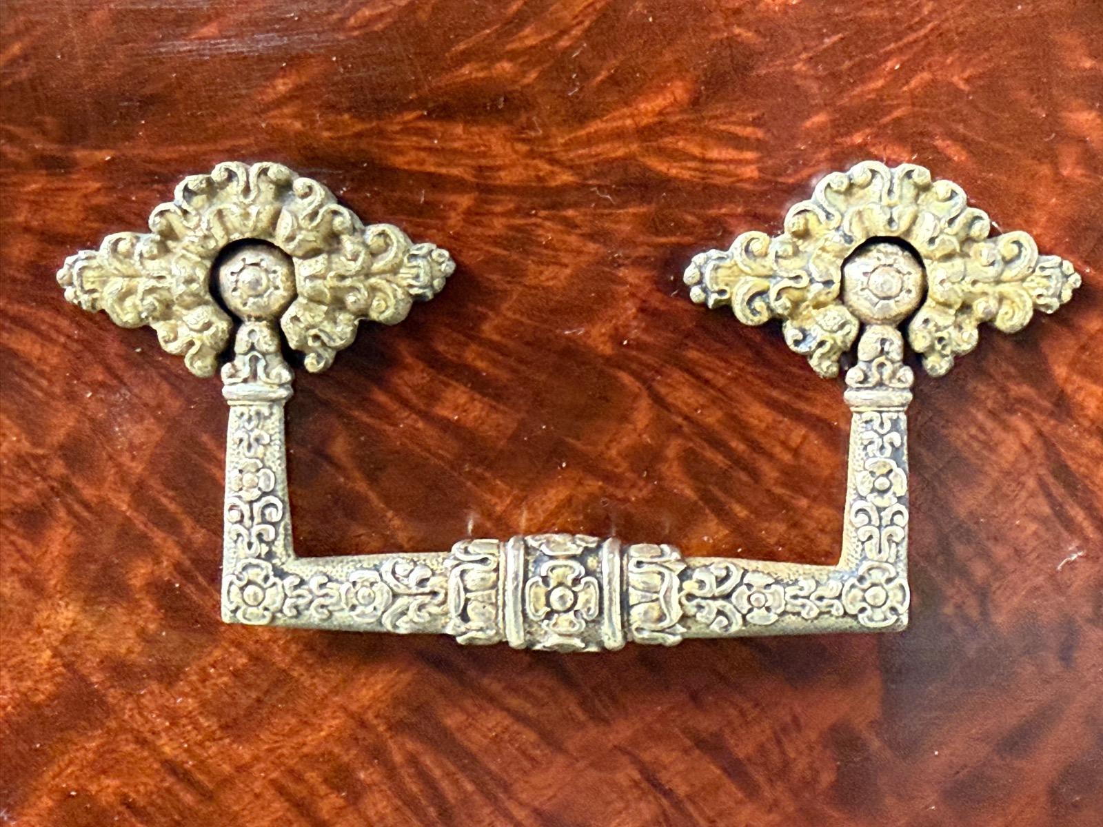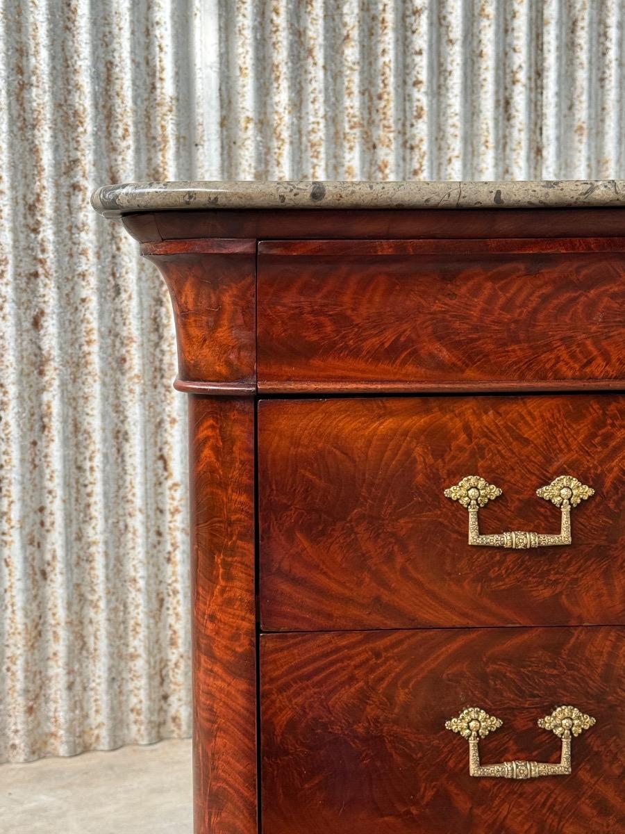 Ladekast of commode met 4 laden, eerste helft 19e eeuw. Met messing entré beslag, alle sloten aanwezig maar zonder sleutel. Uniek en zeer fraai lade beslag / lade trekkers. Vuur verguld gegoten messing. Fineer aan voorzijden mooi doorlopend patroon van mahonie fineer op alle laden. Achterwand gemaakt van 2 panelen in frame. zijden ongescheurd. Geheel gedekt met "Gris de Marais marmer" dat gebroken is geweest maar goed stevig en netjes gelijmd. Zie de uitgebreide foto’s. In zeer goede en direct te gebruiken staat. Frankrijk Ca. 1820-1840 Afm: H= 94 cm. B= 116 - 130,5 cm. ( smalst - breedst ) D= 53 - 61 cm. ( ondiepst - diepst ) Onlangs grondig nagelopen op losse delen van constructie en fineer. Houtworm controle : Geen levende houtworm aangetroffen op 10/12/2025 Comm-3019~