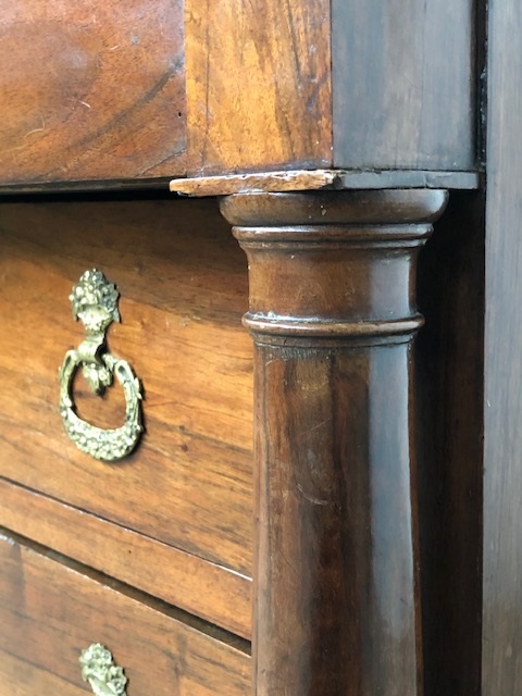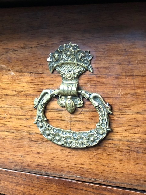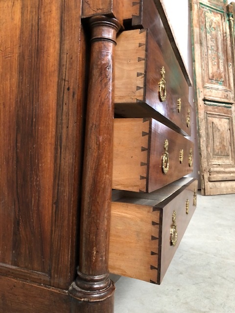 Volle pilaren met oorspronkelijke messing kapitelen en messing schildbeslag op de 3 laden.
