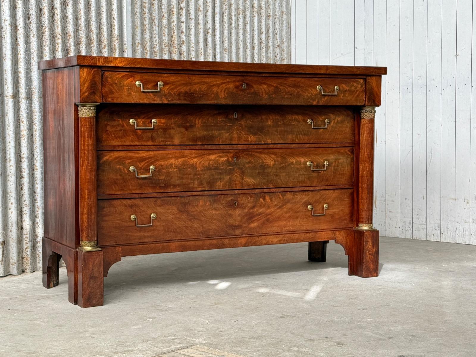 Mahonie Directoire 4 laads ladekast of commode met (al) volle pilaren, gegoten messing beslag.