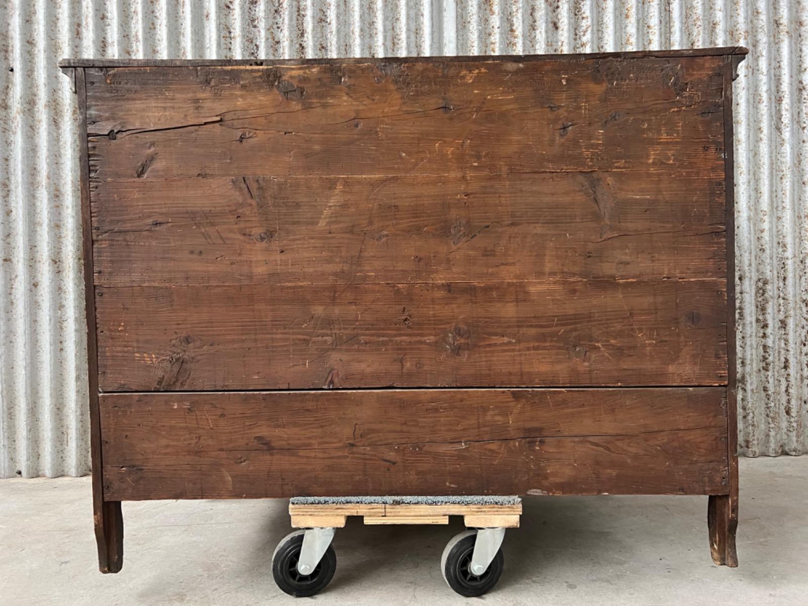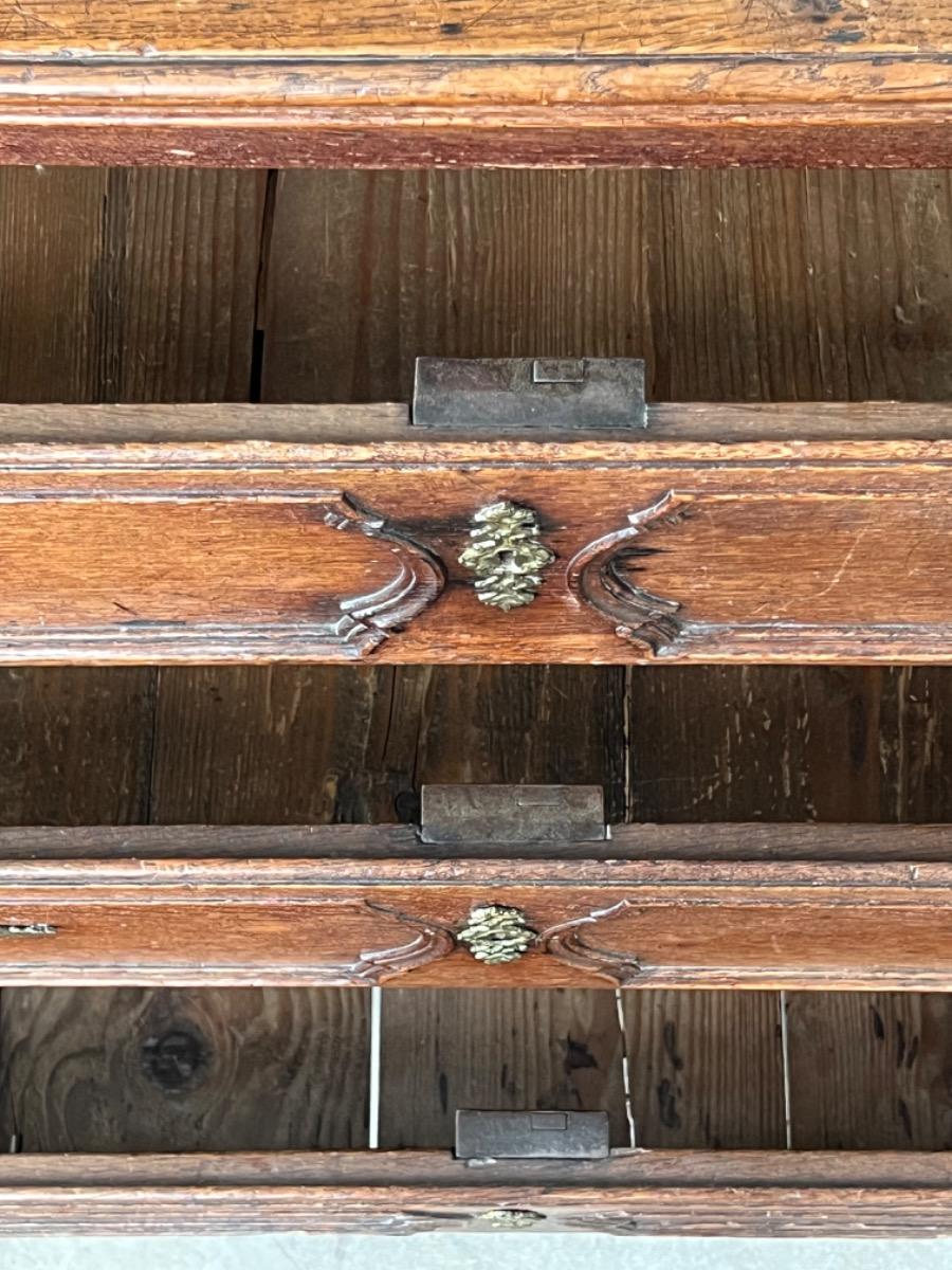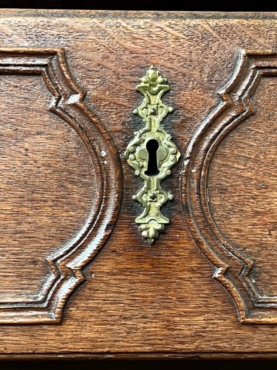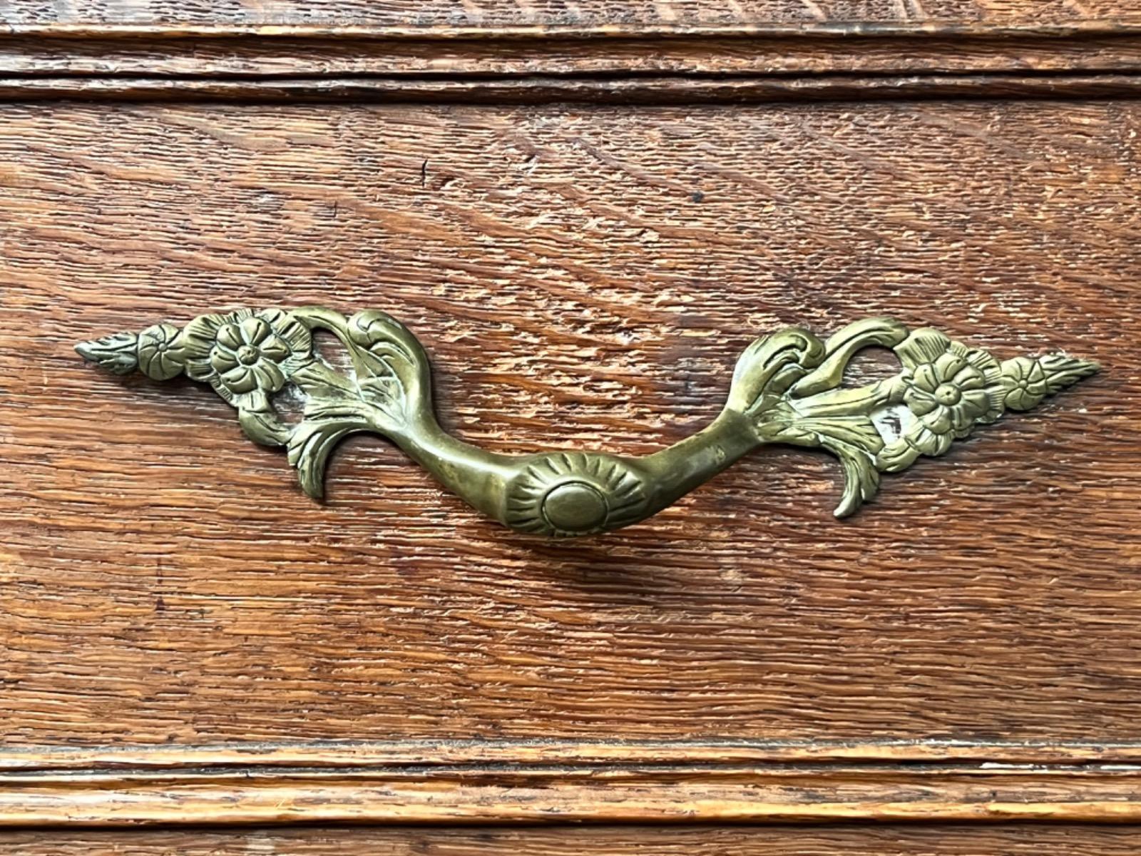 1 messing handvat (boven lade links) is later in de 18e eeuw na gegoten. De andere 5 zijn origineel uit de tijd en oorspronkelijk bij dit meubel.