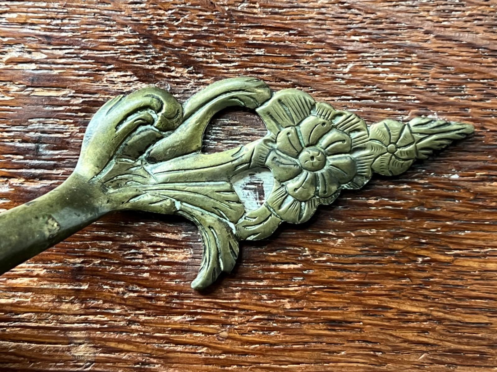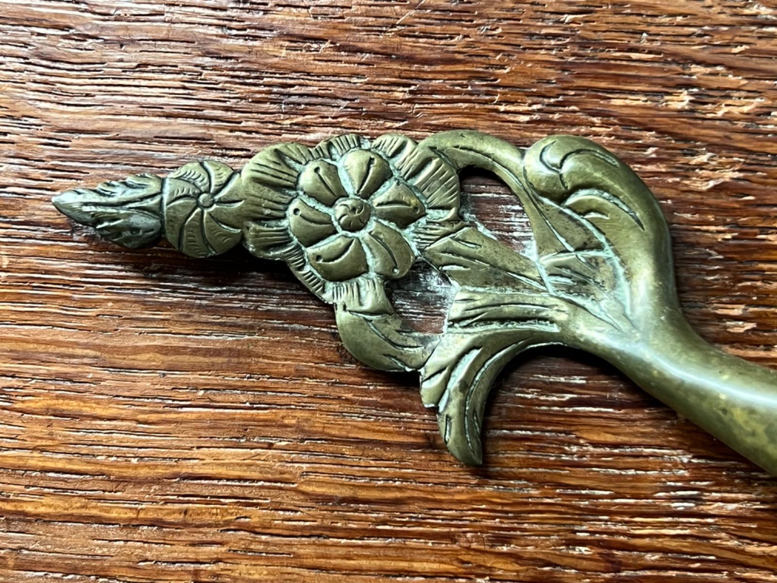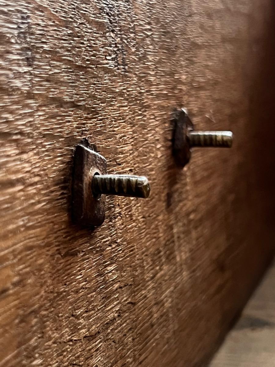 1 messing handvat (boven lade links) is later in de 18e eeuw na gegoten. De andere 5 zijn origineel uit de tijd en oorspronkelijk bij dit meubel.