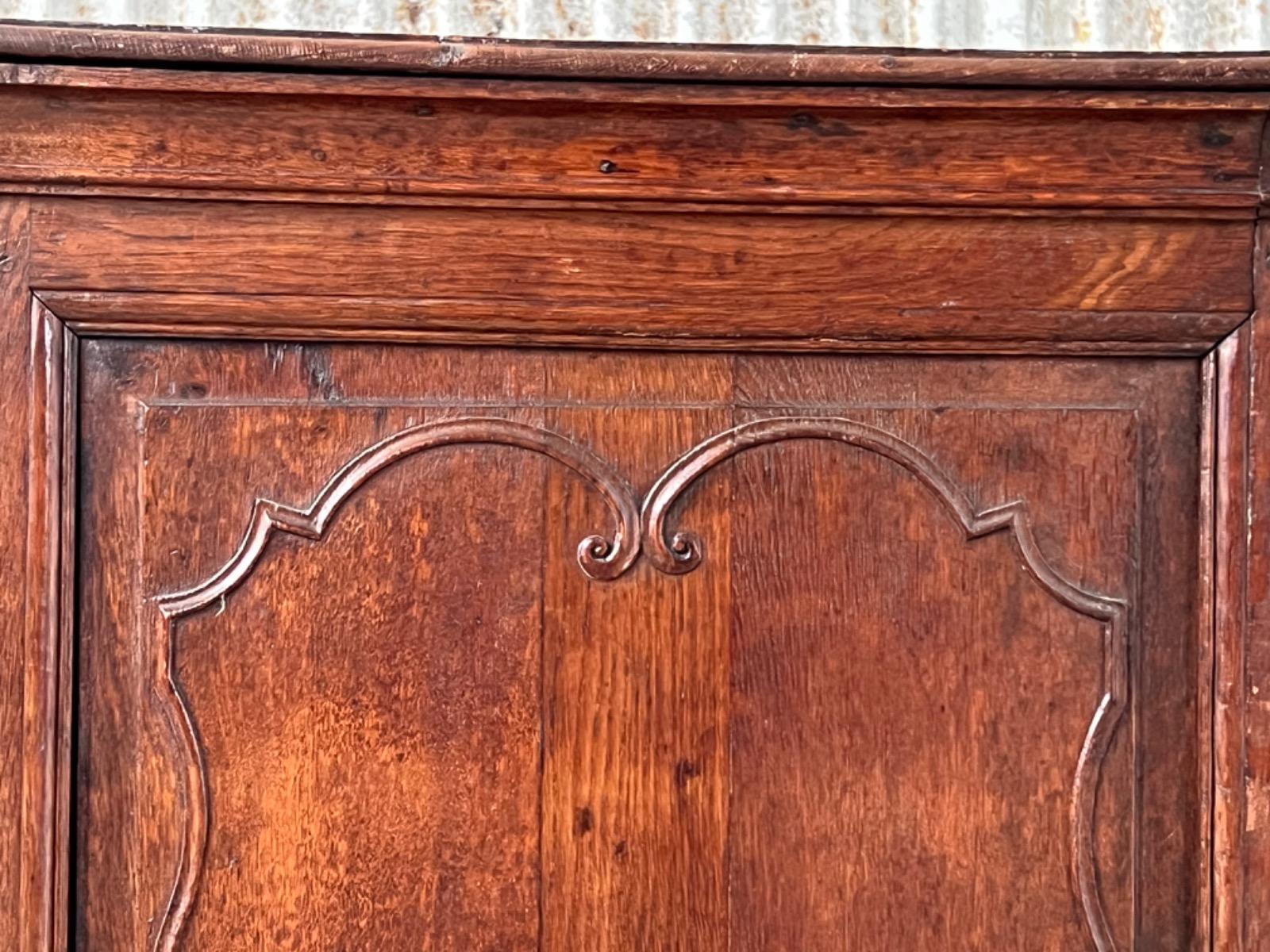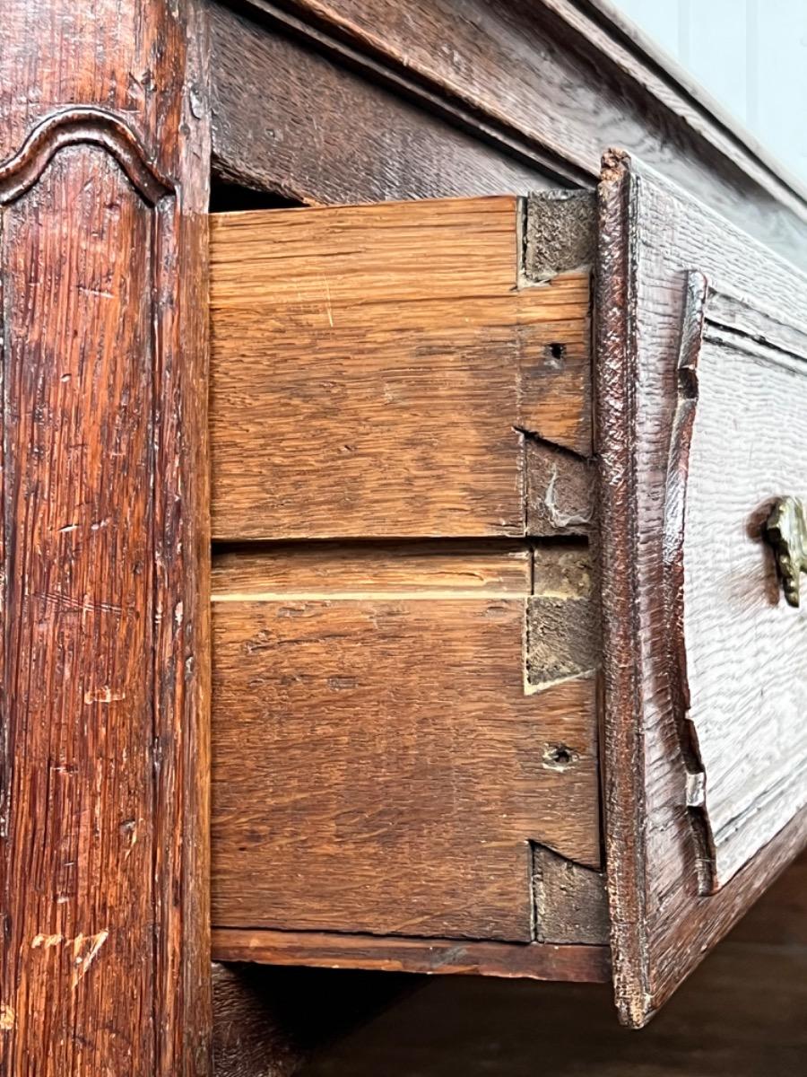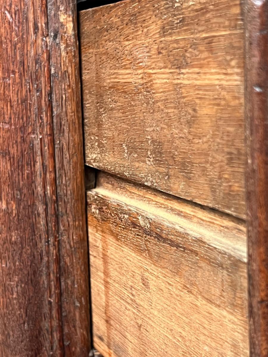 Geen scheuren in de gepaneelde zijden, met decoratief snijwerken. Massief eiken blad, mooie was patina, goede kwaliteit. Laden lopen goed en de lade bodems zijn ook uit de tijd. Van voren naar achter gelegd. Lade front uiteraard met zwaluwstaart verbindingen.