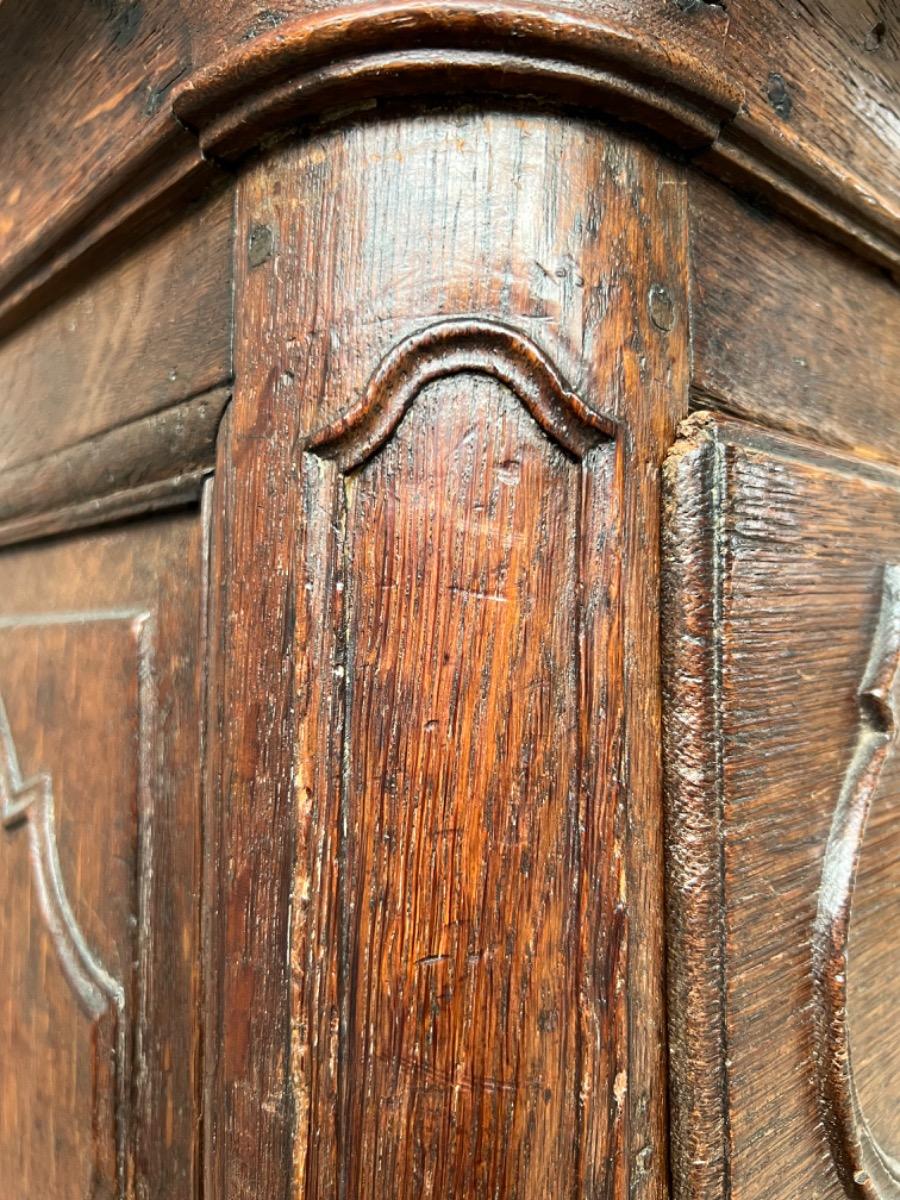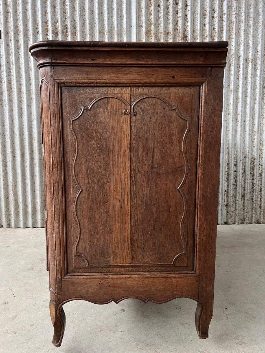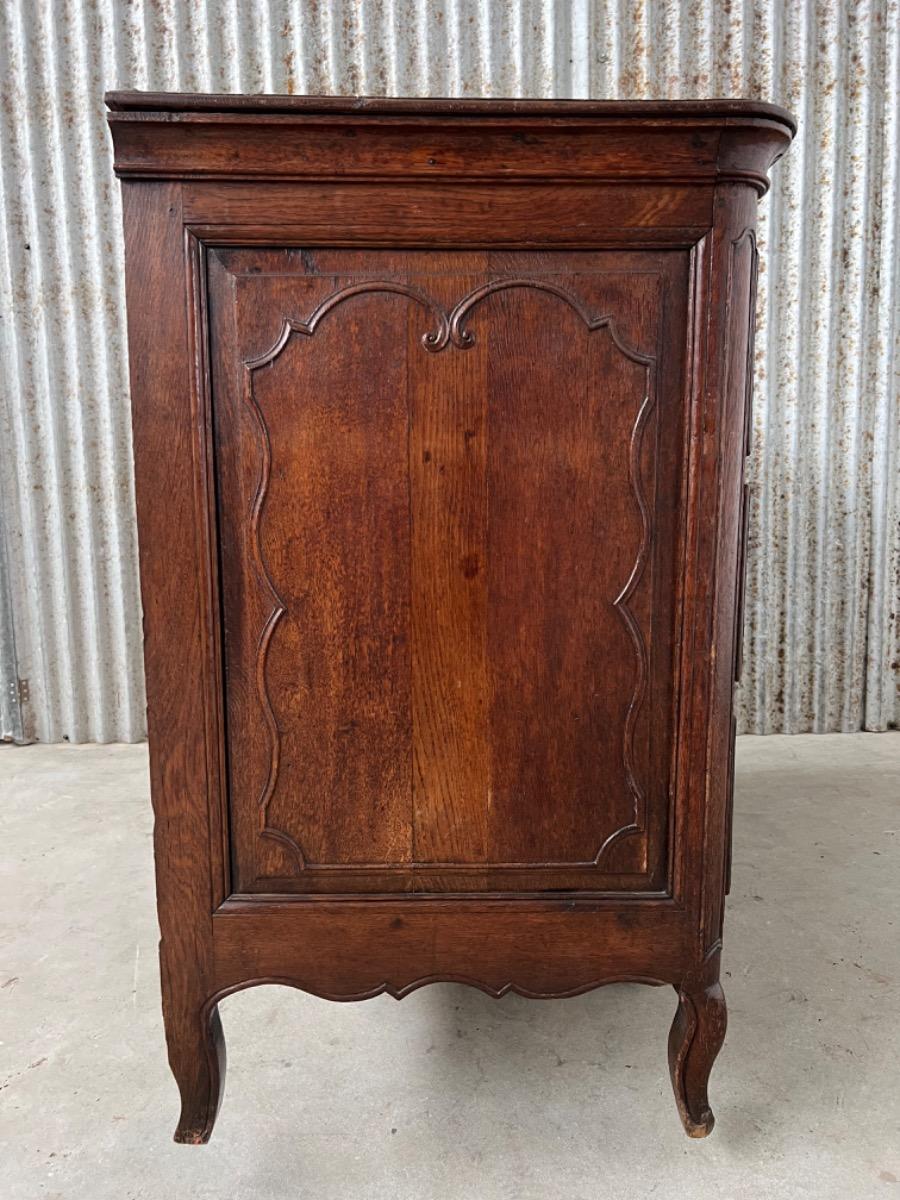 Geen scheuren in de gepaneelde zijden, met decoratief snijwerken. Massief eiken blad, mooie was patina, goede kwaliteit. Laden lopen goed en de lade bodems zijn ook uit de tijd. Van voren naar achter gelegd. Lade front uiteraard met zwaluwstaart verbindingen.