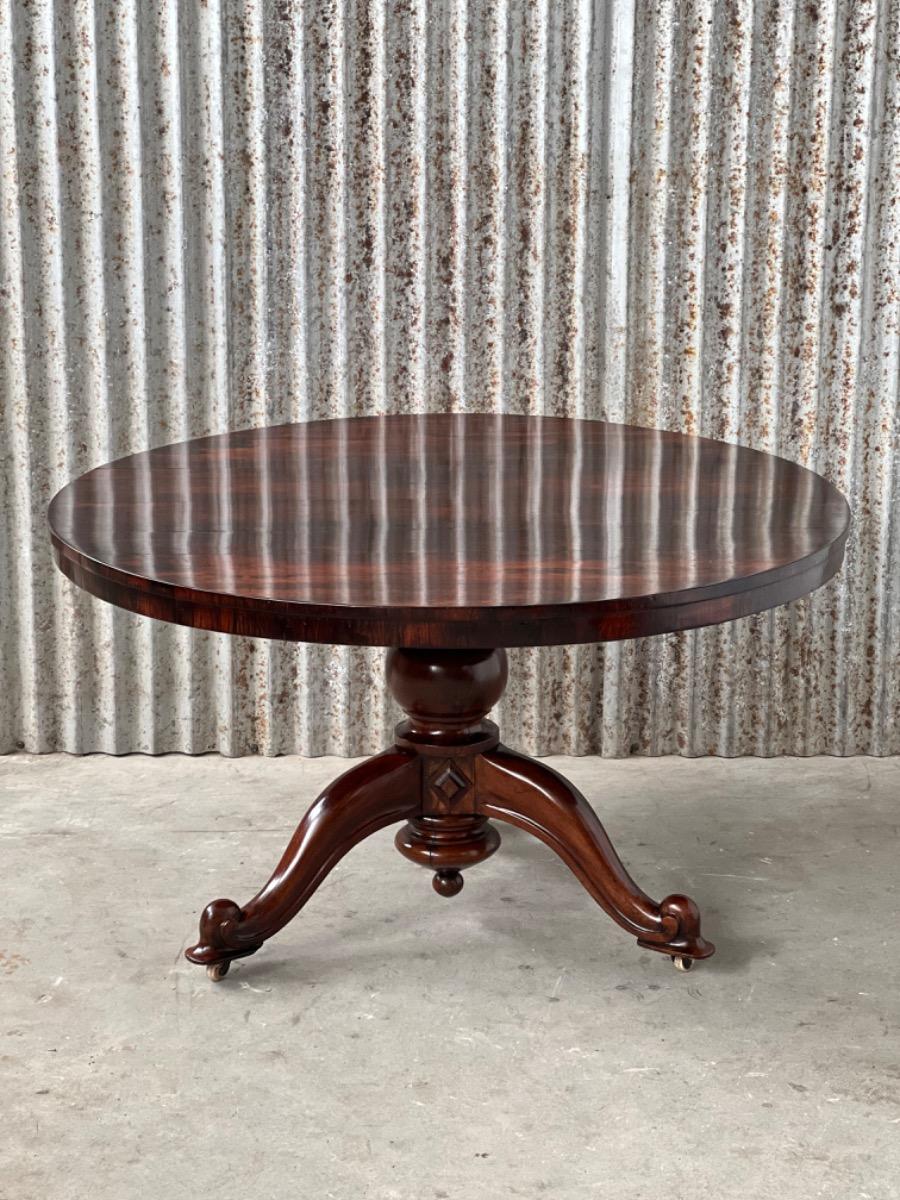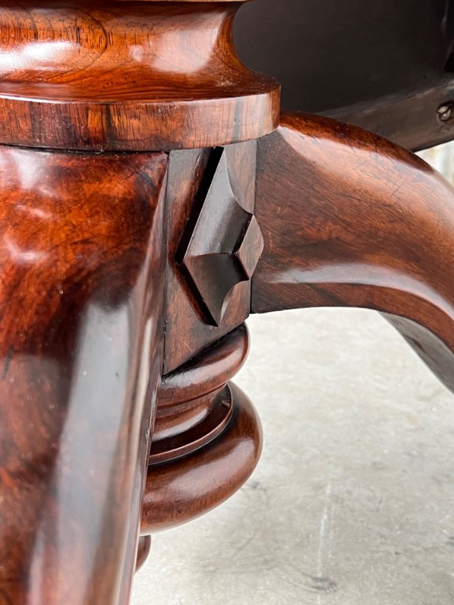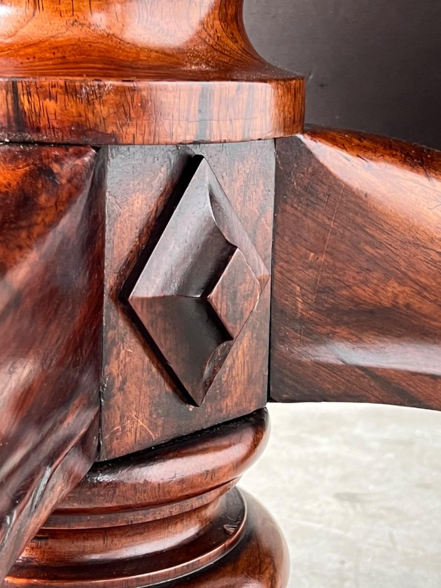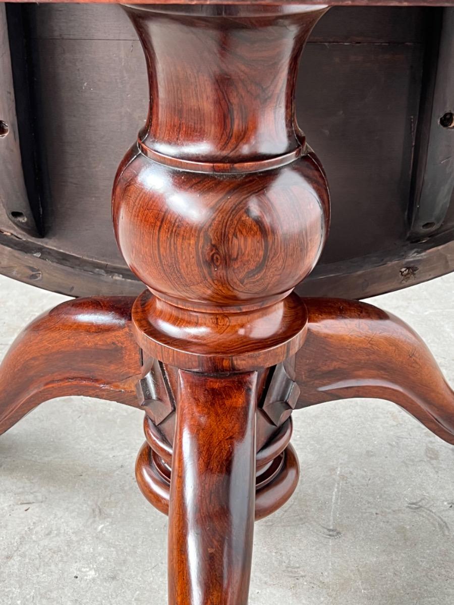 Engelse ‘tilttop’ table me groot palisander hout gefineerd blad. Massief Rio palissander centrale poot met 3 tenen. Gedecoreerd met gedetailleerd ruitvormig snij en steekwerk. Zeer fraaie hand gepolitoerde patina. Engeland ca. 1820 - 1830 Afm; H= 74 cm. ( 153 cm. Opgeklapt blad) Diameter= 129 cm. Houtworm controle; Geen actieve houtworm gevonden 5/5/2023 Taf-2606~