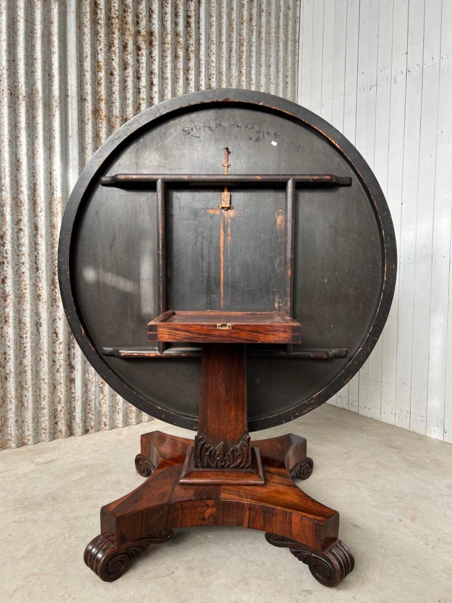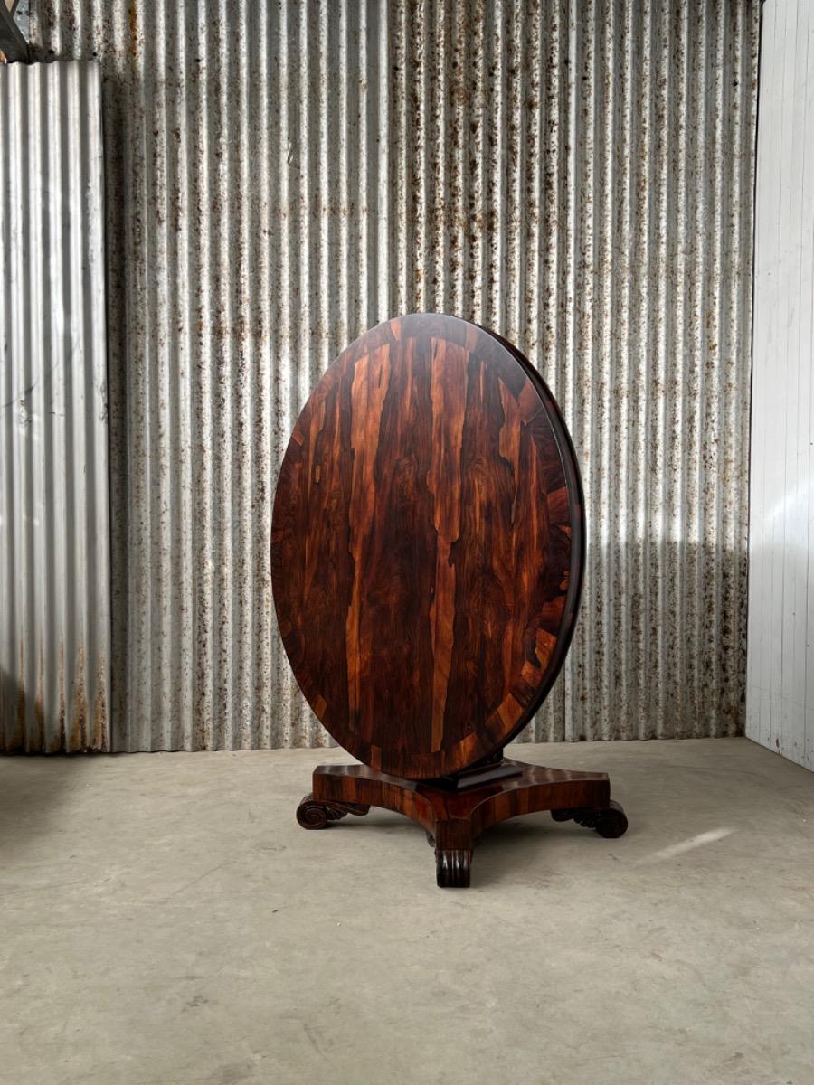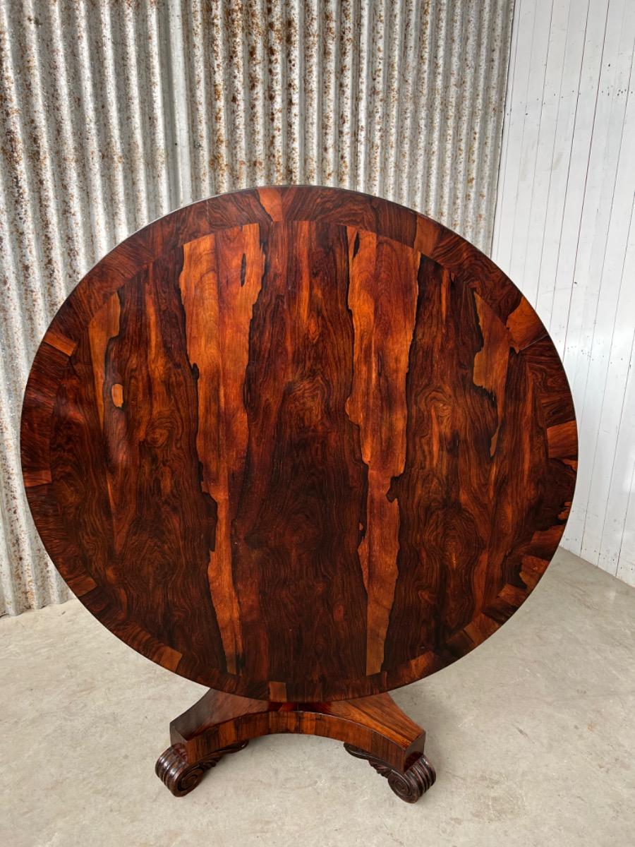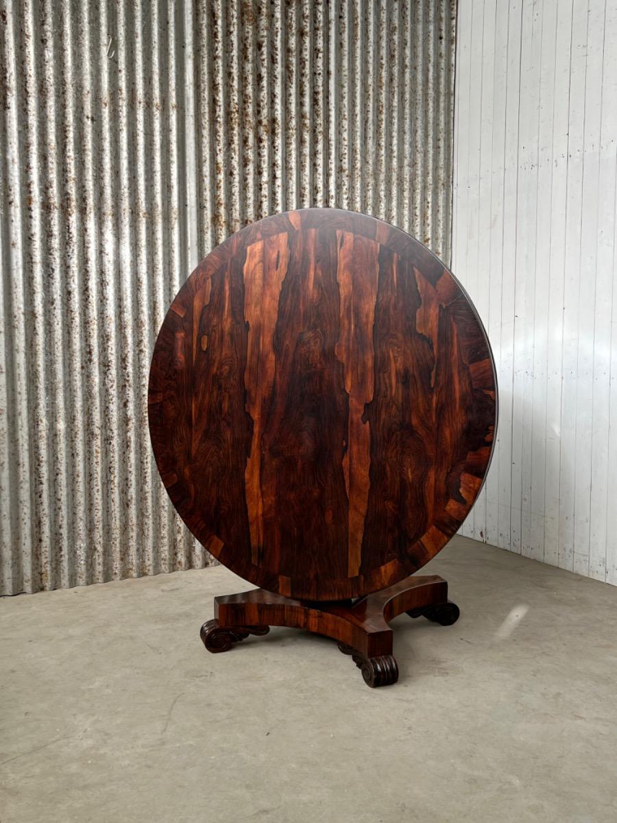 Engelse ‘tilttop’ table, palissander hout gefineerd blad (groot) met vierkantige centrale poot op vierspant. Gedecoreerd met gedetailleerd divers snij en steekwerk. Zeer fraaie was patina.