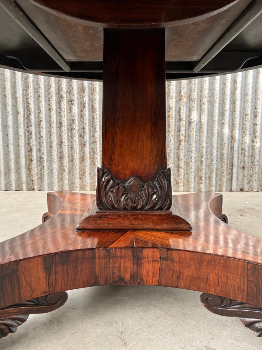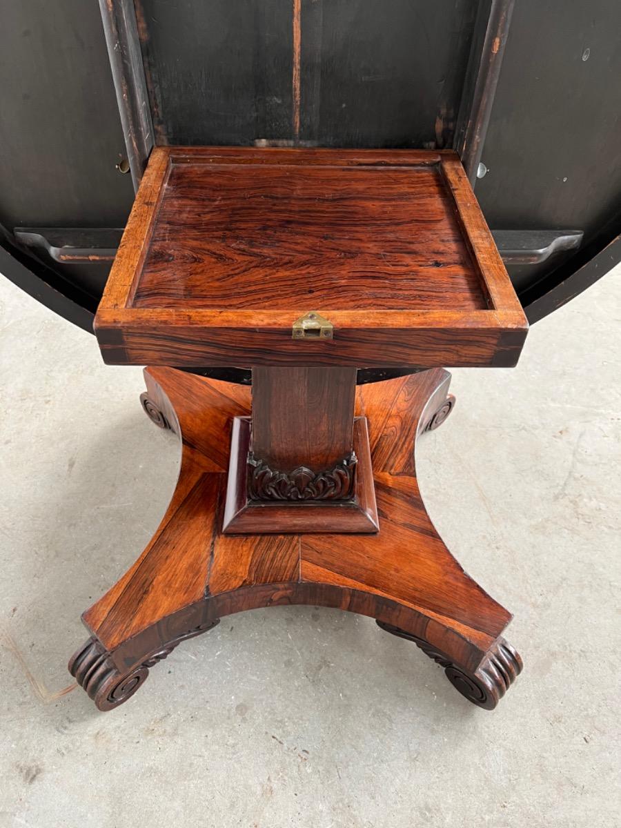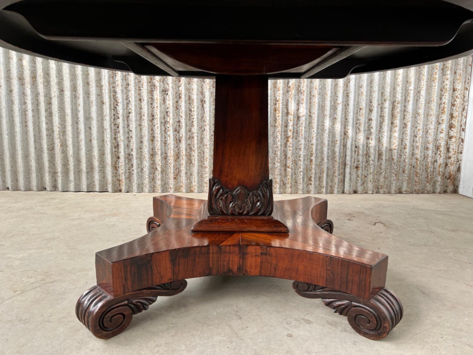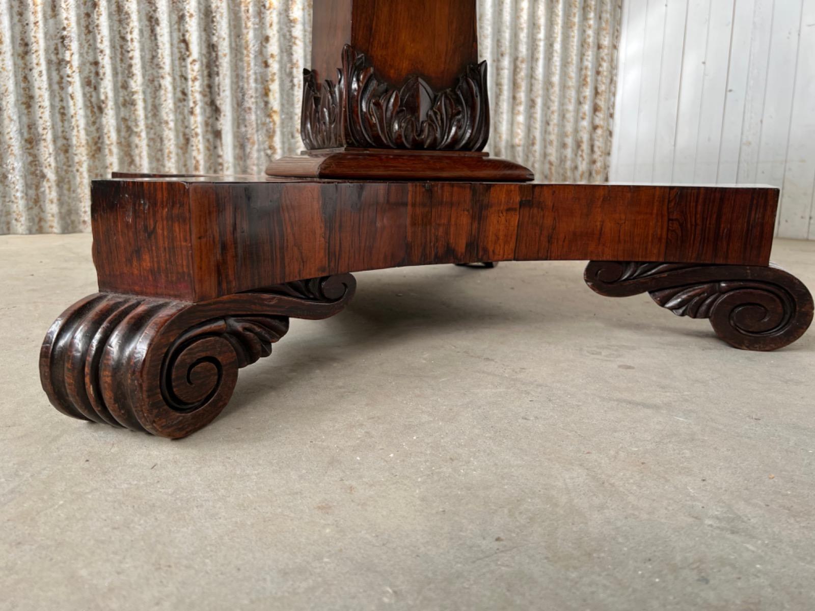 Engelse ‘tilttop’ table, palissander hout gefineerd blad (groot) met vierkantige centrale poot op vierspant. Gedecoreerd met gedetailleerd divers snij en steekwerk. Zeer fraaie was patina.