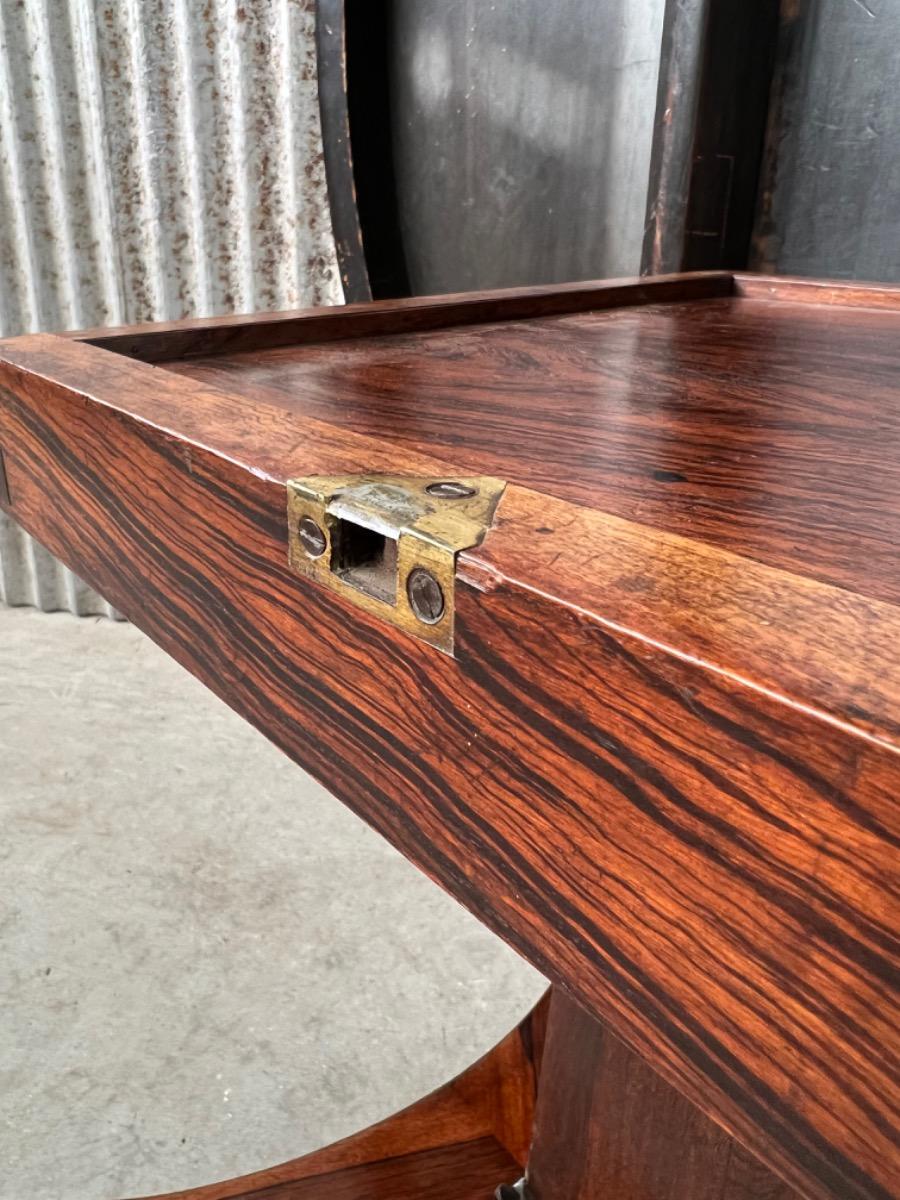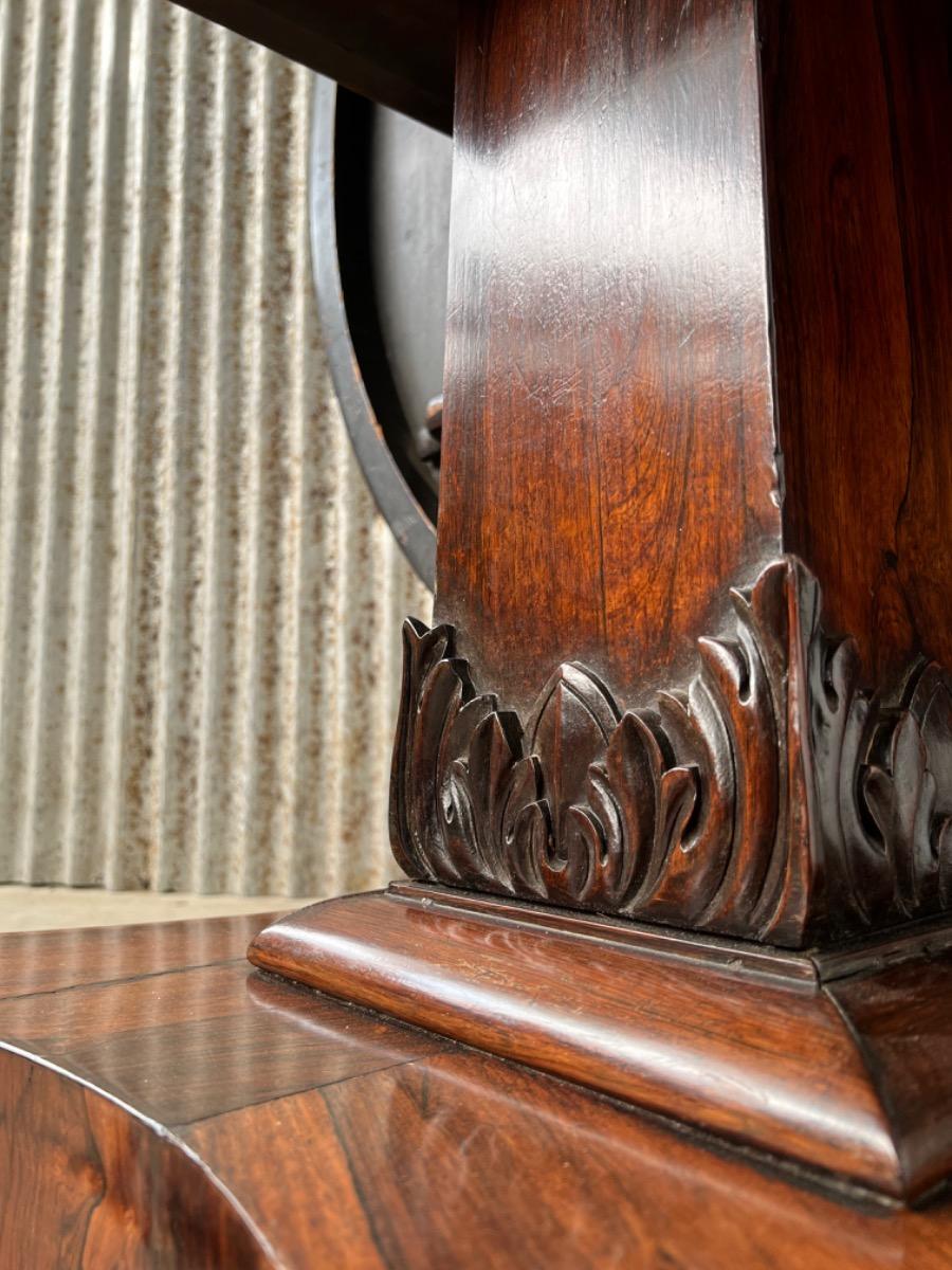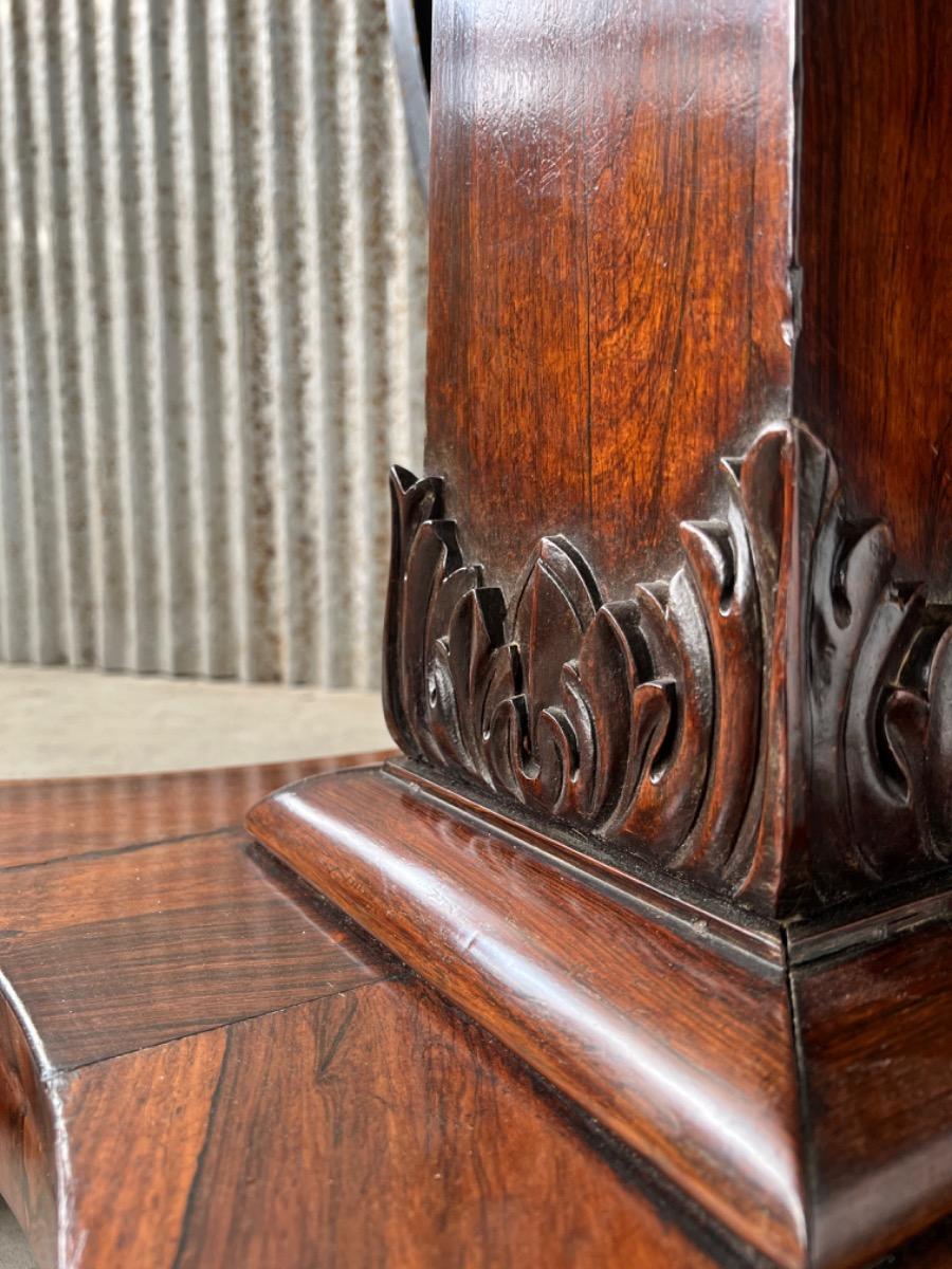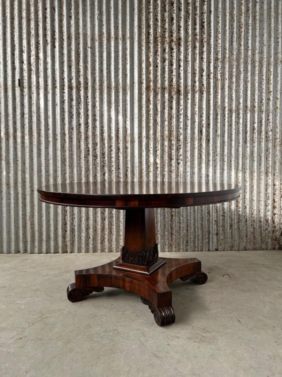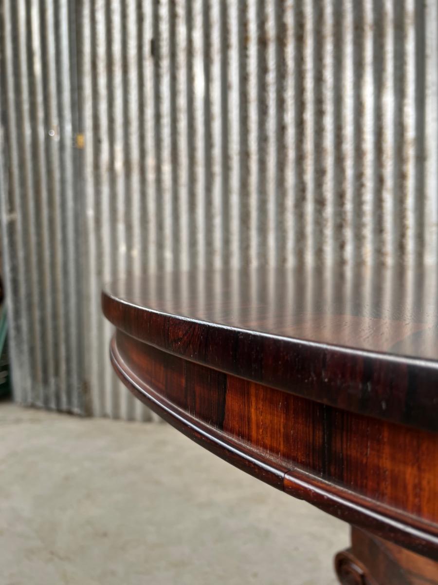 Engelse ‘tilttop’ table, palissander hout gefineerd blad (groot) met vierkantige centrale poot op vierspant. Gedecoreerd met gedetailleerd divers snij en steekwerk. Zeer fraaie was patina.