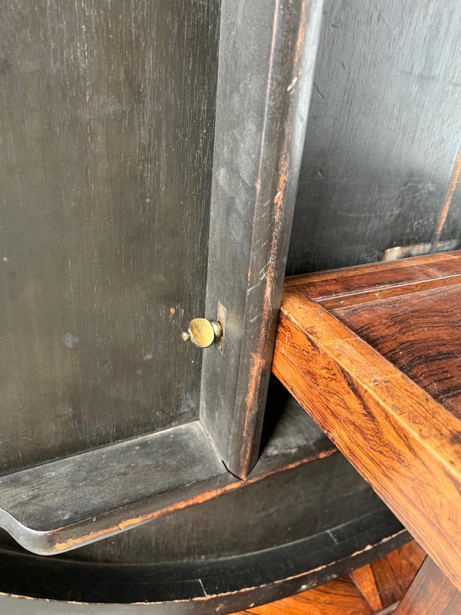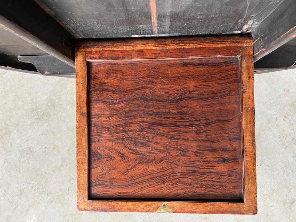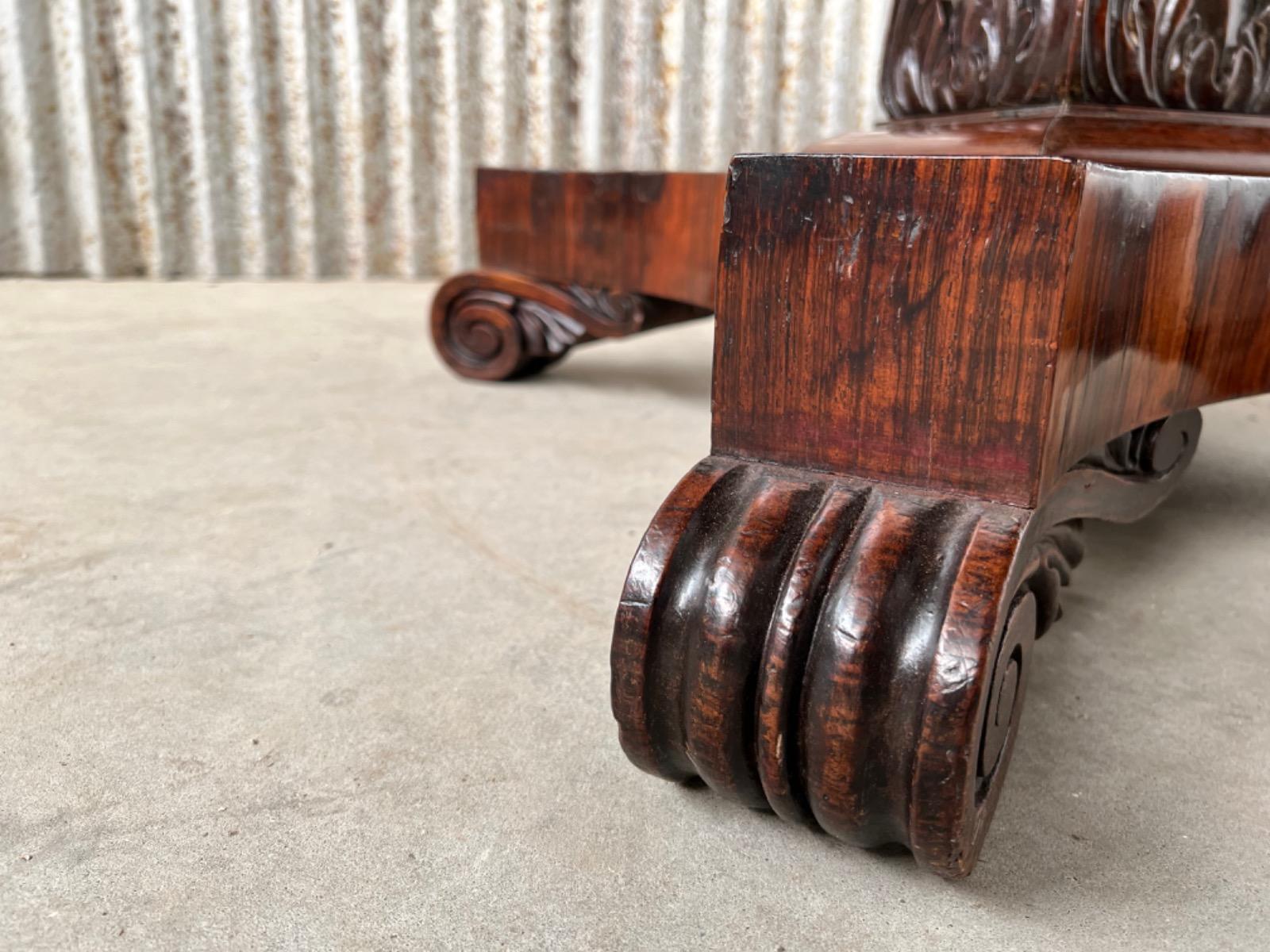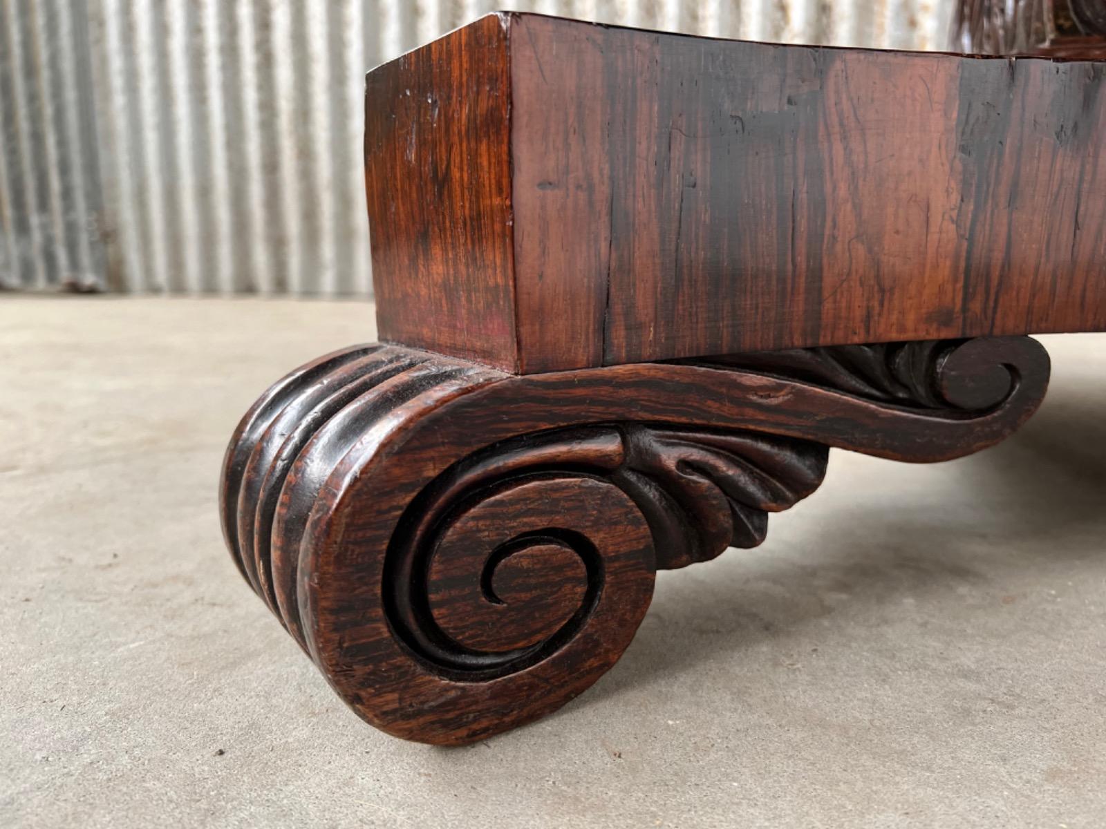Engelse ‘tilttop’ table, palissander hout gefineerd blad (groot) met vierkantige centrale poot op vierspant. Gedecoreerd met gedetailleerd divers snij en steekwerk. Zeer fraaie was patina.