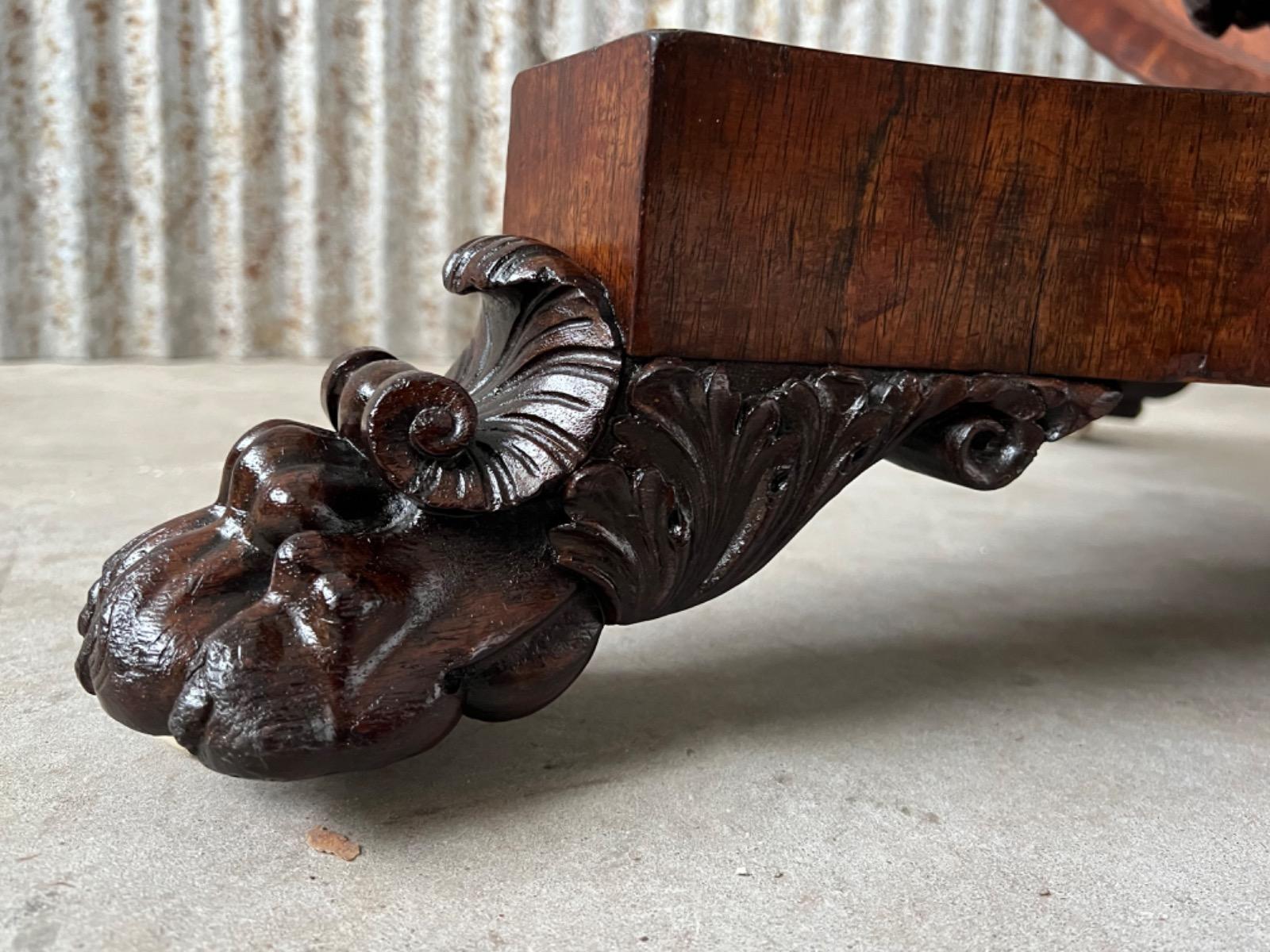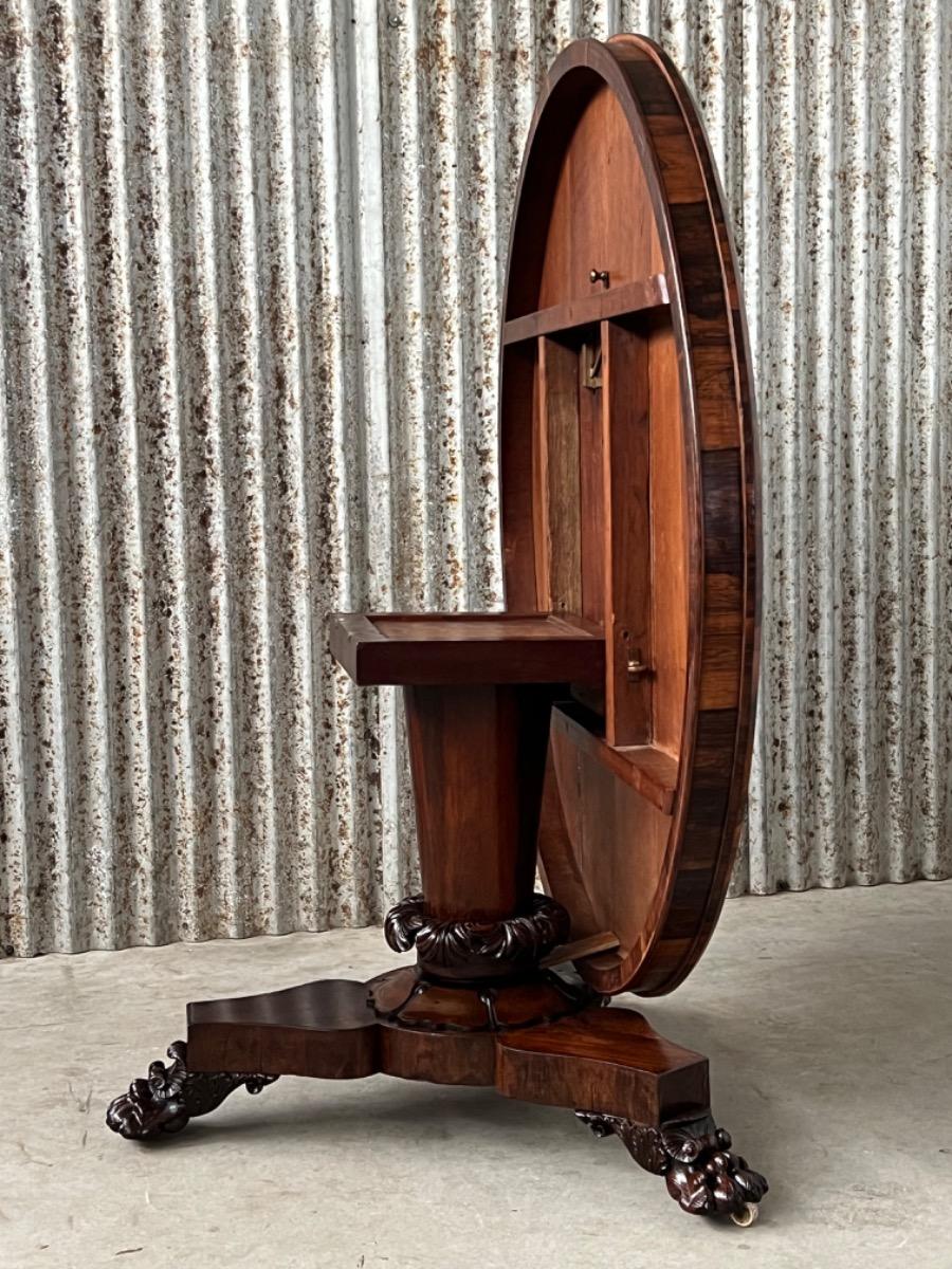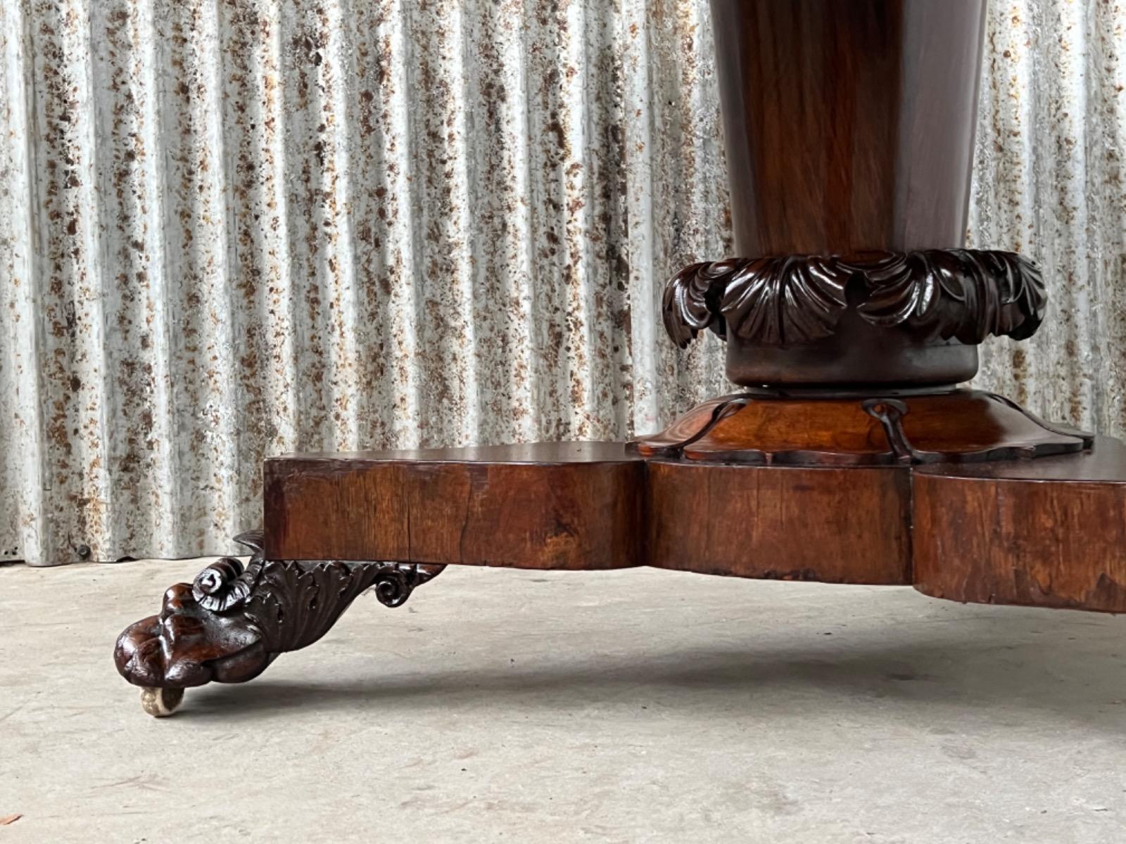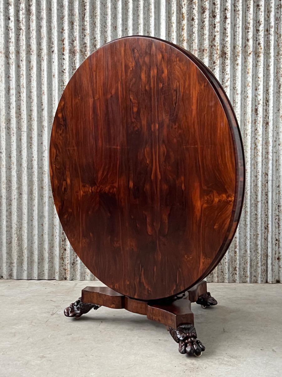 Engelse ‘tilttop’ table, palissander hout gefineerd rond blad (groot) met conische centrale poot op driespant. Gedecoreerd met gedetailleerd divers snij en steekwerk. Gedragen door harige klauwpoten op wieltjes. Zeer fraaie was patina.