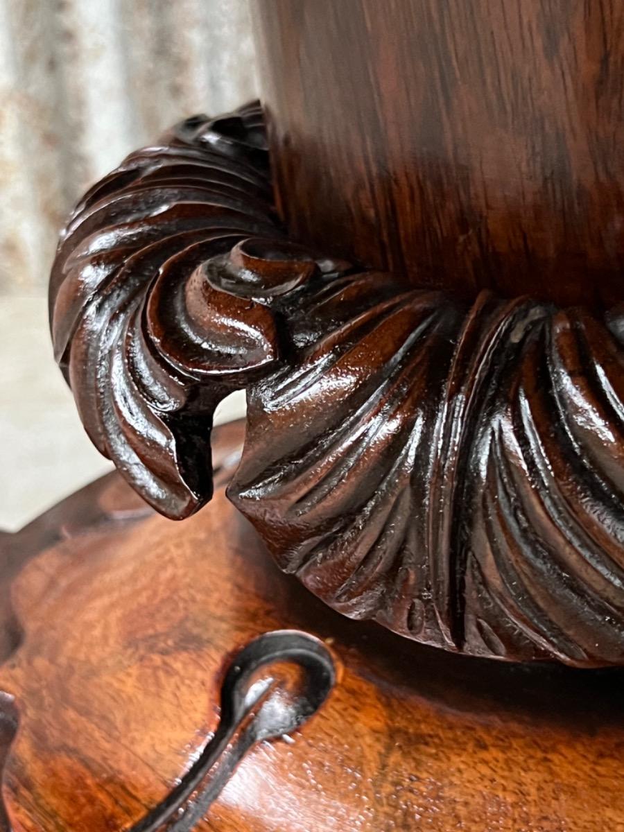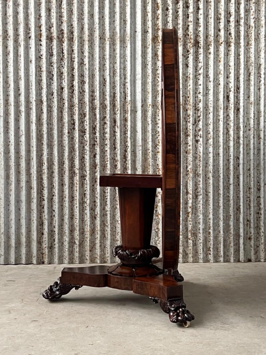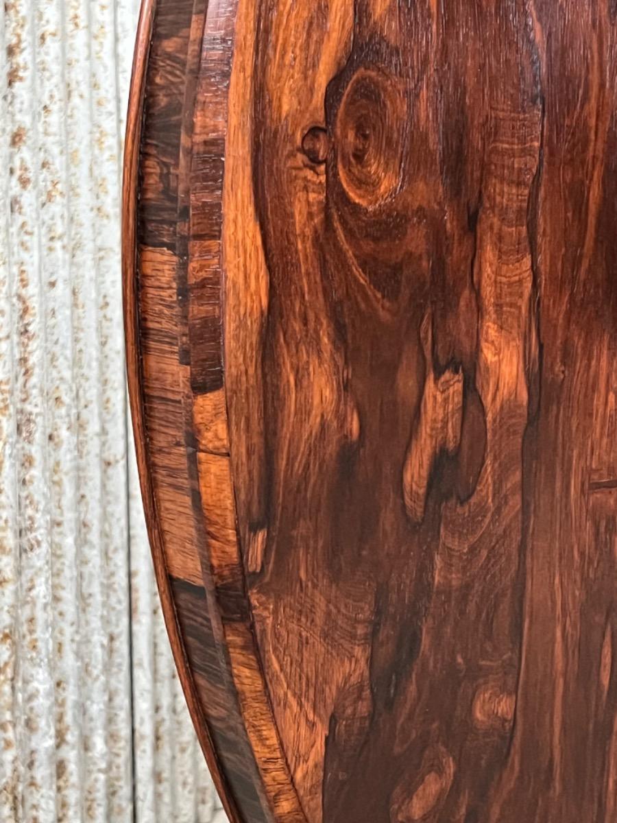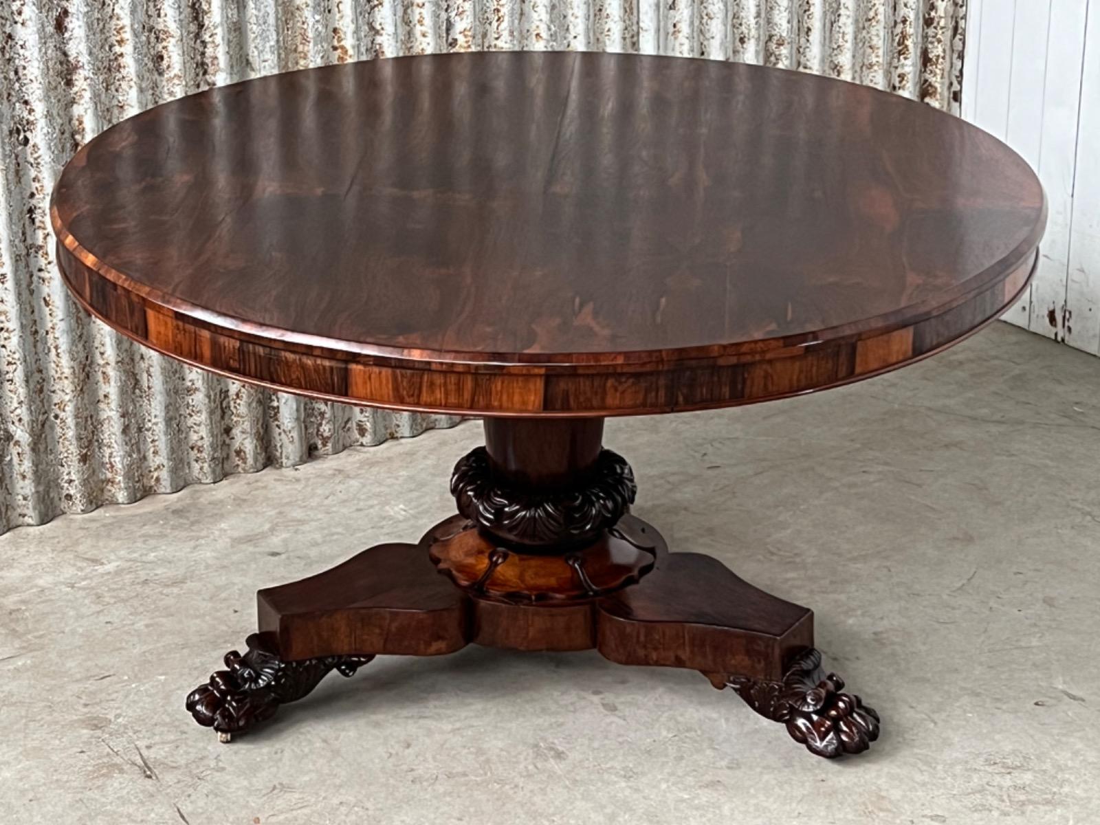 Engelse ‘tilttop’ table, palissander hout gefineerd rond blad (groot) met conische centrale poot op driespant. Gedecoreerd met gedetailleerd divers snij en steekwerk. Gedragen door harige klauwpoten op wieltjes. Zeer fraaie was patina.