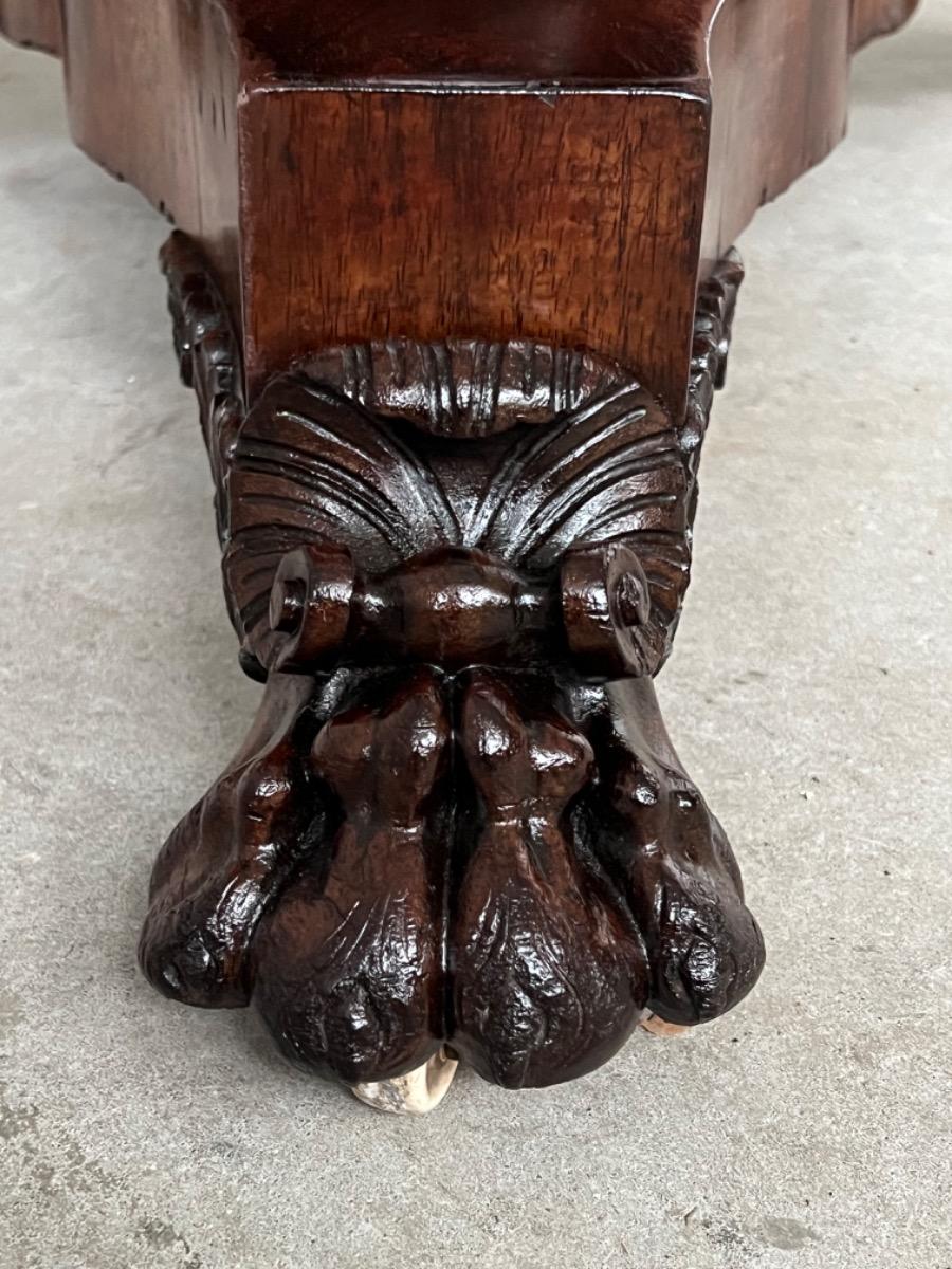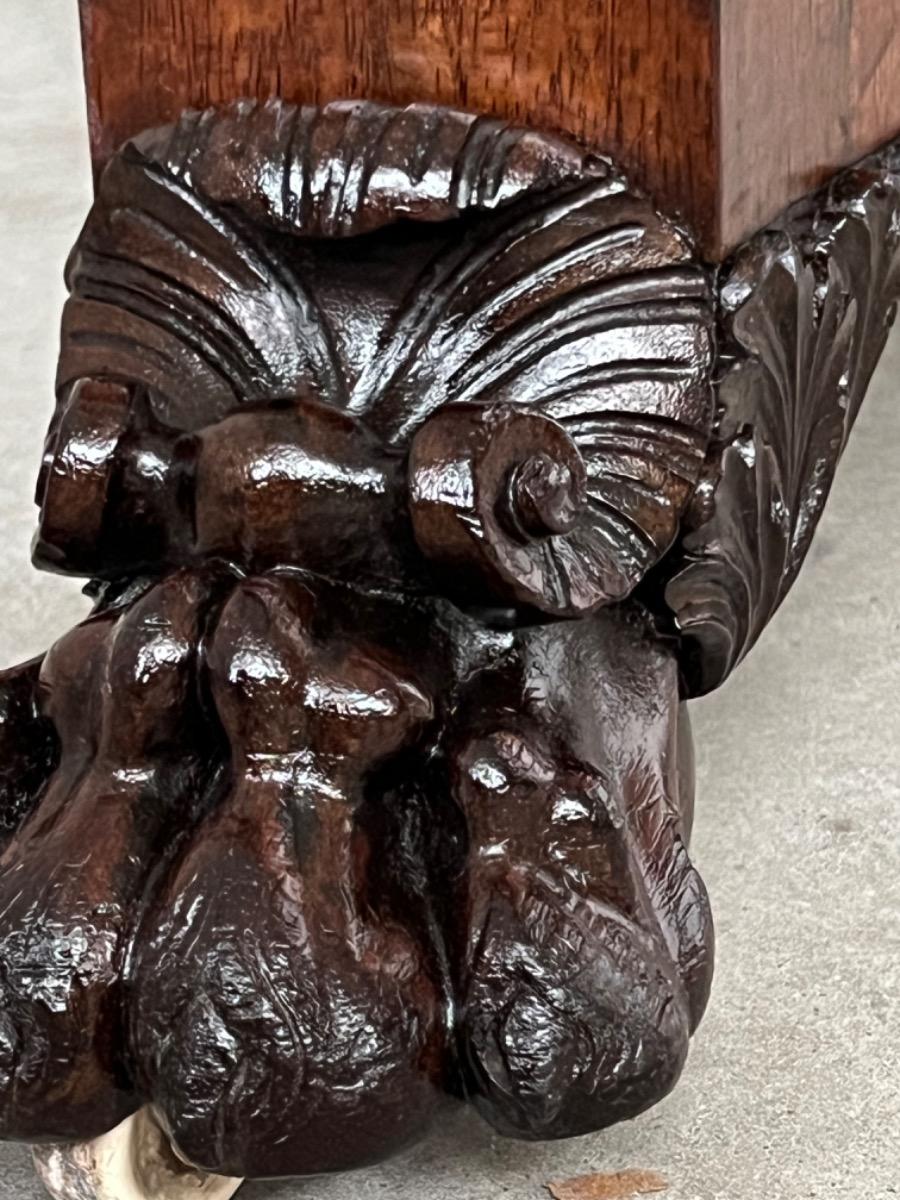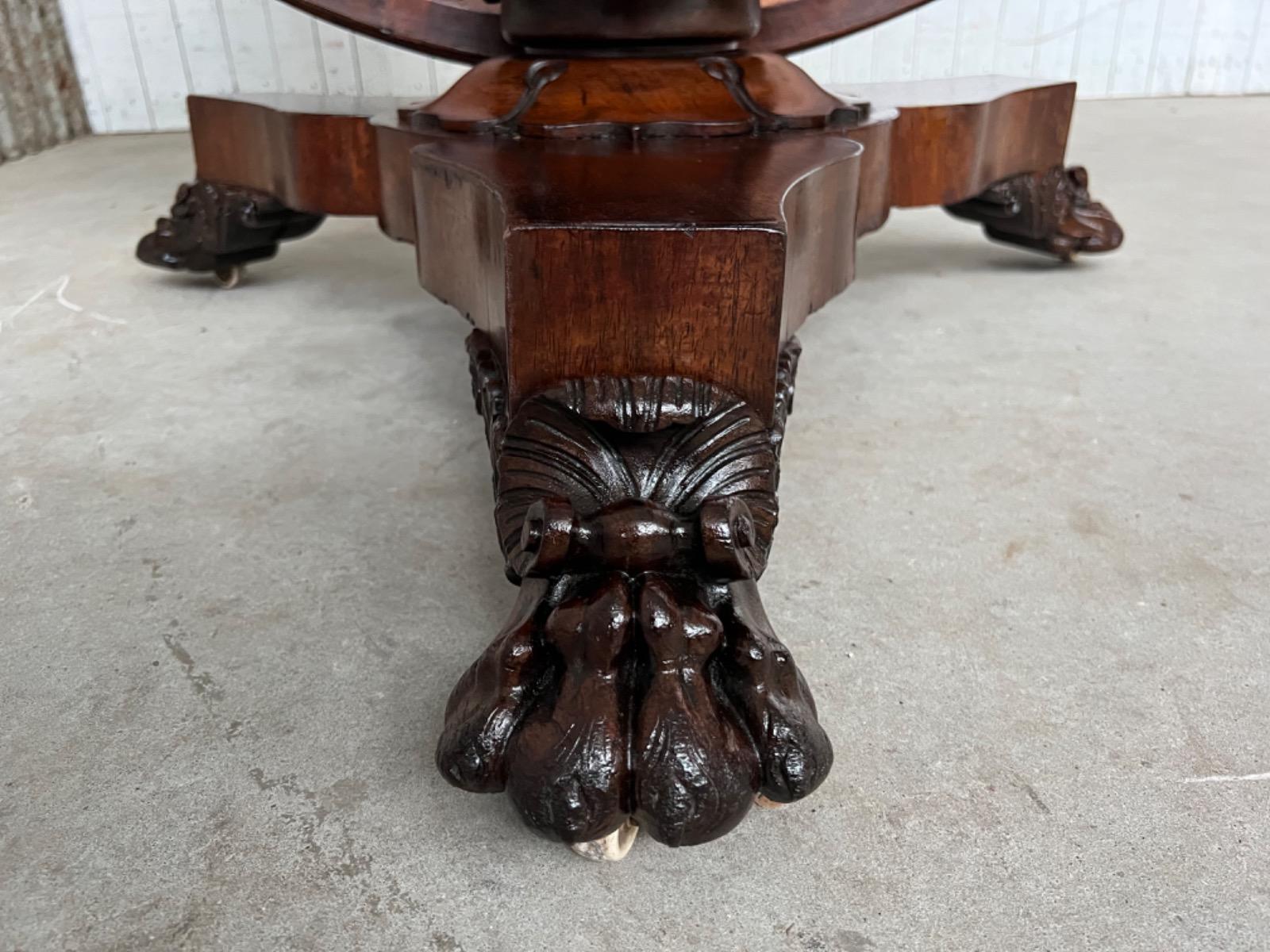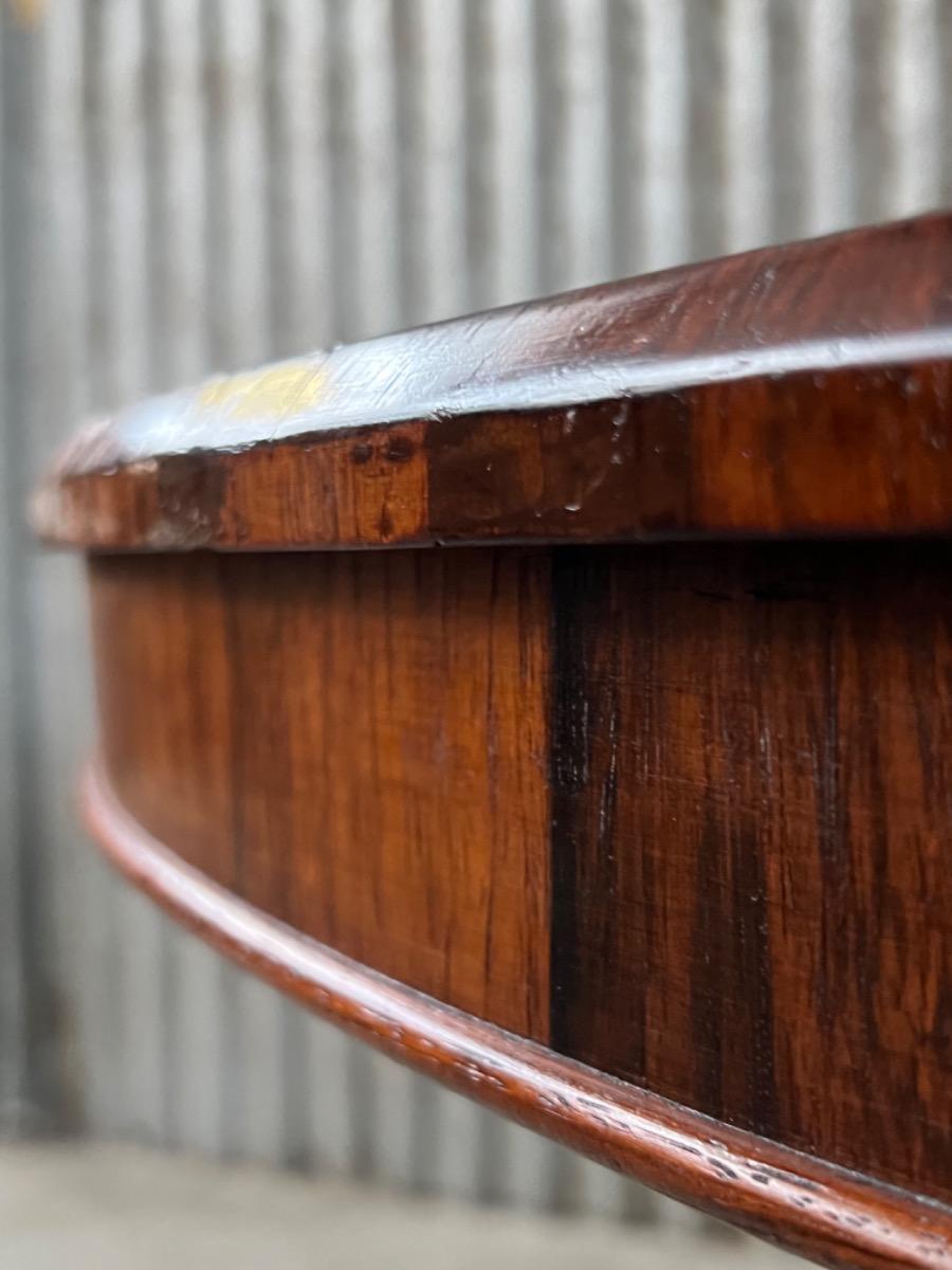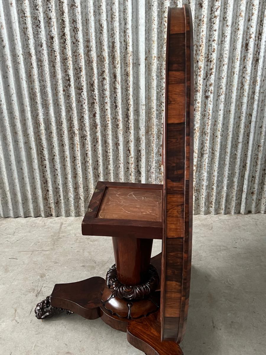 Engelse ‘tilttop’ table, palissander hout gefineerd rond blad (groot) met conische centrale poot op driespant. Gedecoreerd met gedetailleerd divers snij en steekwerk. Gedragen door harige klauwpoten op wieltjes. Zeer fraaie was patina.