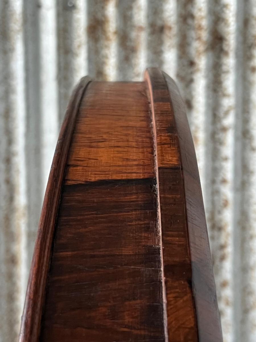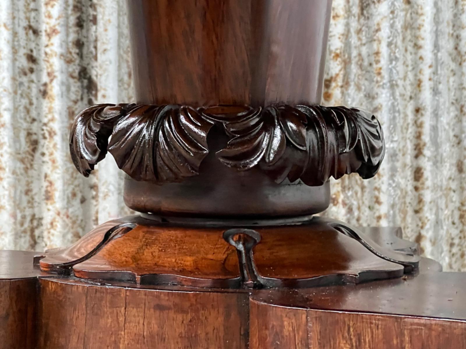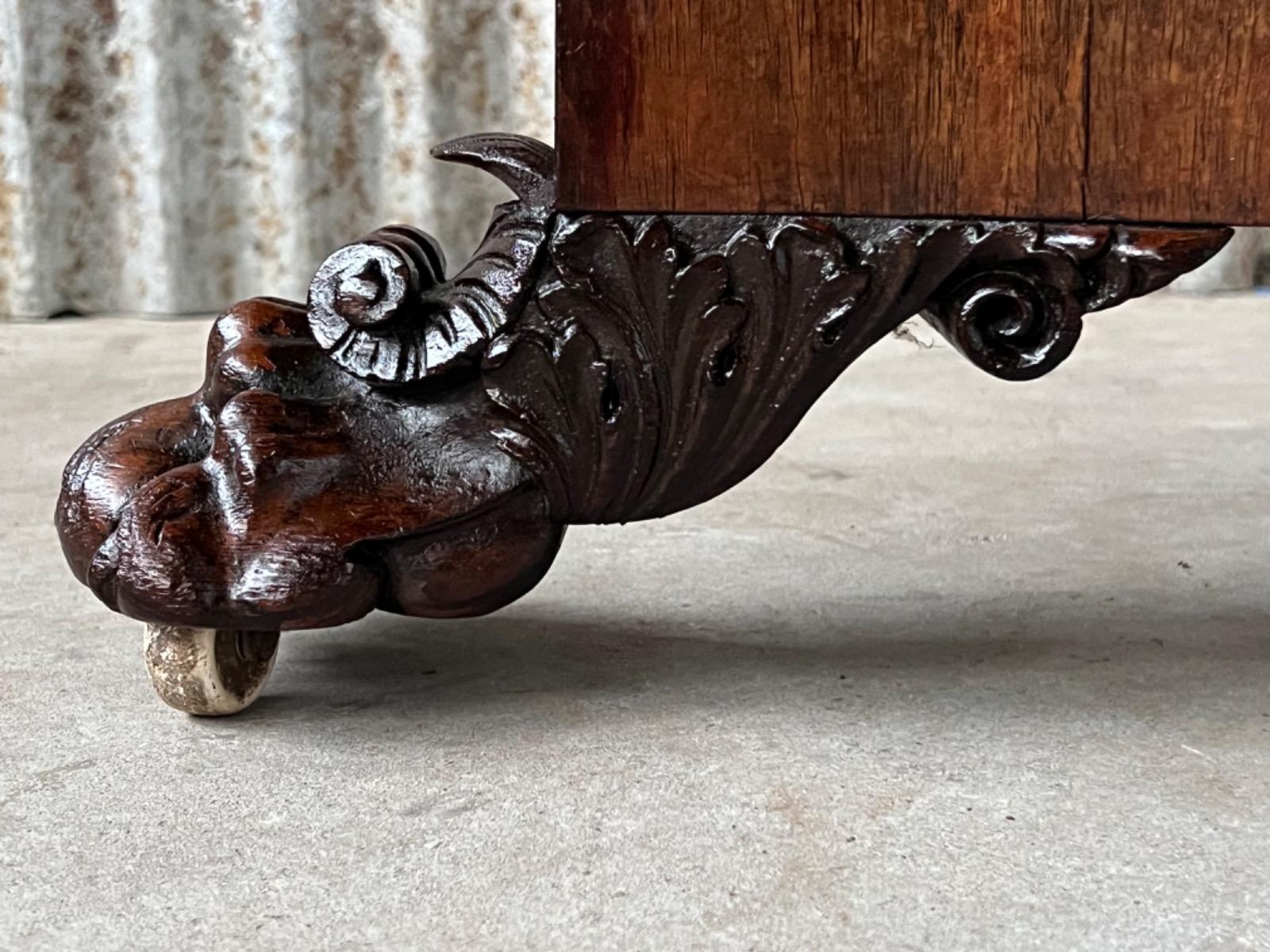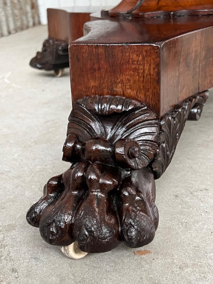 Engelse ‘tilttop’ table, palissander hout gefineerd rond blad (groot) met conische centrale poot op driespant. Gedecoreerd met gedetailleerd divers snij en steekwerk. Gedragen door harige klauwpoten op wieltjes. Zeer fraaie was patina.